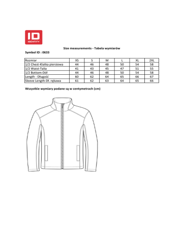 Size measurements - Tabela wymiarów Symbol ID : 0633 Rozmiar 1/2 Chest-Klatka piersiowa 1/2 Waist-Talia 1/2 Bottom-Dół Length - Długość Sleeve Length-Dł. rękawa XS 44 41 44 60 61 S 46 43 46 62 62 Wszystkie wymiary podane są w centymetrach (cm) M 48 45 48 64 63 L 50 47 50 65 64 XL 54 51 54 66 65 2XL 58 55 58 67 66