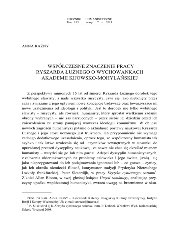 ROCZNIKI Tom LXI, ANNA RANY HUMANISTYCZNE zeszyt 7 – 2013 WSPÓCZESNE ZNACZENIE PRACY RYSZARDA UNEGO O WYCHOWANKACH AKADEMII KIJOWSKO-MOHYLA SKIEJ Z perspektywy minionych 15 lat od mierci Ryszarda unego dorobek tego wybitnego slawisty, a nade wszystko rusycysty, jawi si jako nietknity przez czas i zwizane z jego upywem nowe koncepcje badawcze oraz towarzyszce im nowe uzalenienia od ideologii i polityki. Jest to dorobek nie tylko wybitnego slawisty – rusycysty, ale równie humanisty, który sprosta wielkiemu zadaniu obrony wybranych – nie za narzuconych – przez siebie jej dziedzin przed ich zniewoleniem ze strony panujcej wówczas ideologii komunizmu. W obliczu nowych zagroe humanistyki pytanie o aktualno postawy naukowej Ryszarda unego i jego etosu uczonego jest truizmem. Ich przypomnienie nie wymaga adnego dodatkowego uzasadnienia, oprócz tego, e wspóczesny humanista tak szybko i tak atwo uzalenia si od czynników zewntrznych w stosunku do uprawianej przeze dyscypliny naukowej, e nawet nie chce si okrela mianem humanisty – wstydzi si go lub nim gardzi. Adepci dyscyplin humanistycznych, z zaoenia ukierunkowanych na problemy czowieka i jego wiata, jawi si jako nieprzygotowani do ich podejmowania ignoranci lub – co gorsza – cynicy, jak ich okrela niemiecki filozof, kontynuator tradycji Fryderyka Nietzschego i szkoy frankfurckiej, Peter Sloterdijk, w pracy Krytyka cynicznego rozumu1. Z kolei Allan Bloom, w swej gonej ksice Umys zamknity, analizujc przyczyny upadku wspóczesnej humanistyki, zwraca uwag na brzemienne w skut- PROF. DR HAB. ANNA RANY – Kierwonik Katedry Rosyjskiej Kultury Nowoytnej, Instytut Rosji i Europy Wschodniej UJ; e-mail: [email protected] 1 P. S l o t e r d i j k, Krytyka cynicznego rozumu, tum. P. Dehnel, Wrocaw: Wyd. Dolnolskiej Szkoy Wyszej 2008. 42 ANNA RANY kach jej dobrowolne upodrzdnienie w stosunku do nauk spoecznych i przyrodniczych2. Przyjmujc bowiem w pracy badawczej zasady tych nauk, odnoszcych kwestie epistemologii czy aksjologii do systemów bd procesów samych w sobie, humanici marginalizuj bezporednie powizania swoich bada z czowiekiem. Nie obejmujc w nich sensów i celów jego istnienia, rezygnuj z antropologicznego wymiaru humanistyki. Jednak nade wszystko wspóczeni humanici masowo uzaleniaj si od polityki i aktualnej globalnej ideologii. Zaleno t widz m.in. przedstawiciele neomarksizmu i wspóczesnej filozofii polityki – Michael Hardt i Antonio Negri, którzy w ksice Imperium rysuj nastanie postimperialnej epoki3. Jest to nowy, ponadnarodowy, zdecentralizowany ad, majcy nowoczesne cechy tytuowego imperium, reprezentowanego na forum wiatowym przez USA. Wspóczesne imperium przejawia si w globalizacji, posiadajcej trzy podstawowe wymiary: polityczny, ekonomiczny i kulturowy. Elity, m.in. uniwersyteckie, przyjy jako obowizujc ideologi globalizacji, której czci skadow jest polityczna poprawno. Ta ostatnia staa si fundamentem ideowym, legitymizujcym zaistnienie imperium. Przykadem jej oddziaywania na humanistyk jest koncepcja wielokulturowoci jako czynnika globalizujcego i unifikujcego kultury, co dla nowego porzdku wiatowego ma podstawowe znaczenie. Gdy dodamy do tego towarzyszce globalizmowi wszystkie nowe – izmy w kulturze i humanistyce, to zrodzi nam si pytanie, czy jest moliwy opór wobec ich dyktatu, czy te wrcz dyktatury, jak to ujmuje w tytule swojej ksiki Dyktatura relatywizmu Roberto de Mattei w odniesieniu do ideologii politycznej poprawnoci, przenikajcej wszystkie sfery wspóczesnego ycia4. My za pytamy: czy jest moliwy taki opór, jaki stawia wobec zagroenia ze strony marksizmu i komunizmu Ryszard uny? Czy jest moliwe wytyczenie linii obrony wspóczesnej humanistyki na wzór tej, któr on wypracowa i wskaza jako autor przesania Czy rusycystyka moe suy ewangelizacji?, skierowanego do polskich rusycystów w 1979 r. w podziemnym pimie katolickim „Spotkania”? Badacze spucizny R. unego eksponuj znaczenie nie tylko ideowopolityczne, ale równie antropologiczno-aksjologiczne tego przesania5. Grzegorz 2 A. B l o o m, Umys zamknity, tum. T. Biero , Pozna : Wyd. Zysk i S-ka 2012. Tum S. lusarski, A. Kobaniuk, Warszawa: Wyd. WAB, 2005. 4 Tum. P. Toboa-Pertkiewicz, E. Turli ska, Warszawa: Prohibita 2009. 5 Por. m.in.: L. S u c h a n e k, R. uny (1927-1998), [w:] Uniwersytet Jagielloski. Zota ksiga Wydziau Filologicznego, red. J. Michalik, W Walecki; Kraków 2000, G. P r z e b i n d a, Filolog wobec sowa. W siedemdziesiciolecie urodzin Profesora Ryszarda unego, [w:] Sowianie 3 WSPÓCZESNE ZNACZENIE PRACY RYSZARDA UNEGO 43 Przebinda zwraca uwag na podjt w nim prób otwarcia polskiej rusycystyki ko ca lat 70. ubiegego wieku na metafizyczno-religijny, chrzecija ski wymiar badanej kultury, obecny od pocztku w dorobku autora. Odnoszc si do dyskusji na temat polskiej rusycystyki, jaka miaa miejsce w latach 1973-1974 na amach partyjnego pisma „Nowe Drogi”, Ryszard uny twierdzi, e polska nauka o literaturze i kulturze duchowej Rosjan nie moe istnie jako narzdzie ateistycznej ideologii. Autor wyranie odróni „rusycystyk” od „sowietyzacji” – w latach osiemdziesitych ta dystynkcja staa si ju czym ródowym i fundamentalnym, ale jeszcze pod koniec lat siedemdziesitych naleao si gono o ni upomina. To wanie uczyni prof. uny, piszc ponadto, e uczciwe zajmowanie si rusycystyk „moe suy ewangelizacji”, przede wszystkim z tego powodu, i sam obiekt badania jest gboko zakorzeniony w chrzecija stwie”6. Aktualno tej propozycji w drugim dziesicioleciu XXI wieku nie zmalaa. Przeciwnie, przybraa na znaczeniu wobec dominacji zachodnich trendów metodologicznych i ideowych w polskich badaniach rosjoznawczych i rusycystycznych, marginalizujcych powrót rosyjskiej kultury do chrzecija skich korzeni. Z perspektywy zwizanego z tym powrotem historycznego wydarzenia – jakim by apel o pojednanie narodów polskiego i rosyjskiego, podpisany 17 sierpnia 2012 roku przez przewodniczcego Konferencji Episkopatu Polski ks. arcybiskupa Józefa Michali