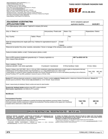 MIĘDZYNARODOWE TARGI POZNAŃSKIE sp. z o. o. POZNAŃ INTERNATIONAL FAIR Ltd. ul. Głogowska 14, 60-734 Poznań, Poland tel. +48 /61/ 869 2285, fax: +48 /61/ 869 2957 Konto / Bank account: Bank Handlowy w Warszawie S.A. o/Poznań Nr konta: 37 103012470000000055861201 IBAN: PL 66103012470000000055861358, SWIFT: CITIPLPX Płatnik VAT czynny / Active VAT Payer, NIP / Tax ID: 777-00-00-488 Sąd Rejonowy Poznań – Nowe Miasto i Wilda w Poznaniu / Poznan District Court VIII Wydział Gospodarczy Krajowego Rejestru Sądowego / 8th Division of National Court Register KRS / National Court Register number: 0000202703 Kapitał zakładowy / Share capital: 42 310 200,00 PLN TARGI MODY POZNAŃ FASHION FAIR 29-31.08.2011 ZGŁOSZENIE UCZESTNICTWA APPLICATION FORM termin nadsyłania zgłoszeń application deadline 24.05.2011 Firma Zgłaszającego (pełna nazwa) / Applicant’s company (full name): Ulica, nr / Street, no.: Kraj / Country: Kod pocztowy / Postal code: Miasto / City: Telefon / Phone: Województwo / District: Fax: Adres do korespondencji dot. targów (jeśli inny) / Address for organizational issues (if different): E-mail: Internet: Właściciel lub dyrektor firmy (imię i nazwisko, stanowisko) / Owner or manager of the company (name, position): Osoba do kontaktu (telefon, e-mail) / Contact person (phone, e-mail): Wpis do KRS (ewidencji działalności gospodarczej) nr / Company registration no: Data i miejsce/ Date and place: Dane o wystawcy / We are: (właściwe zakreślić / mark where applicable) NIP/ Tax ID/EU VAT ID: producent / manufacturer firma handlowa / trader inne / others Zgodnie z Ustawą z dnia 18.07.2002 r. (Dz.U. nr 144, poz.1204) o świadczeniu usług drogą elektroniczną, wyraŜam zgodę na otrzymywanie informacji marketingowych od firmy Międzynarodowe Targi Poznańskie sp. z o.o. drogą elektroniczną na ww. adres e-mail/ I hereby declare my consent to receive marketing information from Poznan International Fair Ltd. on a/m e-mail address (according to Act on Electronic Service Providing of 18th July 2002, published in Journal of Laws no 144 item 1204). TAK / YES NIE / NO BranŜa (MTP lokalizują ekspozycje wystawców w układzie branŜowym. Prosimy o podanie wyłącznie 1 branŜy zgodnie z załączonym ZakresemTematycznym) / Branch (PIF allocates space by branches. Please indicate only one branch acc. to the Thematic Scope enclosed) Numer i nazwa branŜy do lokalizacji / Branch number and name for stand location: śyczenia dot. lokalizacji stoiska spełniane przez MTP w miarę moŜliwości: Stand location requirements to be fulfilled by PIF if possibile: Marki/Brands: Franczyzodawca/ Franchise Stoiska wystawców oferujących współpracę na zasadzie franchisingu będą dodatkowo oznaczone hasłem „Franchising”. Informacja ta będzie równieŜ umieszczona w folderach dla handlowców/ Franchise exhibitors will be signed with „Franchising” inscription both on stand and in a folder for traders TAK/ YES NIE/ NO OPŁATA REJESTRACYJNA / REGISTRATION FEE – 500 PLN netto * PODPISUJĄC NINIEJSZE ZGŁOSZENIE UCZESTNICTWA AKCEPTUJEMY JAKO OBOWIĄZUJACE NAS: REGULAMIN DLA UCZESTNIKÓW TARGÓW, PRZEPISY TECHNICZNE I PRZECIWPOśAROWE, POSTANOWIENIA SZCZEGÓŁOWE ORAZ WARUNKI UCZESTNICTWA. ** * Opłata / cena netto nie uwzględnia podatku od towarów i usług. Podatek ten zostanie doliczony przy fakturowaniu w przypadkach określonych w obowiązujących przepisach ** REGULAMIN, PRZEPIS, POSTANOWIENIA i WARUNKI są dostępne na stronie internetowej www.targimodypoznan.pl. Na Ŝyczenie zostaną wysłane drogą pocztową. BTS BY SIGNING THE PRESENT APPLICATION FORM WE DECLARE TO COMPLY WITH THE FOLLOWING: REGULATIONS FOR PARTICIPANTS OF FAIR, TECHNICAL AND FIRE SAFETY REGULATIONS, SPECIFIC PROVISIONS and TERMS OF THE FAIR PARTICIPATION. ** * NET prices do not include VAT. The value added tax will be included in the invoice if applicable. ** REGULATIONS, PROVISIONS and TERMS are available on the website www.targimodypoznan.pl/en on request regulations, provisions and terms will be send by post FORMULARZ / FORM A1 str./page 1/2 ZAMÓWIENIE – OPCJE / THE ORDER – OPTIONS Zgłaszamy uczestnictwo w targach i zamawiamy następujący pakiet: / We apply for a participation in a fair an we order the package as follows: A) POWIERZCHNIA NIEZABUDOWANA/ SPACE LEASE WITHOUT BOOTH najem powierzchni wystawienniczej stała karta wjazdu Niezabudowana, w pawilonie, parter/ Indoors, ground floor (without a booth) Układ szeregowy * Row arrangement * Układ naroŜny * Corner arrangement * Układ półwyspowy ** 3 sides-open arrangement ** Układ wyspowy *** 4 sides-open arrangement *** space lease car entry card Cena netto* najmu w PLN / 1m2 Unit net price* in PLN / 1 m2 Zamawiana powierzchnia/ Space required 170 ……… m2 190 ……… m2 200 ……… m2 210 ……… m2 Minimalna powierzchnia / Minimum space: * 6 m2 , ** 30 m2, *** 50 m2. B) EKSPOZYCJA NA STOŁACH/ EXHIBITION ON TABLES najem powierzchni wystawienniczej podstawowe wyposaŜenie wg projektu MTP (wykładzina, stoły, 2 krzesła, kosz, oświetlenie, przyłącze prądu) stała karta wjazdu space lease basic equipment according to PIF’s design (carpet, tables, 2 chairs, dust bin, lightning, electricity) car entry card Ilość stołów 120x45/ quantity of tables 120x45 Cena netto* w PLN/ Net price* in PLN 5 m2 7 700 6 m2 9 875 7 m2 11 1050 8 m2 13 1225 9 m2 15 1400 Moduł o powierzchni/ Package Zamawiany pakiet / Package required C) PAKIET: POWIERZCHNIA I ZABUDOWA STANDARDOWA/ SPACE AND BASIC STAND BOOTH PACKAGE najem powierzchni wystawienniczej podstawowa obudowa wg projektu MTP (obudowa stoiska – kolor biały, konstrukcja stoiska – kolor aluminium, wykładzina, napis na fryzie, lada, hoker, stół, krzesła, półki, instalacja elektryczna: oświetlenie - 1 lampa na 2m2, gniazdo elektryczne – 1 szt., zaplecze z drzwiami harmonijkowymi, kosz, wieszak, szafka) stała karta wjazdu Powierzchnia stoiska / Stand’s type and s