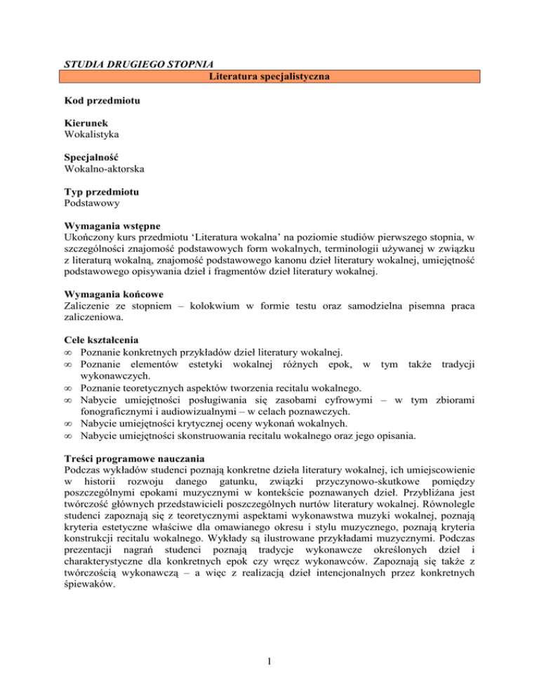 STUDIA DRUGIEGO STOPNIA Literatura specjalistyczna Kod przedmiotu Kierunek Wokalistyka Specjalność Wokalno-aktorska Typ przedmiotu Podstawowy Wymagania wstępne Ukończony kurs przedmiotu ‘Literatura wokalna’ na poziomie studiów pierwszego stopnia, w szczególności znajomość podstawowych form wokalnych, terminologii używanej w związku z literaturą wokalną, znajomość podstawowego kanonu dzieł literatury wokalnej, umiejętność podstawowego opisywania dzieł i fragmentów dzieł literatury wokalnej. Wymagania końcowe Zaliczenie ze stopniem – kolokwium w formie testu oraz samodzielna pisemna praca zaliczeniowa. Cele kształcenia • Poznanie konkretnych przykładów dzieł literatury wokalnej. • Poznanie elementów estetyki wokalnej różnych epok, w tym także tradycji wykonawczych. • Poznanie teoretycznych aspektów tworzenia recitalu wokalnego. • Nabycie umiejętności posługiwania się zasobami cyfrowymi – w tym zbiorami fonograficznymi i audiowizualnymi – w celach poznawczych. • Nabycie umiejętności krytycznej oceny wykonań wokalnych. • Nabycie umiejętności skonstruowania recitalu wokalnego oraz jego opisania. Treści programowe nauczania Podczas wykładów studenci poznają konkretne dzieła literatury wokalnej, ich umiejscowienie w historii rozwoju danego gatunku, związki przyczynowo-skutkowe pomiędzy poszczególnymi epokami muzycznymi w kontekście poznawanych dzieł. Przybliżana jest twórczość głównych przedstawicieli poszczególnych nurtów literatury wokalnej. Równolegle studenci zapoznają się z teoretycznymi aspektami wykonawstwa muzyki wokalnej, poznają kryteria estetyczne właściwe dla omawianego okresu i stylu muzycznego, poznają kryteria konstrukcji recitalu wokalnego. Wykłady są ilustrowane przykładami muzycznymi. Podczas prezentacji nagrań studenci poznają tradycje wykonawcze określonych dzieł i charakterystyczne dla konkretnych epok czy wręcz wykonawców. Zapoznają się także z twórczością wykonawczą – a więc z realizacją dzieł intencjonalnych przez konkretnych śpiewaków. 1 Efekty kształcenia (uczenia się) po ukończeniu przedmiotu - w zakresie wiedzy • Posiada gruntowną znajomość ogólnego repertuaru z zakresu literatury wokalnej i związanych z nim tradycji wykonawczych – w szczególności: zna sposoby podziału literatury wokalnej, zna konkretne przykłady dzieł literatury wokalnej z każdej z omawianych grup literatury, zna tradycje wykonawcze związane z określonymi dziełami w kontekście szkół wokalnych, ze szczególnym uwzględnieniem okresu tzw. drugiego belcanta (K2_W01). • Posiada szczegółową wiedzę dotyczącą repertuaru wybranej specjalności oraz posiadać wiedzę dotyczącą związanego z nią piśmiennictwa– w szczególności zna dzieła operowe, operetkowe i oratoryjne wybranych kompozytorów, zna twórczość pieśniarską wybranych kompozytorów, zna podstawową bibliografię przedmiotową związaną z literaturą wokalną (K2_W02). • Posiada wiedzę dotyczącą warsztatu badań teoretycznonaukowych; posiada umiejętność sprawnego korzystania ze źródeł informacji, zna sposoby analizowania i syntezy danych oraz prawidłowego ich interpretowania – w szczególności: zna sposoby tworzenia kwerend bibliotecznych, zna zasoby cyfrowe dotyczące literatury wokalnej (K2_W04). • Posiada wiedzę dotyczącą swobodnego korzystania z różnorodnych mediów (książki, nagrania, materiały nutowe, internet, nagrania archiwalne itp.) oraz umiejętność samodzielnego poszerzania i rozwijania wiedzy dotyczącej swej specjalności – w szczególności wie w jaki sposób korzystać z rejestracji fonograficznych w celach poznawczych dzieł literatury wokalnej (K2_W05). - w zakresie umiejętności • Posiada umiejętność tworzenia rozbudowanych prezentacji w formie słownej i pisemnej (także o charakterze multimedialnym) na tematy dotyczące zarówno własnej specjalizacji, jak i szerokiej problematyki z obszaru sztuki, wykazując zdolność formułowania własnych sądów i wyciągania trafnych wniosków – w szczególności: umie samodzielnie opisać recital wokalny na zadany temat w kontekście jego układu (K2_U13). - w zakresie kompetencji społecznych • Potrafi być w pełni kompetentnym i samodzielnym artystą, zdolnym do świadomego integrowania zdobytej wiedzy w obrębie specjalności oraz w ramach innych szeroko pojętych działań kulturotwórczych – w szczególności: potrafi skonstruować, łącząc wiedzę z różnych dziedzin w zakresie wokalistyki, zgodnie z omawianymi na zajęciach zasadami, recital wokalny na różne okazje (K2_K01). Metody nauczania Wykład prowadzony raz na dwa tygodnie w wymiarze dwóch godzin lekcyjnych z wykorzystaniem ilustracyjnych materiałów audio-wizualnych oraz technik prezentacyjnych. Niektóre zajęcia prowadzone w trybie seminaryjnym – tzn. wykład z aktywnym udziałem studentów. 2 Nakład pracy studenta potrzebny do osiągnięcia efektów uczenia się ROK SEMESTR Punkty ECTS Ilość godzin w semestrze Rodzaj zaliczenia LEGENDA I II 1 2 1 1 15 15 zs zs 3 4 zal – zaliczony; zs – zaliczenie ze stopniem; egz – egzamin; ed – egzamin dyplomowy Kryteria oceny Na ocenę uzyskiwaną po 1. semestrze składa się ocena aktywności studenta na zajęciach oraz ocena pracy zaliczeniowej, którą stanowi opis partii operowej dokonany w oparciu o materiał wykładowy. Na ocenę uzyskiwaną po 2. semestrze składa się ocena aktywności studenta na zajęciach, ocena z kolokwium sprawdzającego nabytą wiedzę oraz ocena z pracy zaliczeniowej w postaci opisu recitalu wokalnego na zadany temat ułożonego zgodnie z kryteriami omawianymi podczas wykładów. Literatura (piśmiennictwo) Adrjański, Zbigniew: Złota księga pieśni polskich, DW Bellona, Warszawa 2002 Alszwang, Arnold: Czajkowski, PWM, Kraków 1979 Ancz ykowska-W ysocka, Wiesława: Poznawcza rola literatury wokalnej w kształceniu muzycznym wokalistów