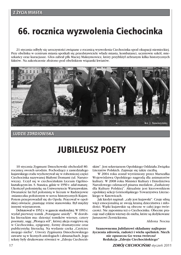 Z ˚YCIA MIASTA 66. rocznica wyzwolenia Ciechocinka 21 stycznia odby∏y si´ uroczystoÊci zwiàzane z rocznicà wyzwolenia Ciechocinka spod okupacji niemieckiej. Przy obelisku w centrum miasta spotkali si´ przedstawiciele w∏adz miasta, kombatanci, uczniowie szkól, mieszkaƒcy oraz kuracjusze. G∏os zabra∏ p∏k Maciej Maksymowicz, który przybli˝y∏ zebranym kilka historycznych faktów. Na zakoƒczenie z∏o˝ono pod obeliskiem wiàzanki kwiatów. fot. J. Stawiszyƒska LUDZIE ZDROJOWISKA JUBILEUSZ POETY 10 stycznia Zygmunt Dmochowski obchodzi∏ 80. rocznic´ swoich urodzin. Pochodzàcy z zasiedzia∏ego kujawskiego rodu wychowywa∏ si´ w robotniczej cz´Êci Ciechocinka nazywanej Bia∏ymi Domami (ul. Narutowicza). Uczy∏ si´ w ciechociƒskim Liceum Ogólnokszta∏càcym im. S. Staszica, gdzie w 1950 r. zda∏ matur´. Ukoƒczy∏ polonistyk´ na Uniwersytecie Warszawskim. DwanaÊcie lat by∏ polonistà w liceum w Radziejowie -miasteczku po∏o˝onym w sercu historycznych Kujaw. Potem przeprowadzi∏ si´ do Opola. Pracowa∏ w opolskiej oÊwiacie, piastujàc ró˝ne stanowiska. By∏ mi´dzy innymi wizytatorem. Debiutowa∏ w 1952 r. w gazecie studenckiej. W 1993 r. wyda∏ pierwszy tomik „Potargane anio∏y”. W dorobku literackim ma: dziesi´ç tomików wierszy, cztery poematy, sag´ „P∏onàca sól”, której akcja rozgrywa si´ w Ciechocinku, epigramy, formy dramatyczne oraz publicystyk´ literackà. Na wydanie czeka „CzyÊciec mojego nieba”. Utwory Zygmunta Dmochowskiego zawarte sà w licznych antologiach i almanachach. Jego teksty by∏y drukowane równie˝ w „Zdroju Ciechociƒ- 17 skim”. Jest sekretarzem Opolskiego Oddzia∏u Zwiàzku Literatów Polskich. Zajmuje si´ tak˝e rzeêbà. W 2004 roku zosta∏ wyró˝niony przez Marsza∏ka Województwa Opolskiego nagrodà dla animatorów kultury. W 2008 roku Minister Kultury i Dziedzictwa Narodowego odznaczy∏ pisarza medalem „Zas∏u˝ony dla Kultury Polskiej”. Aktualnie jest kierownikiem opolskiej sekcji GórnoÊlàskiego Towarzystwa Literackiego w Katowicach. Jak kiedyÊ napisa∏: „ca∏y jest kujawski”. Czuje silnà wi´ê emocjonalnà ze swojà krainà dzieciƒstwa i m∏odoÊci. Wàtki kujawskie sà obecne w ca∏ej jego twórczoÊci. Nie zapomina te˝ o Ciechocinku. Obecnie pracuje nad cyklem wierszy do nieba, które sà dedykowane Januszowi ˚ernickiemu. Aldona Nocna Szanownemu Jubilatowi sk∏adamy najlepsze ˝yczenia zdrowia, radoÊci i wielu spe∏nieƒ. Niech nie opuszcza Go wena twórcza! Redakcja „Zdroju Ciechociƒskiego” ZDRÓJ CIECHOCI¡SKI styczeƒ 2011