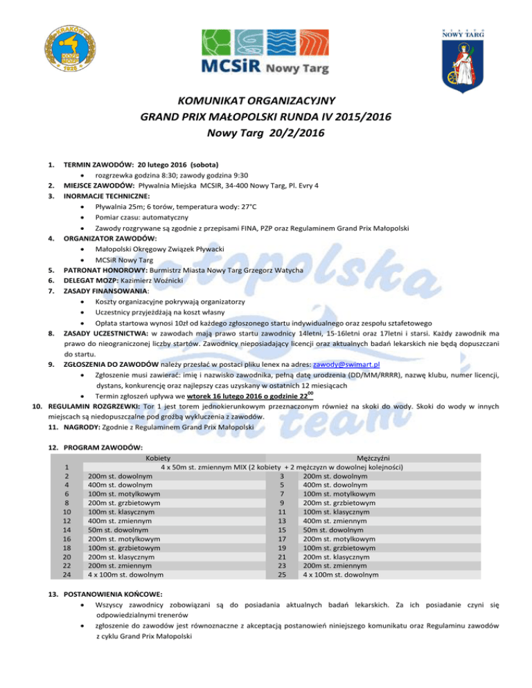 KOMUNIKAT ORGANIZACYJNY GRAND PRIX MAŁOPOLSKI RUNDA IV 2015/2016 Nowy Targ 20/2/2016 1. TERMIN ZAWODÓW: 20 lutego 2016 (sobota) rozgrzewka godzina 8:30; zawody godzina 9:30 2. MIEJSCE ZAWODÓW: Pływalnia Miejska MCSIR, 34-400 Nowy Targ, Pl. Evry 4 3. INORMACJE TECHNICZNE: Pływalnia 25m; 6 torów, temperatura wody: 27°C Pomiar czasu: automatyczny Zawody rozgrywane są zgodnie z przepisami FINA, PZP oraz Regulaminem Grand Prix Małopolski 4. ORGANIZATOR ZAWODÓW: Małopolski Okręgowy Związek Pływacki MCSiR Nowy Targ 5. PATRONAT HONOROWY: Burmistrz Miasta Nowy Targ Grzegorz Watycha 6. DELEGAT MOZP: Kazimierz Woźnicki 7. ZASADY FINANSOWANIA: Koszty organizacyjne pokrywają organizatorzy Uczestnicy przyjeżdżają na koszt własny Opłata startowa wynosi 10zł od każdego zgłoszonego startu indywidualnego oraz zespołu sztafetowego 8. ZASADY UCZESTNICTWA: w zawodach mają prawo startu zawodnicy 14letni, 15-16letni oraz 17letni i starsi. Każdy zawodnik ma prawo do nieograniczonej liczby startów. Zawodnicy nieposiadający licencji oraz aktualnych badań lekarskich nie będą dopuszczani do startu. 9. ZGŁOSZENIA DO ZAWODÓW należy przesłać w postaci pliku lenex na adres: [email protected] Zgłoszenie musi zawierać: imię i nazwisko zawodnika, pełną datę urodzenia (DD/MM/RRRR), nazwę klubu, numer licencji, dystans, konkurencję oraz najlepszy czas uzyskany w ostatnich 12 miesiącach 00 Termin zgłoszeń upływa we wtorek 16 lutego 2016 o godzinie 22 10. REGULAMIN ROZGRZEWKI: Tor 1 jest torem jednokierunkowym przeznaczonym również na skoki do wody. Skoki do wody w innych miejscach są niedopuszczalne pod groźbą wykluczenia z zawodów. 11. NAGRODY: Zgodnie z Regulaminem Grand Prix Małopolski 12. PROGRAM ZAWODÓW: 1 2 4 6 8 10 12 14 16 18 20 22 24 Kobiety Mężczyźni 4 x 50m st. zmiennym MIX (2 kobiety + 2 mężczyzn w dowolnej kolejności) 200m st. dowolnym 3 200m st. dowolnym 400m st. dowolnym 5 400m st. dowolnym 100m st. motylkowym 7 100m st. motylkowym 200m st. grzbietowym 9 200m st. grzbietowym 100m st. klasycznym 11 100m st. klasycznym 400m st. zmiennym 13 400m st. zmiennym 50m st. dowolnym 15 50m st. dowolnym 200m st. motylkowym 17 200m st. motylkowym 100m st. grzbietowym 19 100m st. grzbietowym 200m st. klasycznym 21 200m st. klasycznym 200m st. zmiennym 23 200m st. zmiennym 4 x 100m st. dowolnym 25 4 x 100m st. dowolnym 13. POSTANOWIENIA KOŃCOWE: Wszyscy zawodnicy zobowiązani są do posiadania aktualnych badań lekarskich. Za ich posiadanie czyni się odpowiedzialnymi trenerów zgłoszenie do zawodów jest równoznaczne z akceptacją postanowień niniejszego komunikatu oraz Regulaminu zawodów z cyklu Grand Prix Małopolski
