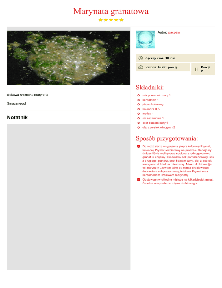 Marynata granatowa Autor: pacpaw Łączny czas: 30 min. Kalorie: kcal/1 porcję Porcji: 2 Składniki: ciekawa w smaku marynata sok pomarańczowy 1 kardamon 1 Smacznego! pieprz kolorowy kolendra 0,5 melisa 1 Notatnik sól sezamowa 1 ocet blasamiczny 1 olej z pestek winogron 2 Sposób przygotowania: Do moździerza wsypujemy pieprz kolorowy Prymat, kolendrę Prymat rozcieramy na proszek. Dodajemy świeże liście melisy oraz nasiona z jednego owocu granatu i ubijamy. Dolewamy sok pomarańczowy, sok z drugiego granatu, ocet balsamiczny, olej z pestek winogron i dokładnie mieszamy. Mięso drobiowe (ja tej marynaty używam tylko do mięsa drobiowego) doprawiam solą sezamową, imbirem Prymat oraz kardamonem i zalewam marynatą. Odstawiam w chłodne miejsce na kilkadziesiąt minut. Świetna marynata do mięsa drobiowego.
