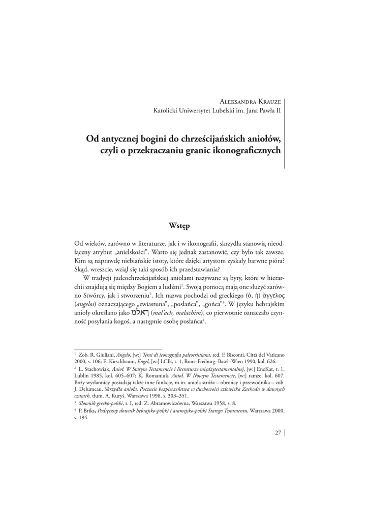 Aleksandra Krauze Katolicki Uniwersytet Lubelski im. Jana Pawła II Od antycznej bogini do chrześcijańskich aniołów, czyli o przekraczaniu granic ikonograficznych Wstęp Od wieków, zarówno w literaturze, jak i w ikonografii, skrzydła stanowią nieodłączny atrybut „anielskości”. Warto się jednak zastanowić, czy było tak zawsze. Kim są naprawdę niebiańskie istoty, które dzięki artystom zyskały barwne pióra? Skąd, wreszcie, wziął się taki sposób ich przedstawiania? W tradycji judeochrześcijańskiej aniołami nazywane są byty, które w hierarchii znajdują się między Bogiem a ludźmi1. Swoją pomocą mają one służyć zarówno Stwórcy, jak i stworzeniu2. Ich nazwa pochodzi od greckiego (è, ¾) ¡0028<? (angelos) oznaczającego „zwiastuna”, „posłańca”, „gońca”3. W języku hebrajskim anioły określano jako ( ךאלמmal’ach, malachim), co pierwotnie oznaczało czynność posyłania kogoś, a następnie osobę posłańca4. Zob. R. Giuliani, Angelo, [w:] Temi di iconografia paleocristiana, red. F. Bisconti, Città del Vaticano 2000, s. 106; E. Kirschbaum, Engel, [w:] LCIk, t. 1, Rom–Freiburg–Basel–Wien 1990, kol. 626. 2 L. Stachowiak, Anioł. W Starym Testamencie i literaturze międzytestamentalnej, [w:] EncKat, t. 1, Lublin 1985, kol. 605–607; K. Romaniuk, Anioł. W Nowym Testamencie, [w:] tamże, kol. 607. Boży wysłannicy posiadają także inne funkcje, m.in. anioła stróża – obrońcy i przewodnika – zob. J. Delumeau, Skrzydła anioła. Poczucie bezpieczeństwa w duchowości człowieka Zachodu w dawnych czasach, tłum. A. Kuryś, Warszawa 1998, s. 303–351. 3 Słownik grecko-polski, t. I, red. Z. Abramowiczówna, Warszawa 1958, s. 8. 4 P. Briks, Podręczny słownik hebrajsko-polski i aramejsko-polski Starego Testamentu, Warszawa 2000, s. 194. 1 27 Centrum – Peryferia – Granice W Piśmie Świętym aniołowie występują około 300 razy5. Jednak opisy ich wyglądu pojawiają się w Biblii sporadycznie6. Najczęściej określa się ich po prostu jako „mężów” (np. Joz 5, 137), „mężów Bożych” (np. Sdz 13, 68), „mężczyzn” (np. Łk 24, 49) lub „młodzieńców” (np. Mk 16, 510). Wprawdzie niektóre z opisów sugerują lot jako sposób poruszania się aniołów, jednak skrzydła nie pojawiają się w żadnym z nich11. Bożymi posłańcami interesowali się również pisarze wczesnochrześcijańscy. Problematyka ta pojawiła się już w II wieku, najpierw na polu apologetyki12. 5 Zob. Księga o aniołach, red. H. Oleschko, Kraków 2003, s. 16 (314 razy). Por. T. Martin, The Development of Winged Angels in Early Christian Art, [w:] Espacio, Tiempo y Forma, Serie VII: Historia del Arte, t. 14, 2001, s. 12 (273 razy). 6 Taki opis odnaleźć możemy np. w: Mt 28, 2 i n.: „powstało wielkie trzęsienie ziemi. Albowiem anioł Pański zstąpił z nieba, podszedł, odsunął kamień i usiadł na nim. Postać jego jaśniała jak błyskawica, a szaty jego były białe jak śnieg”. 7 Joz 5, 13: „Gdy Jozue przebywał blisko Jerycha, podniósł oczy i ujrzał przed sobą męża (¡:5>F=<:, virum) z mieczem dobytym w ręku. Jozue podszedł do niego i rzekł: Czy jesteś po naszej stronie, czy też po stronie naszych wrogów?”. 8 Sdz 13, 6: „Poszła więc kobieta do swego męża i tak rzekła do niego: Przyszedł do mnie mąż Boży (¡:5>F=<O A<= 52<=, vir Dei), którego oblicze było jakby obliczem Anioła Bożego – pełne dostojeństwa”. 9 Łk 24, 4: „Gdy wobec tego były bezradne, nagle stanęło przed nimi dwóch mężczyzn (¡:1>2?, viri) w lśniących szatach”. 10 Mk 16, 5: „Weszły więc do grobu i ujrzały młodzieńca (:2.:,@7<:, iuvenem), siedzącego po prawej stronie, ubranego w białą szatę; i bardzo się przestraszyły”. 11 Np. Dn 9, 21: „Gdy więc jeszcze wymawiałem [słowa] modlitwy, mąż Gabriel, którego spostrzegłem przedtem, przybył do mnie lecąc pospiesznie około czasu wieczornej ofiary”; Ap 10, 1n: „I ujrzałem innego potężnego anioła, zstępującego z nieba, obleczonego w obłok, tęcza była nad jego głową, a oblicze jego było jak słońce, a nogi jego jak słupy ogniste, i w prawej ręce miał otwartą książeczkę. Nogę prawą postawił na morzu, a lewą na ziemi”; Ap 14, 6: „Potem ujrzałem innego anioła lecącego przez środek nieba, mającego odwieczną Dobrą Nowinę do obwieszczenia wśród tych, którzy siedzą na ziemi, wśród każdego narodu, szczepu, języka i ludu”; Ap 18, 1: „Potem ujrzałem innego anioła – zstępującego z nieba i mającego wielką władzę, a ziemia od chwały jego rozbłysła”. Zob. T. Martin, The Development of Winged Angels, s. 12. Istoty niebiańskie występują także w tekstach apokryficznych. Inaczej niż w Biblii wielokrotnie znajdujemy tu wzmianki o anielskich skrzydłach – zob. A. Krauze, Bezskrzydli posłańcy. Najstarsze przedstawienia aniołów w sztuce wczesnochrześcijańskiej, Lublin 2010, s. 24–26 (niepublikowana praca magisterska). 12 Cecilia Proverbio (La figura dell’Angelo nella Civiltà Paleocristiana, Todi 2007, s. 27) datuje początki tej dyskusji teologicznej na kon. II i pocz. III w. Na przykład Justyn zaświadcza o wierze chrześcijan w Boga Ojca, Syna Bożego i Ducha Świętego, a obok Nich w anioły – zob. Justyn, 1 Apol., 1, 6 (SCh 507, s. 140, 142): „Otóż dlaczego do nas przylgnęło miano ateuszów. Prawda, przyznajemy się, jesteśmy ateuszami w stosunku do tego rodzaju rzekomych bogów, ale przenigdy w stosunku do Boga najprawdziwszego, który jest Ojcem sprawiedliwości, powściągliwości oraz innych cnót, tak że w Nim nie ma żadnej złego domieszki. Jemu to, a z Nim razem Synowi, który 28 Od antycznej bogini do chrześcijańskich aniołów... Z biegiem czasu, coraz bardziej wnikliwe refleksje pisarzy rozpoczęły szeroką debatę na temat natury aniołów13. Jedni uważali, że aniołowie pozbawieni są ciała, jako byty wyłącznie duchowe14. Inni, opie