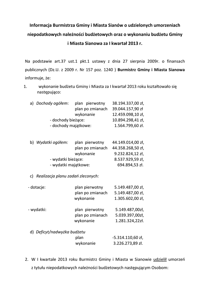 Informacja Burmistrza Gminy i Miasta Sianów o udzielonych umorzeniach niepodatkowych należności budżetowych oraz o wykonaniu budżetu Gminy i Miasta Sianowa za I kwartał 2013 r. Na podstawie art.37 ust.1 pkt.1 ustawy z dnia 27 sierpnia 2009r. o finansach publicznych (Dz.U. z 2009 r. Nr 157 poz. 1240 ) Burmistrz Gminy i Miasta Sianowa informuje, że: 1. wykonanie budżetu Gminy i Miasta za I kwartał 2013 roku kształtowało się następująco: a) Dochody ogółem: plan pierwotny plan po zmianach wykonanie - dochody bieżące: - dochody majątkowe: 38.194.337,00 zł, 39.044.157,90 zł 12.459.098,10 zł, 10.894.298,41 zł, 1.564.799,60 zł. b) Wydatki ogółem: 44.149.014,00 zł, 44.358.268,50 zł, 9.232.824,12 zł, 8.537.929,59 zł, 694.894,53 zł. plan pierwotny plan po zmianach wykonanie - wydatki bieżące: - wydatki majątkowe: c) Realizacja planu zadań zleconych: - dotacje: plan pierwotny plan po zmianach wykonanie 5.149.487,00 zł, 5.149.487,00 zł, 1.305.602,00 zł, - wydatki: plan pierwotny plan po zmianach wykonanie 5.149.487,00zł, 5.039.397,00zł, 1.281.324,22zł. d) Deficyt/nadwyżka budżetu plan wykonanie -5.314.110,60 zł, 3.226.273,89 zł. 2. W I kwartale 2013 roku Burmistrz Gminy i Miasta w Sianowie udzielił umorzeń z tytułu niepodatkowych należności budżetowych następującym Osobom: Nazwa /firma/ lub imię Wartość Forma pomocy Przyczyna i nazwisko beneficjenta nominalna 1 2 3 4 115,20 Umorzenie Zgon 2. Wesołowski Czesław 12,66 Umorzenie Zgon 3. Dmytryk Anna 26,28 Umorzenie Zgon 4. Kisiel Jerzy 2,23 Umorzenie Przedawnienie należności 5. Rutkowski Tomasz 0,81 Umorzenie Przedawnienie należności 6. Górska Izabela 52,10 Umorzenie Przedawnienie należności 7. Żukowska Marzena 23,48 Umorzenie Przedawnienie należności 8. Obojski Jerzy 17,55 Umorzenie Przedawnienie należności 9. Apanel Piotr 14,77 Umorzenie Przedawnienie należności 7,28 Umorzenie Prośba zainteresowanego 2.027,66 Umorzenie Firma w upadłości 47,03 Umorzenie Zgon 13. Łukowski Zenon 1.254,95 Umorzenie Postęp. egz. bez rezultatu 14. KS Premium Węgoria boisko 1.705,84 Umorzenie Postęp. egz. bez rezultatu 15. Zimnowłodzka Jolanta 30,48 Umorzenie Przedawnienie należności 16. Staniszewski Tomasz 30,42 Umorzenie Przedawnienie należności 17. Bruk Marianna 63,15 Umorzenie Przedawnienie należności 18. Gminna Spółdzielnia 71,82 Umorzenie Przedawnienie należności 1.277,12 Umorzenie Prośba zainteresowanych 2.245,86 Umorzenie Prośba zainteresowanych 1.277,12 Umorzenie Prośba zainteresowanych GWIK 1. Kosior Stanisław 10. ZB ABK 11. CEFARM 12. Jurgo Urszula „Samopomoc Chłopska” ZAOO 1. Stowarzyszenie Na Rzecz Rozwoju Wsi Iwięcino 2. Stowarzyszenie Rodziców Uczniów w Suchej Koszalińskiej 3. Towarzystwo Przyjaciół Dzieci Oddział Okręgowy Koszalin