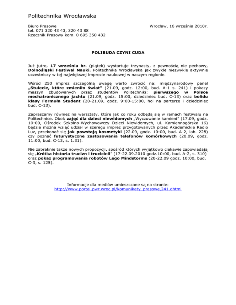 Politechnika Wrocławska Biuro Prasowe tel. 071 320 43 43, 320 43 88 Rzecznik Prasowy kom. 0 695 350 432 Wrocław, 16 września 2010r. POLIBUDA CZYNI CUDA JuŜ jutro, 17 września br. (piątek) wystartuje trzynasty, z pewnością nie pechowy, Dolnośląski Festiwal Nauki. Politechnika Wrocławska jak zwykle niezwykle aktywnie uczestniczy w tej największej imprezie naukowej w naszym regionie. Wśród 250 imprez szczególną uwagę warto zwrócić na: międzynarodowy panel „Stulecie, które zmieniło świat” (21.09, godz. 12:00, bud. A-1 s. 241) i pokazy maszyn zbudowanych przez studentów Politechniki: pierwszego w Polsce mechatronicznego jachtu (21.09, godz. 15:00, dziedziniec bud. C-13) oraz bolidu klasy Formuła Student (20-21.09, godz. 9:00-15:00, hol na parterze i dziedziniec bud. C-13). Zapraszamy równieŜ na warsztaty, które jak co roku odbędą się w ramach festiwalu na Politechnice. Obok zajęć dla dzieci niewidomych „Wyczuwanie kamieni” (17.09, godz. 10:00, Ośrodek Szkolno-Wychowawczy Dzieci Niewidomych, ul. Kamiennogórska 16) będzie moŜna wziąć udział w szeregu imprez przygotowanych przez Akademickie Radio Luz, przekonać się jak powstają kosmetyki (22.09, godz. 10:00, bud. A-2, lab. 228) czy poznać futurystyczne zastosowania telefonów komórkowych (20.09, godz. 11:00, bud. C-13, s. 1.31). Nie zabraknie takŜe nowych propozycji, spośród których wyjątkowo ciekawie zapowiadają się „Krótka historia trucizn i trucicieli” (17-22.09.2010 godz.10:00, bud. A-2, s. 310) oraz pokaz programowania robotów Lego Mindstorms (20-22.09 godz. 10:00, bud. C-3, s. 125). Informacje dla mediów umieszczane są na stronie: http://www.portal.pwr.wroc.pl/komunikaty_prasowe,241.dhtml
