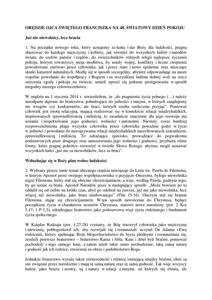 ORĘDZIE OJCA ŚWIĘTEGO FRANCISZKA NA 48. ŚWIATOWY DZIEŃ POKOJU Już nie niewolnicy, lecz bracia 1. Na początku nowego roku, który uznajemy za łaskę i dar Boży dla ludzkości, pragnę skierować do każdego mężczyzny i kobiety, jak również do wszystkich ludów i narodów świata, do szefów państw i rządów, do zwierzchników różnych religii najlepsze życzenia pokoju, którym towarzyszy moja modlitwa, by ustały wojny, konflikty i liczne cierpienia powodowane zarówno przez człowieka, jak i przez stare i nowe epidemie oraz niszczące skutki katastrof naturalnych. Modlę się w sposób szczególny, abyśmy odpowiadając na nasze wspólne powołanie do współpracy z Bogiem i ze wszystkimi ludźmi dobrej woli na rzecz szerzenia zgody i pokoju na świecie, umieli oprzeć się pokusie postępowania w sposób niegodny naszego człowieczeństwa. W orędziu na 1 stycznia 2014 r. stwierdziłem, że „do pragnienia życia pełnego (…) należy nieodparte dążenie do braterstwa, pobudzające do jedności z innymi, w których znajdujemy nie wrogów czy konkurentów, ale braci, których trzeba serdecznie przyjąć”. Ponieważ człowiek jest istotą relacyjną, mającą realizować się w kontekście relacji międzyludzkich, inspirowanych sprawiedliwością i miłością, to zasadnicze znaczenie dla jego rozwoju ma uznanie i respektowanie jego godności, wolności i autonomii. Niestety, coraz bardziej rozpowszechniona plaga wyzysku człowieka przez człowieka poważnie godzi w życie w jedności i powołanie do nawiązywania relacji międzyludzkich nacechowanych szacunkiem, sprawiedliwością i miłością. To odrażające zjawisko, prowadzące do pogwałcenia podstawowych praw drugiego oraz unicestwienia jego wolności i godności, przybiera różne formy, które pragnę pokrótce rozważyć w świetle Słowa Bożego, abyśmy mogli uznawać wszystkich ludzi „już nie za niewolników, lecz za braci”. Wsłuchując się w Boży plan wobec ludzkości 2. Wybrany przeze mnie temat obecnego orędzia nawiązuje do Listu św. Pawła do Filemona, w którym Apostoł prosi swojego współpracownika o przyjęcie Onezyma, byłego niewolnika tegoż Filemona, który stał się obecnie chrześcijaninem, a więc, według Pawła, godnym tego, by go uznać za brata. Apostoł Narodów pisze w następujący sposób: „Może bowiem po to oddalił się od ciebie na krótki czas, abyś go odebrał na zawsze, już nie jako niewolnika, lecz więcej niż niewolnika, jako brata umiłowanego” (Flm 15-16). Onezym stał się bratem Filemona, stając się chrześcijaninem. W ten sposób nawrócenie do Chrystusa, będące początkiem życia w charakterze uczniów Chrystusa, stanowi nowe narodziny (por. 2 Kor 5,17; 1 P 1,3), odradzające braterstwo jako podstawową więź życia rodzinnego i fundament życia społecznego. W Księdze Rodzaju (por. 1,27-28) czytamy, że Bóg stworzył człowieka jako mężczyznę i niewiastę, pobłogosławił ich, aby rozwijali się i rozmnażali: uczynił On Adama i Ewę rodzicami, którzy spełniając Boże błogosławieństwo do bycia płodnymi i rozmnażania się, zrodzili pierwsze braterstwo – braterstwo Kaina i Abla. Kain i Abel byli braćmi, ponieważ pochodzili z tego samego łona, a zatem mieli takie samo pochodzenie, taką samą naturę i godność jak ich rodzice, stworzeni na obraz i podobieństwo Boga. Jednakże braterstwo wyraża także różnorodność i różnicę istniejącą między braćmi, choć są oni związani przez narodzenie i mają tę samą naturę oraz tę samą godność. Tak więc wszyscy ludzie, jako bracia i siostry, są z natury w relacji z innymi, od których się różnią, ale z którymi łączy ich to samo pochodzenie, ta sama natura i godność. Na tej właśnie podstawie braterstwo stanowi sieć relacji o fundamentalnym znaczeniu dla budowania rodziny ludzkiej, stworzonej przez Boga. Niestety, pomiędzy pierwszym stworzeniem, o którym opowiada Księga Rodzaju, a nowymi narodzinami w Chrystusie, które czynią wierzących braćmi i siostrami Tego, który jest „pierworodnym między wielu braćmi” (Rz 8,29), istnieje negatywna rzeczywistość grzechu, który niejednokrotnie zrywa braterstwo wynikające ze stworzenia i stale oszpeca piękno i szlachetność bycia braćmi i siostrami w tej samej rodzinie ludzkiej. Kain nie tylko nie może znieść swego brata Abla, ale zabija go z zazdrości, popełniając pierwsze bratobójstwo. „Zabicie Abla przez Kaina w tragiczny sposób świadczy o radykalnym odrzuceniu powołania do bycia braćmi. Ich historia (por. Rdz 4,1-16) ukazuje trudne zadanie, do którego realizacji powołani są wszyscy ludzie: by żyć razem, wzajemnie o siebie się troszcząc”. Także w historii rodziny Noego i jego synów (por. Rdz 9,18-27) jest niegodziwość Chama wobec swego ojca, która pobudza Noego do przeklęcia nieokazującego szacunku syna, a pobłogosławienia innych, tych, którzy go szanowali, co spowodowało nierówność między braćmi zrodzonymi z tego samego łona. W opowiadaniu o początkach rodziny ludzkiej grzech oddalenia się od Boga, od postaci ojca i brata, staje się wyrazem odrzucenia komunii i przekłada się na kulturę zniewolenia (por. Rdz 1,25-27), z konsekwencjami, jakie to za sobą pociąga, które trwają z pokolenia na pokolenie: odrzucanie drugiego, maltretowanie osób, pogwałcenie godności i podstawowych praw, instytucjonalizacja nierówności. Wynika stąd konieczność nieustannego nawracania do Przymierza, wypełnionego przez ofiarę Chrystusa na krzyżu, w ufności, że „gdzie (…) wzmógł się grzech, tam jeszcze obficiej rozlała się łaska (…) przez Jezusa Chrystusa” (Rz 5,20.21). On, Syn umiłowany (Mt 3,17), przyszedł, aby objawić miłość Ojca do ludzkości. Kto słucha Ewangelii i odpowiada na wezwanie do nawrócenia, staje się dla Jezusa „bratem, siostrą i matką” (Mt 12,50), a zatem przybranym synem Jego Ojca (por. Ef 1,5). Nie stajemy się 