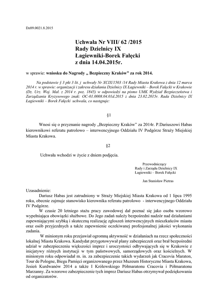 Dz09.0021.8.2015 Uchwała Nr VIII/ 62 /2015 Rady Dzielnicy IX Łagiewniki-Borek Fałęcki z dnia 14.04.2015r. w sprawie: wniosku do Nagrody „ Bezpieczny Kraków” za rok 2014. Na podstawie § 3 pkt 3 lit. j uchwały Nr XCIX/1503 /14 Rady Miasta Krakowa z dnia 12 marca 2014 r. w sprawie: organizacji i zakresu działania Dzielnicy IX Łagiewniki – Borek Fałęcki w Krakowie (Dz. Urz. Woj. Mał. z 2014 r. poz. 1845) w odpowiedzi na pismo UMK Wydział Bezpieczeństwa i Zarządzania Kryzysowego znak: OC-01.0008.04.01d.2015 z dnia 23.02.2015r. Rada Dzielnicy IX Łagiewniki – Borek Fałęcki uchwala, co następuje: §1 Wnosi się o przyznanie nagrody „Bezpieczny Kraków” za 2014r. P.Dariuszowi Habas kierownikowi referatu patrolowo – interwencyjnego Oddziału IV Podgórze Straży Miejskiej Miasta Krakowa. §2 Uchwała wchodzi w życie z dniem podjęcia. Przewodniczący Rady i Zarządu Dzielnicy IX Łagiewniki – Borek Fałęcki Jan Stanisław Pietras Uzasadnienie: Dariusz Habas jest zatrudniony w Straży Miejskiej Miasta Krakowa od 1 lipca 1995 roku, obecnie zajmuje stanowisko kierownika referatu patrolowo - interwencyjnego Oddziału IV Podgórze. W czasie 20 letniego stażu pracy zawodowej dał poznać się jako osoba wzorowo wypełniająca obowiązki służbowe. Do Jego zadań należy bezpośredni nadzór nad działaniami zapewniającymi szybką i skuteczną realizację zgłoszeń interwencyjnych mieszkańców miasta oraz osób przyjezdnych a także zapewnienie oczekiwanej profesjonalnej jakości wykonania zadania. W minionym roku przejawiał ogromną aktywność w działaniach na rzecz społeczności lokalnej Miasta Krakowa. Kandydat przygotowywał plany zabezpieczeń oraz brał bezpośredni udział w zabezpieczeniu większości imprez i uroczystości odbywających się w Krakowie z inicjatywy różnych instytucji w tym państwowych, samorządowych oraz kościelnych. W minionym roku odpowiadał m. in. za zabezpieczenie takich wydarzeń jak Cracovia Maraton, Tour de Pologne, Biegu Pamięci organizowanego przez Muzeum Historyczne Miasta Krakowa, Jesień Kurdwanów 2014 a także I Królewskiego Półmaratonu Cracovia i Półmaratonu Marzanny. Za wzorowe zabezpieczenie tych imprez Dariusz Habas otrzymywał podziękowania od organizatorów. Rok miniony to czas, w którym nasze miasto obchodziło wielką uroczystość Święta Miłosierdzia Bożego oraz Kanonizacji Błogosławionego Jana Pawła II. Kraków miał przyjemność gościć w tym czasie rzesze wiernych z wielu krajów. Koncentracja działań opartych na współpracy z instytucjami, nadzór oraz sprawny przebieg zabezpieczenia to również niemała zasługa kandydata, gdyż główne uroczystości odbywały się na terenie Oddziału IV Podgórze Straży Miejskiej Miasta Krakowa. Kierując podwładnymi doskonale potrafił zaplanować służbę, czuwać nad jej przebiegiem oraz osobiście nadzorować, co w efekcie przyczyniło się do sukcesu organizacyjnego miasta oraz służb ją zabezpieczających. Mając na uwadze poprawę porządku i bezpieczeństwa w mieście na co dzień współpracuje z wieloma instytucjami w tym szczególnie z funkcjonariuszami Policji oraz inspektorami MPK czego przejawem jest zwiększenie ilości wspólnych służb patrolowych w obszarach narażonych na występowanie dokuczliwych dla mieszkańców czynów zabronionych. Obecność w rejonie patroli mieszanych strażnik, policjant bądź strażnik inspektor MPK w znacznym stopniu przyczynia się do wzrostu poczucia bezpieczeństwa i porządku wśród mieszkańców. Pan Dariusz Habas w swojej pracy wyróżnia się determinacją, skutecznością oraz profesjonalizmem co przyczynia się do tego, że Kraków postrzegany jest jako miasto bezpieczne zarówno dla mieszkańców jak i turystów. W ciągu wielu lat służby wykształcił, przyuczając do zawodu wielu nowych strażników rozpoczynających służbę, kształtując w nich pozytywne umiejętności, szacunek dla munduru oraz obywateli. Cieszy się nienaganną opinią, realizując obowiązki służbowe w sposób uczciwy i bezstronny. Duże doświadczenie, wiedza i kreatywność w realizacji obowiązków służbowych sprawiają że w ciągu dotychczasowej długoletniej służby wniósł duży wkład pracy realizowanej przez funkcjonariuszy Straży Miejskiej Miasta Krakowa na rzecz społeczności lokalnej naszego Miasta oraz poprawy porządku i bezpieczeństwa publicznego. Znajduje to odzwierciedlenie zarówno w ocenie przełożonych jak i ocenach Rad Dzielnic oraz mieszkańców. Biorąc pod uwagę powyższe uważam, że kandydatura ww. funkcjonariusza do przyznania Nagrody Bezpieczny Kraków za rok 2014 jest w pełni zasadna.