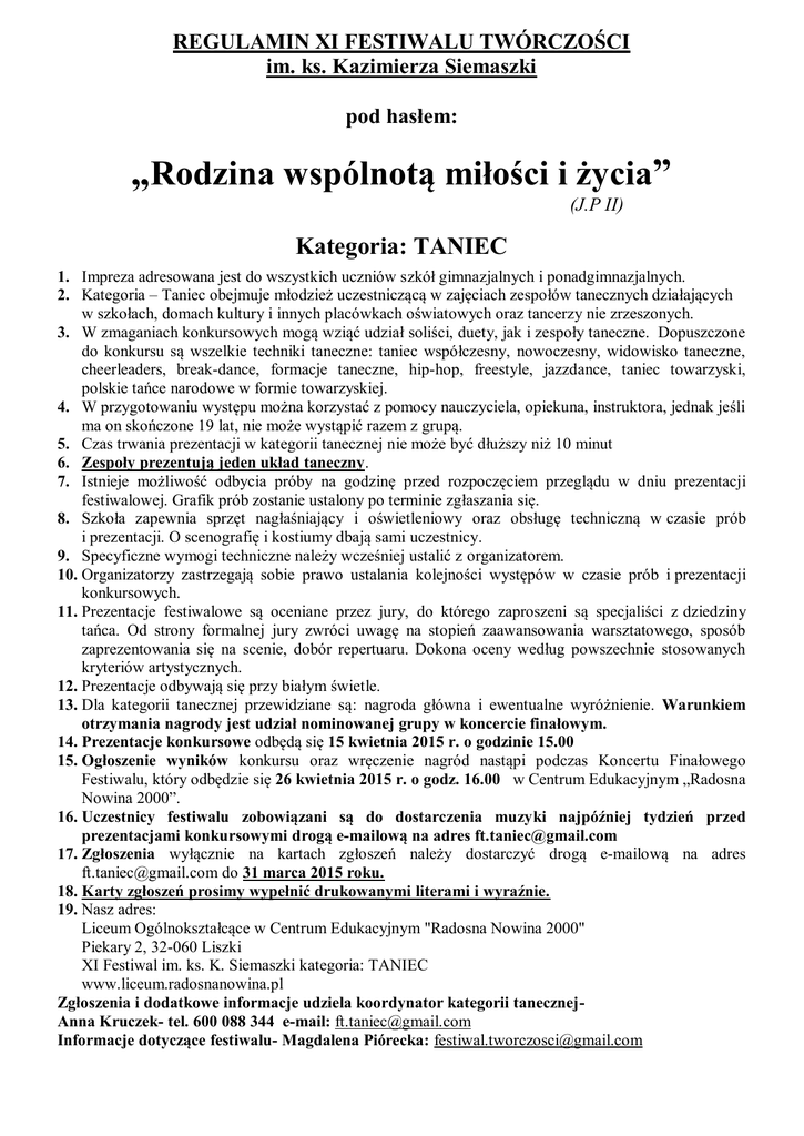REGULAMIN XI FESTIWALU TWÓRCZOŚCI im. ks. Kazimierza Siemaszki pod hasłem: „Rodzina wspólnotą miłości i życia” (J.P II) Kategoria: TANIEC 1. Impreza adresowana jest do wszystkich uczniów szkół gimnazjalnych i ponadgimnazjalnych. 2. Kategoria – Taniec obejmuje młodzież uczestniczącą w zajęciach zespołów tanecznych działających w szkołach, domach kultury i innych placówkach oświatowych oraz tancerzy nie zrzeszonych. 3. W zmaganiach konkursowych mogą wziąć udział soliści, duety, jak i zespoły taneczne. Dopuszczone do konkursu są wszelkie techniki taneczne: taniec współczesny, nowoczesny, widowisko taneczne, cheerleaders, break-dance, formacje taneczne, hip-hop, freestyle, jazzdance, taniec towarzyski, polskie tańce narodowe w formie towarzyskiej. 4. W przygotowaniu występu można korzystać z pomocy nauczyciela, opiekuna, instruktora, jednak jeśli ma on skończone 19 lat, nie może wystąpić razem z grupą. 5. Czas trwania prezentacji w kategorii tanecznej nie może być dłuższy niż 10 minut 6. Zespoły prezentują jeden układ taneczny. 7. Istnieje możliwość odbycia próby na godzinę przed rozpoczęciem przeglądu w dniu prezentacji festiwalowej. Grafik prób zostanie ustalony po terminie zgłaszania się. 8. Szkoła zapewnia sprzęt nagłaśniający i oświetleniowy oraz obsługę techniczną w czasie prób i prezentacji. O scenografię i kostiumy dbają sami uczestnicy. 9. Specyficzne wymogi techniczne należy wcześniej ustalić z organizatorem. 10. Organizatorzy zastrzegają sobie prawo ustalania kolejności występów w czasie prób i prezentacji konkursowych. 11. Prezentacje festiwalowe są oceniane przez jury, do którego zaproszeni są specjaliści z dziedziny tańca. Od strony formalnej jury zwróci uwagę na stopień zaawansowania warsztatowego, sposób zaprezentowania się na scenie, dobór repertuaru. Dokona oceny według powszechnie stosowanych kryteriów artystycznych. 12. Prezentacje odbywają się przy białym świetle. 13. Dla kategorii tanecznej przewidziane są: nagroda główna i ewentualne wyróżnienie. Warunkiem otrzymania nagrody jest udział nominowanej grupy w koncercie finałowym. 14. Prezentacje konkursowe odbędą się 15 kwietnia 2015 r. o godzinie 15.00 15. Ogłoszenie wyników konkursu oraz wręczenie nagród nastąpi podczas Koncertu Finałowego Festiwalu, który odbędzie się 26 kwietnia 2015 r. o godz. 16.00 w Centrum Edukacyjnym „Radosna Nowina 2000”. 16. Uczestnicy festiwalu zobowiązani są do dostarczenia muzyki najpóźniej tydzień przed prezentacjami konkursowymi drogą e-mailową na adres [email protected] 17. Zgłoszenia wyłącznie na kartach zgłoszeń należy dostarczyć drogą e-mailową na adres [email protected] do 31 marca 2015 roku. 18. Karty zgłoszeń prosimy wypełnić drukowanymi literami i wyraźnie. 19. Nasz adres: Liceum Ogólnokształcące w Centrum Edukacyjnym "Radosna Nowina 2000" Piekary 2, 32-060 Liszki XI Festiwal im. ks. K. Siemaszki kategoria: TANIEC www.liceum.radosnanowina.pl Zgłoszenia i dodatkowe informacje udziela koordynator kategorii tanecznejAnna Kruczek- tel. 600 088 344 e-mail: [email protected] Informacje dotyczące festiwalu- Magdalena Piórecka: [email protected] XI FESTIWAL TWÓRCZOŚCI im. ks. Kazimierza Siemaszki KARTA ZGŁOSZENIA KATEGORIA: TANIEC 1. IMIĘ I NAZWISKO WYKONAWCY/NAZWA GRUPY, ZESPOŁU (nazwa zespołu i jego skład z podaniem funkcji poszczególnych osób, krótka informacja o grupie) .................................................................................................................................................................................................................. .................................................................................................................................................................................................................. .................................................................................................................................................................................................................. .................................................................................................................................................................................................................. 2. ILOSĆ WYSTEPUJĄCYCH OSÓB I WIEK: ...................................................................................................................................................................................................................... 3. TECHNIKA TANECZNA: .................................................................................................................................................................................................................. 4. PLACÓWKA DELEGUJĄCA - KONTAKT: .................................................................................................................................................................................................................. .................................................................................................................................................................................................................. 5. IMIĘ I NAZWISKO INSTRUKTORA, AUTORA CHOREOGRAFII: .................................................................................................................................................................................................................. 6. ADRES(e-mail) I TELEFON KONTAKTOWY DO INSTRUKTORA ...................................................................................................................................................................................................................... ......................................................................................................................................................................................