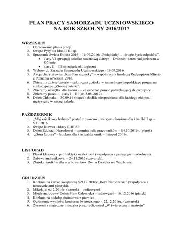 PLAN PRACY SAMORZĄDU UCZNIOWSKIEGO NA ROK SZKOLNY 2016/2017 WRZESIEŃ 1. Opracowanie planu pracy. 2. Święto Pyry dla klas II-III sp. 3. Sprzątanie Świata Polska 2016 – 16.09.2016: „Podaj dalej … drugie życie odpadów”, klasy VI sprzątają ścieżkę rowerową Garzyn – Drobnin i teren nad jeziorem w Górznie klasy II – III sp zajęcia ekologiczne 4. Wybory do Zarządu Samorządu Uczniowskiego - 19.09.2016 5. Akcja charytatywna „Kup Pan szczotkę” – współpraca z fundacją Redemptoris Missio z Poznania wrzesień 2016. 6. Zbieramy zużyte baterie – całoroczna zbiórka w ramach ogólnopolskiego programu edukacyjnego „Zbieraj baterie”. 7. Zbieramy nakrętki dla Karinki – całoroczna pomoc potrzebującej dziewczynce. 8. Zbieramy puszki – klasy I – III (do 5.05.2017). 9. Dzień Chłopaka – 30.09.16 (piątek) słodkie niespodzianki dla każdego chłopca i mężczyzny w naszej szkole. PAŹDZIERNIK 1. „Mój książkowy bohater” postać z owoców i warzyw – konkurs dla klas II-III sp – 5.10.2016 2. Święto latawca - klasy II-III SP. 3. Dzień Edukacji Narodowej – upominki dla pracowników – 14.10.2016r. (piątek) 4. „Góra Grosza” – konkurs dla klas październik – listopad 2016r. LISTOPAD 1. Plakat klasowy - profilaktyka uzależnień (współpraca z pedagogiem szkolnym). 2. Zabawa andrzejkowa – 24.11.2016 (czwartek). 3. Zbiórka środków dla wychowanków Domu Dziecka we Wschowie. GRUDZIEŃ 1. Konkurs na kartkę świąteczną 5-9.12.2016r „Boże Narodzenie” (współpraca z nauczycielami plastyki). 2. Mikołajki 6.12.2016r. (wtorek) – radiowęzeł. 3. Międzynarodowy Dzień Praw Człowieka – radiowęzeł – 16.12.2016 (piątek) 4. Konkurs na ozdobę choinkową z piernika. 5. Ogłoszenie wyników konkursu świątecznego - 22.12.2016r. (czwartek) 6. Życzenia świąteczne i muzyka przez radiowęzeł „W świątecznym nastroju”. STYCZEŃ 1. Spotkanie wigilijne z wychowankami Domu Dziecka i przedstawicielami Zespołu Szkół w Drobninie - 5.01.2017 (czwartek) 2. Wielka Orkiestra Świątecznej pomocy – wolontariat 3. Podsumowanie pracy za I półrocze – sprawozdanie. LUTY 1. Poczta walentynkowa 14.02.2017 (wtorek) 2. Karnawał – Bal Przebierańców dla klas II-III sp 15.02.2017 (środa) MARZEC 1. Dzień Kobiet 8.03.2017r. (środa) – słodkie niespodzianki dla kobiet i dziewcząt. 2. Pierwszy Dzień wiosny - 21.03.2017 (wtorek) kl.II-III sp obchody Pierwszego Dnia Wiosny – Topienie Marzanny. KWIECIEŃ 1. Konkurs dla na koszyk wielkanocny MAJ 1. Zakończenie zbiórek nakrętek, baterii, puszek - podsumowanie. CZERWIEC 1. Podsumowanie całorocznej pracy. ZADANIA STAŁE Wylosowany numerek – codziennie. Dzień bez pytania – raz w miesiącu. Spotkania z Dyrekcją Szkoły w celu koordynacji działań Samorządu Uczniowskiego. Rozprowadzanie gazety „Życie gminy Krzemieniewo” – miesięcznik. Radiowęzeł. Udział w akcjach charytatywnych. OPIEKUN SU mgr Monika Piotrowiak-Kaczmarek PRZEWODNICZĄCY SU Miłosz Buczek