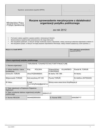 6\JQDWXUDVSUDZR]GDQLDZ\SHáQLD 6\JQDWXUDVSUDZR]GDQLDZ\SHáQLD03L36 MPiPS) Ministerstwo Pracy L3ROLW\NL6SRáHF]QHM 5RF]QHVSUDZR]GDQLHPHU\WRU\F]QH]G]LDáDOQRĞFL RUJDQL]DFMLSRĪ\WNXSXEOLF]QHJR za rok 2012 • • • • )RUPXODU]QDOHĪ\Z\SHáQLüZMĊ]\NXSROVNLPGUXNRZDQ\PLOLWHUDPL 6SUDZR]GDZFDZ\SHáQLDW\ONRSU]H]QDF]RQHGODQLHJRELDáHSROD :HZV]\VWNLFKS\WDQLDFKZNWyU\FKLVWQLHMHPRĪOLZRĞüZ\ERUXRGSRZLHG]LQDOHĪ\]D]QDF]\üZáDĞFLZHRGSRZLHG]L]QDNLHP; :HZV]\VWNLFKSRODFKZNWyU\FKQLHEĊGąZSLVDQHRGSRZLHGQLHLQIRUPDFMHQDOHĪ\ZVWDZLüSRMHG\QF]\]QDNP\ĞOQLND 'DWDZSá\QLĊFLDVSUDZR]GDQLD Z\SHáQLD03L36 Miejsce na notatki MPiPS ,'DQHRUJDQL]DFMLSRĪ\WNXSXEOLF]QHJR 7258ē6.,(72:$5=<67:2)257<),.$&<-1( 1. Nazwa organizacji POLSKA Województwo POMORSKIE KUJAWSKO- 3RZLDW07258ē 2. Adres siedziby i dane kontaktowe Kraj *PLQD07258ē 8OLFD32=1$ē6.$ Nr domu 191-199 Nr lokalu 0LHMVFRZRĞü7258ē Kod pocztowy 87-100 3RF]WD7258ē Nr telefonu 607054249 Nr faksu E-mail Strona www www.torun.fortyfikacje.pl [email protected] m 3. Data rejestracji w Krajowym Rejestrze 6ąGRZ\P 'DWDX]\VNDQLDVWDWXVXRUJDQL]DFMLSRĪ\WNX publicznego 5. Numer REGON Druk: MPiPS 34044829500000 2009-07-21 6. Numer KRS 0000296717 1 6NáDGRUJDQX]DU]ąG]DMąFHJRRUJDQL]DFML 1DOHĪ\ZSLVDüLPLRQDQD]ZLVNDRUD]LQIRUPDFMHRIXQNFML SHáQLRQHMSU]H]SRV]F]HJyOQ\FKF]áRQNyZRUJDQX ]DU]ąG]DMąFHJR Tomasz Iwaszkiewicz - prezes 7RPLVáDZ.DOHPENDZLFHSUH]HV 3DZHá:UyEOHZVNLVNDUEQLN Kazimierz Lewandowski - sekretarz 6NáDGRUJDQXNRQWUROLOXEQDG]RUXRUJDQL]DFML .U]\V]WRI.DZDSU]HZRGQLF]ąF\ 1DOHĪ\ZSLVDüLPLRQDQD]ZLVNDRUD]LQIRUPDFMHRIXQNFML -ĊGU]HM,Ī\FNLZLFHSU]HZRGQLF]ąF\ SHáQLRQHMSU]H]SRV]F]HJyOQ\FKF]áRQNyZRUJDQXNRQWUROL Kazimierz Paprocki - sekretarz lub nadzoru) 9. Cele statutowe organizacji 1DOHĪ\RSLVDüFHOHQDSRGVWDZLHVWDWXWXRUJDQL]DFML SRGHMPRZDQLHZV]HFKVWURQQ\FKG]LDáDĔLUHDOL]RZDQLH SU]HGVLĊZ]LĊü]PLHU]DMąF\FKGRRFKURQ\]DFKRZDQLDLXWU]\PDQLD ZQDOHĪ\W\PVWDQLHIRUW\ILNDFMLLWRZDU]\V]ąF\FKLPRELHNWyZRUD] LFK]DJRVSRGDURZDQLDSRJáĊELDQLHZLHG]\Z]DNUHVLHKLVWRULL IRUW\ILNDFMLLQDXN]QLą]ZLą]DQ\FKHGXNDFMDLXSRZV]HFKQLDQLH wiedzy na temat historii i walorów obronnych budowli fortecznych, SREXG]HQLHLQLFMDW\ZVSRáHF]Q\FKQDU]HF]RFKURQ\IRUW\ILNDFMLRUD] G]LDáDQLDQDU]HF]SURPRFMLREURQQRĞFLLZRMVNRZRĞFL SURZDG]HQLHG]LDáDOQRĞFLNXOWXUDOQHMHGXNDF\MQHMVSRUWRZHM turystycznej, rekreacyjnej i wydawniczej. 10. Sposób realizacji celów statutowych organizacji 1DOHĪ\RSLVDüVSRVyEUHDOL]DFMLFHOyZVWDWXWRZ\FK organizacji na podstawie statutu organizacji) Druk: MPiPS - rewitalizacja obiektów fortecznych; SR]\VNLZDQLHLUDWRZDQLH]DJURĪRQ\FKRELHNWyZ]ZLą]DQ\FK] IRUW\ILNDFMDPLOXELFKZ\SRVDĪHQLD - popularyzacja wiedzy w zakresie fortyfikacji. 2 1DMZDĪQLHMV]HVIHU\G]LDáDOQRĞFLSRĪ\WNX publicznego 1DOHĪ\ZVND]DüQLHZLĊFHMQLĪWU]\QDMZDĪQLHMV]HSRG Z]JOĊGHPZLHONRĞFLZ\GDWNRZDQ\FKĞURGNyZVIHU\ G]LDáDOQRĞFLSRĪ\WNXSXEOLF]QHJRRNWyU\FKPRZDZDUW XVWXVWDZ\]GQLDNZLHWQLDURG]LDáDOQRĞFL SRĪ\WNXSXEOLF]QHJRLRZRORQWDULDFLH(Dz. U. z 2010 r. Nr 234, poz. 1536), ]DF]\QDMąFRGQDMZDĪQLHMV]HM kultura, sztuka, ochrona dóbr kultury i dziedzictwa narodowego podtrzymywanie i upowszechnianie tradycji narodowej, SLHOĊJQRZDQLHSROVNRĞFLRUD]UR]ZyMĞZLDGRPRĞFLQDURGRZHM obywatelskiej i kulturowej turystyka i krajoznawstwo ,,&KDUDNWHU\VW\NDG]LDáDOQRĞFLRUJDQL]DFMLSRĪ\WNXSXEOLF]QHJRZRNUHVLHVSUDZR]GDZF]\P 2SLVG]LDáDOQRĞFLSRĪ\WNXSXEOLF]QHJR 2SLVJáyZQ\FKG]LDáDĔ SRGMĊW\FKSU]H]RUJDQL]DFMĊ - Rewitalizacja obiektów fortecznych: :UDPDFK0X]HXP)RUW\ILNDFML3DQFHUQHM7ZLHUG]\7RUXĔUHZLWDOL]RZDQHVą RELHNW\SLHUĞFLHQLD]HZQĊWU]QHJR7ZLHUG]\7RUXĔ'RĞZLDGF]DOQD%DWHULD 3DQFHUQD$%,9L]HVSyá%DWHULL3yáSDQFHUQHM6/%RUD]IRUW\ILNDFMHL]DE\WNL PLOLWDUQH]RNUHVXPLĊG]\ZRMHQQHJRLRNUHVXW]Z]LPQHMZRMQ\:URNX2012 SURZDG]RQHE\á\SUDFH]DEH]SLHF]DMąFHLSU]\VWRVRZXMąFHRELHNW\GODUXFKX turystycznego: EUXNRZDQLHG]LHG]LĔFD%DWHULL$%,9 - ogrodzenie terenu Baterii AB IV; - oczyszczenie i prace ziemne na Baterii SLB; - zabezpieczenie systemem monitoringu obiektów. 3R]\VNLZDQLHLUDWRZDQLH]DJURĪRQ\FKRELHNWyZ]ZLą]DQ\FK]IRUW\ILNDFMDPL OXELFKZ\SRVDĪHQLD SR]\VNDQLHSU]ĊVáDEUDP\IRUWHF]QHM]H]áRPX - Inne prace przeprowadzone w skansenie fortecznym: - budowa i ustawienie stanowiska „PSO”. - Popularyzacja wiedzy w zakresie fortyfikacji: 'QL3RGJyU]DZ6NDQVHQLH)RUWHF]Q\PZVSyáRUJDQL]DFMD12.VIII.2012r.); =ORW%XQNURZFyZZVSyáRUJDQL]DFMD13-15.IV.2012r.); - Weekend Forteczny – organizacja cyklu wycieczek otwartych (zwiedzanie Fortu I, Koszar Bramy Lubickiej, Hangaru Wsch.) i prelekcji (06-08.VII.2012r.).; - Piknik Militarny – organizacja imprezy otwartej w skansenie fortecznym (30.IX.2012r.). =DVLĊJWHU\WRULDOQ\SURZDG]RQHMSU]H]RUJDQL]DFMĊ G]LDáDOQRĞFLSRĪ\WNXSXEOLF]QHJR 1DOHĪ\ZVND]DüQSÄJPLQD´ÄSRZLDW´ÄZRMHZyG]WZR´ÄFDá\NUDM´ „zagranica”) województwo ,QIRUPDFMDGRW\F]ąFDSURZDG]RQ\FKSU]H]RUJDQL]DFMĊSRĪ\WNXSXEOLF]QHJRSODFyZHNZRNUHVLH sprawozdawczym 1.Organizacja SURZDG]LáDSODFyZNL]DSHZQLDMąFHFDáRGRERZąRSLHNĊRVRERP QLHSHáQRVSUDZQ\PSU]HZOHNOHFKRU\POXERVRERPZSRGHV]á\PZLHNXFHQWUDLQWHJUDFML VSRáHF]QHMGRP\SRPRF\VSRáHF]QHMSODFyZNLRSLHNXĔF]RZ\FKRZDZF]HRNUHĞORQHZ SU]HSLVDFKRSRPRF\VSRáHF]QHMV]NRá\LSODFyZNLSXEOLF]QHRNUHĞORQHZSU]HSLVDFKR V\VWHPLHRĞZLDW\OXEQLHSXEOLF]QH]DNáDG\RSLHNL]GURZRWQHM ,QIRUPDFMDQDWHPDWORNDOL]DFMLLDNW\ZQRĞFLSODFyZHNRNWyU\FKPRZDZSNW Lp Nazwa placówki Druk: MPiPS 0LHMVFRZRĞüFLZNWyUHM\FK SODFyZNDSURZDG]LG]LDáDQLD /LF]EDRGELRUFyZG]LDáDĔ placówki w okresie sprawozdawczym 3 ,QIRUPDFMDGRW\F]ąFDOLF]E\RGELRUFyZG]LDáDĔRUJDQL]DFMLSRĪ\WNXSXEOLF]QHJRw okresie sprawozdawczym /LF]EDRGELRUFyZG]LDáDĔRUJDQL]DFML 1DOHĪ\RV]DFRZDüOLF]EĊRGELRUFyZG]LDáDĔRUJDQL]DFMLZRNUHVLH sprawozdawczym, w podziale na osoby fizyczne i osoby prawne) Osoby fizyczne 2000 Osoby prawne 0 ,QIRUPDFMDGRW\F]ąFDG]LDáDOQRĞFLQLHRGSáDWQHMSRĪ\WNXSXEOLF]QHJRRUJDQL]DFMLZRNUHVLH sprawozdawczym 2SLVSU]HGPLRWXQLHRGSáDWQHMG]LDáDOQRĞFL SRĪ\WNXSXEOLF]QHJR 1DOHĪ\SRGDüLQIRUPDFMĊQDWHPDWURG]DMXG]LDáDOQRĞFL QLHRGSáDWQHMRUJDQL]DFMLZRNUHVLH
