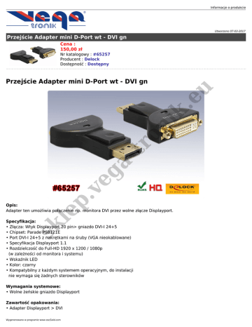 Informacje o produkcie Utworzono 07-03-2017 Przejście Adapter mini D-Port wt - DVI gn Cena : 150,00 zł Nr katalogowy : #65257 Producent : Delock Dostępność : Dostępny p. ve g atr on i k. eu Przejście Adapter mini D-Port wt - DVI gn sk le Opis: Adapter ten umożliwia połączenie np. monitora DVI przez wolne złącze Displayport. Specyfikacja: • Złącza: Wtyk Displayport 20 pin> gniazdo DVI-I 24+5 • Chipset: Parade PS8121E • Port DVI-I 24+5 z nakrętkami na śruby (VGA nieokablowane) • Specyfikacja Displayport 1.1 • Rozdzielczość do Full-HD 1920 x 1200 / 1080p (w zależności od monitora i systemu) • Wskaźnik LED • Kolor: czarny • Kompatybilny z każdym systemem operacyjnym, do instalacji nie wymaga się żadnych sterowników Wymagania systemowe: • Wolne żeńskie gniazdo Displayport Zawartość opakowania: • Adapter Displayport > DVI Wygenerowano w programie www.oscGold.com sk le p. ve g atr on i k. eu Opakowanie: • Blister