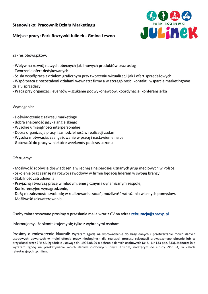 Stanowisko: Pracownik Działu Marketingu Miejsce pracy: Park Rozrywki Julinek - Gmina Leszno Zakres obowiązków: - Wpływ na rozwój naszych obecnych jak i nowych produktów oraz usług - Tworzenie ofert dedykowanych - Ścisła współpraca z działem graficznym przy tworzeniu wizualizacji jak i ofert sprzedażowych - Współpraca z pozostałymi działami wewnątrz firmy a w szczególności kontakt i wsparcie marketingowe działu sprzedaży - Praca przy organizacji eventów – szukanie podwykonawców, koordynacja, konferansjerka Wymagania: - Doświadczenie z zakresu marketingu - dobra znajomość języka angielskiego - Wysokie umiejętności interpersonalne - Dobra organizacja pracy i samodzielność w realizacji zadań - Wysoka motywacja, zaangażowanie w pracę i nastawienie na cel - Gotowość do pracy w niektóre weekendy podczas sezonu Oferujemy: - Możliwość zdobycia doświadczenia w jednej z najbardziej uznanych grup mediowych w Polsce, - Szkolenia oraz szansę na rozwój zawodowy w firmie będącej liderem w swojej branży - Stabilność zatrudnienia, - Przyjazną i twórczą pracę w młodym, energicznym i dynamicznym zespole, - Konkurencyjne wynagrodzenie, - Dużą niezależność i swobodę w realizowaniu zadań, możliwość wdrażania własnych pomysłów. - Możliwość zakwaterowania Osoby zainteresowane prosimy o przesłanie maila wraz z CV na adres [email protected] Informujemy, że skontaktujemy się tylko z wybranymi osobami. Prosimy o zmieszczenie klauzuli: Wyrażam zgodę na wprowadzenie do bazy danych i przetwarzanie moich danych osobowych, zawartych w mojej ofercie pracy niezbędnych dla realizacji procesu rekrutacji prowadzonego obecnie lub w przyszłości przez ZPR SA (zgodnie z ustawą z dn. 1997.08.29 o ochronie danych osobowych Dz. U. Nr 133 poz. 833). Jednocześnie wyrażam zgodę na przekazywanie moich danych osobowych innym firmom, należącym do Grupy ZPR SA, w celach rekrutacyjnych tych firm.