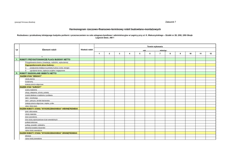 Załacznik 7 (pieczęć firmowa oferetna) Harmonogram rzeczowo-finansowo-terminowy robót budowlano-montażowych Rozbudowa z przebudową istniejącego budynku portierni z przeznaczeniem na cele usługowo-handlowe i administracyjne w Legnicy przy ul. K. Makuszyńskiego – Działki nr 28, 2/92, 2/93 Obręb Legnicki Dwór, AM 1 Termin wykonania Lp Element robót Wartość robót rok……………..……. miesiąc: 1 1 I. ROBOTY PRZYGOTOWAWCZE PLACU BUDOWY NETTO Przygotowanie terenu (niwelacja, rozbiórki, wyburzenia) Zagospodarowanie placu budowy: II. a przyłączenia instalacji na potrzeby budowy (woda, energia) b ogrodzenie terenu, zaplecze socjalne i magazynowe ROBOTY BUDOWLANE OBIEKTU NETTO RAZEM STAN "ZEROWY" roboty ziemne fundamenty izolacje przeciw wilgociowe RAZEM STAN "SUROWY" ściany nadziemia stropy, sklepienia, schody, podesty ścianki działowe w nadziemiu i poddaszu dach - konstrukcja dach - pokrycie, obróbki blacharskie izolacje przeciw wilgociowe, cieplne, p-dźw. okna i drzwi zewn. RAZEM ROBOTY STANU "WYKOŃCZENIOWEGO" WEWNĘTRZNEGO tynki i oblicowania roboty malarskie drzwi wewnetrzne inne roboty wykończeniowe ścian wewnętrznych podłoże betonowe podłogi, posadzki, wykładziny elementy kowalsko-ślusarskie różne roboty wewnętrzne RAZEM ROBOTY STANU "WYKOŃCZENIOWEGO" ZEWNĘTRZNEGO elewacje rózne roboty zewnętrzne 2 3 4 5 6 7 8 9 10 11 12 RAZEM ROBOTY INSTALACJI WEWNĘTRZNYCH instalacje elektryczne i teletechniczne wewnętrzne instalacje sanitarne wewnewnętrzne (wod-kan,co, cw) instalacje gazowe urządzenia instalacji wewnętrznych III. UZBROJENIE TERENU NETTO Przyłącza instalacyjne razem: elektryczne gazowe centralnego ogrzewania wodociągowe kanalizacji (ogólnospławna lub sanitarna i deszczowa) teletechniczne (telefon, telewizja kablowa itp) IV. Sieci osiedlowe netto V. URZĄDZENIE TERENU NETTO kanalizacja sanitarna i deszczowa, sieć cieplna Drogi, chodniki wewnątrzosiedlowe Ukształtowanie terenu, zieleń DFA, oświetlenie terenu VI. VII. KOSZT ROBÓT NETTO Podatek od towarów i usług VAT (od poz VII.) VIII. KOSZT ROBÓT BRUTTOKOSZT ROBÓT BRUTTO Prawomocny przedstawiciel Oferenta ………………………………………….. (podpis i pieczęć imienna)\