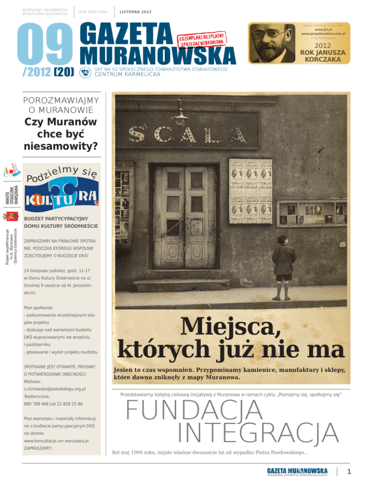 09 MURANOWSKA BEZPŁATNY INFORMATOR SPOŁECZNO-KULTURALNY ISSN 2082-4289 LISTOPAD 2012 GAZETA /2012 (20) Więcej informacji na stronach: www.jhi.pl www.przystanekkorczak.pl i na Facebooku 2012 ROK JANUSZA KORCZAKA SKT NR 52 SPOŁECZNEGO TOWARZYSTWA OŚWIATOWEGO CENTRUM KARMELICKA POROZMAWIAJMY O MURANOWIE Czy Muranów chce być niesamowity? Projekt współfinansuje m.st. Warszawa - Dzielnica Śródmieście BUDŻET PARTYCYPACYJNY DOMU KULTURY ŚRÓDMIEŚCIE ZAPRASZAMY NA FINAŁOWE SPOTKANIE, PODCZAS KTÓREGO WSPÓLNIE ZDECYDUJEMY O BUDŻECIE DKŚ! 24 listopada (sobota), godz. 11-17 w Domu Kultury Śródmieście na ul. Smolnej 9 (wejście od Al. Jerozolimskich) Plan spotkania: - podsumowanie wcześniejszych etapów projektu - dyskusja nad wariantami budżetu DKŚ wypracowanymi we wrześniu i październiku - głosowanie i wybór projektu budżetu SPOTKANIE JEST OTWARTE. PROSIMY O POTWIERDZANIE OBECNOŚCI: Mailowo: [email protected] Telefonicznie: 880 788 468 lub 22 826 25 86 Plan warsztatu i materiały informacyjne o budżecie partycypacyjnym DKŚ na stronie: www.konsultacje.um.warszawa.pl ZAPRASZAMY! Miejsca, których już nie ma Jesień to czas wspomnień. Przypominamy kamienice, manufaktury i sklepy, które dawno zniknęły z mapy Muranowa. FUNDACJA INTEGRACJA Przedstawiamy kolejną ciekawą inicjatywę z Muranowa w ramach cyklu „Poznajmy się, spotkajmy się” Był maj 1994 roku, mijało właśnie dwanaście lat od wypadku Piotra Pawłowskiego... GAZETA MURANOWSKA MURANOWSKI INFORMATOR SPOŁECZNO-KULTURALNY 1 2012 ROK JANUSZA KORCZAKA Gazeta Muranowska POROZMAWIAJMY O MURANOWIE Chyba o żadnym innym warszawskim mordowanych, bo „w witrynach skle- osiedlu nie krąży tyle miejskich legend pów co rusz pojawiają się kartki: lokal co o Muranowie: na przykład że tu stra- do wynajęcia”? Moim zdaniem to wy- szy, że duchy getta wypędzają stąd ciąganie błędnych wniosków. Raz, bo każdego, kto chciałby otworzyć restau- mamy przecież kryzys. Dwa, bo dzia- rację lub prowadzić klub. Ot, mniejsze i ła silna konkurencja – w końcu ile na większe wyssane z palca historie, któ- jednej ulicy może istnieć sklepów spo- re powtarzają żądni rozgłosu tropicie- żywczych? Trzy, bo dla przedsiębior- le niesamowitości. Pewnie nie zwróciły- ców Muranów jest nieatrakcyjny ze by one mojej uwagi, gdyby nie zatoczy- względu na jego położenie – ani to ły niedawno szerszego kręgu. Zaczę- miejsce turystyczne, ani tym bardziej ło się niewinnie od pokazywanego jakiś biznesowe. Że po wojnie Żydzi nie czas temu w TVN Warszawa sensacyj- chcieli tu wracać? Również wielu nie- nego cyklu „Przeklęte rewiry” – w odcin- żydowskich mieszkańców przedwo- ku o Muranowie mowa o zjawiskach pa- jennej Warszawy miało ku temu opo- ranormalnych, przez które wielu miesz- ry, ba, nie tylko na Muranowie, ale i kańców osiedla miało rzekomo wypro- w ogóle w stolicy nie chcieli ponownie wadzić się do innych dzielnic. Dziś nie- zamieszkać. Że wreszcie osiedle po- samowitości Muranowa roztrząsane są budowane zostało na cmentarzysku? w wiodących gazetach w kraju - w jed- Jak cała Warszawa. O Muranowie utar- nym z październikowych wydań Sto- ło się mówić, że stoi na ruinach get- łecznej Gazety Wyborczej uderzył mnie ta, ale pamiętajmy, że getto ciągnę- wywiad „Widmowy Muranów”. A chwilę ło się z jednej strony aż do Okopowej, potem w Newsweeku artykuł „Muranów z drugiej prawie pod obecny Dworzec próbuje mówić”. I znów te same krzyw- Centralny. Na ruinach dawnej dziel- dzące moim zdaniem opinie o Murano- nicy zamkniętej stoi więc także osie- wie: że jest dziwny, nienaturalny, że dle za Żelazną Bramą, modne biurow- kryje się w nim coś niepokojącego, że ce Atrium i wieżowiec Rondo 1. Czy w krajobrazie dominuje śmierć. Albo, że o nich też powiemy, że kryją w sobie to „przeklęta w swej martwocie dzielni- śmierć? Chyba nie. Skąd więc takie ca dresiarzy i staruszek.” zdanie o Muranowie? Co do tej ostatniej opinii, jej autor chy- Dla mnie to raczej spokojne, pełne ba dawno na Muranowie nie był. Jestem zieleni osiedle. Niby w centrum mia- mieszkanką tego osiedla od trzech lat i sta, a przecież tak ciche jakby istnia- żadnego dresiarza jeszcze tu nie widzia- ło na peryferiach. To tradycje księgar- łam. Staruszki? Jest ich tyle samo co w skie i antykwaryczne, XVIII-wieczne Śródmieściu Południowym czy na Moko- bale w ogrodzie pałacu Krasińskich, towie – w dzielnicach z zasady swej sta- obiady czwartkowe w Pałacu Błękit- rych i na tyle drogich, że niewielu mło- nym (zanim przeniosły się do Łazie- dych ludzi stać na kupienie tu mieszka- nek) i znakomite występy Szpilmana nia. Dzielnicach, dodajmy, które jednak w kawiarni „Sztuka”. Handlowy gwar stopniowo młodnieją - wystarczy zja- na Nalewkach i uliczny rejwach na wić się na Muranowie w letnie miesią- Nowolipiu. Wreszcie ciekawa archi- ce, by na podwórkach ujrzeć całe stad- tektura i spektakularna odbudowa, z ka biegających dzieci i ich rodziców lub którą wiązano nowe nadzieje. A le- przejść się o 11.00 na spacer, by spo- gendy o podziemnym mieście czy zja- tkać kilkanaście mam z wózkami. Jak wiskach paranormalnych to nic inne- widać, można tu żyć normalnie, skoro go, jak szukanie newsów i dorabianie pod oknami rośnie w oczach młode po- ideologii. Czy na pewno trzeba Mura- kolenie. nów na siłę ubarwiać i czynić niesamowitym? Może wcale niesamowity „Dzielnica przeklęta w swej martwo- być nie chce? cie”? Chyba nie bardziej niż Białołęka czy Targówek. Wyklęta przez po- 2 GAZETA MURANOWSKA MURANOWSKI INFORMATOR SPOŁECZNO-KULTURALNY Monika Utnik-Strugała Wersję elektroniczną Gazety Muranowskiej oraz numery archiwalne można pobrać ze strony: www.gm.muranow.waw.pl Więcej kultury: www.centrumkarmelicka.waw.pl Więcej informacji na stronach: www.jhi.pl, www.przystanekkorczak.pl i na Facebooku serde