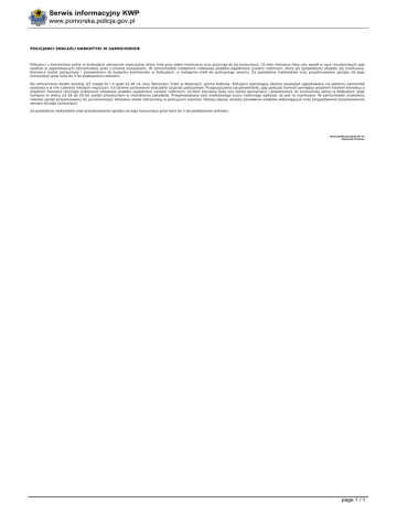 Serwis informacyjny KWP www.pomorska.policja.gov.pl POLICJANCI ZNALEŹLI NARKOTYKI W SAMOCHODZIE Policjanci z komisariatu policji w Kolbudach zatrzymali mężczyznę, który miał przy sobie marihuanę oraz przyrząd do jej konsumpcji. 21-letni kierowca fiata uno wpadł w ręce mundurowych gdy siedział w zaparkowanym samochodzie wraz z trzema kompanami. W samochodzie znaleziono metalowe pudełko wypełnione suszem roślinnym, który po sprawdzeniu okazało się marihuaną. Kierowca został zatrzymany i przewieziony do budynku komisariatu w Kolbudach, a następnie trafił do policyjnego aresztu. Za posiadanie narkotyków oraz przystosowanie sprzętu do jego konsumpcji grozi kara do 3 lat pozbawienia wolności. Do zatrzymania doszło wczoraj (27 lutego br.) o godz.12.30 na ulicy Słoneczny Trakt w Nowinach, gmina Kolbudy. Policjanci patrolujący okolicę zauważyli zaparkowany na poboczu samochód osobowy a w nim czterech młodych mężczyzn. Ich dziwne zachowanie wzbudziło czujność policjantów. Przypuszczenia się potwierdziły, gdy podczas kontroli pomiędzy przednim fotelem kierowcy a drążkiem hamulca ręcznego znaleziono metalowe pudełko wypełnione suszem roślinnym. 21-letni kierowca fiata uno został zatrzymany i przewieziony do komisariatu policji w Kolbudach. Jego kompani w wieku od 18 do 20 lat zostali przesłuchani w charakterze świadków. Przeprowadzony test znalezionego suszu roślinnego wykazał, że jest to marihuana. W samochodzie znaleziono również sprzęt przystosowany do jej konsumpcji. Kierowca został zatrzymany w policyjnym areszcie. Dzisiaj usłyszy zarzuty posiadania środków zadurzających oraz przygotowania przystosowania sprzętu do jego konsumpcji. Za posiadanie narkotyków oraz przystosowanie sprzętu do jego konsumpcji grozi kara do 3 lat pozbawienia wolności. Data publikacji:2014-02-27 Rzecznik Prasowy page 1 / 1 Powered by TCPDF (www.tcpdf.org)