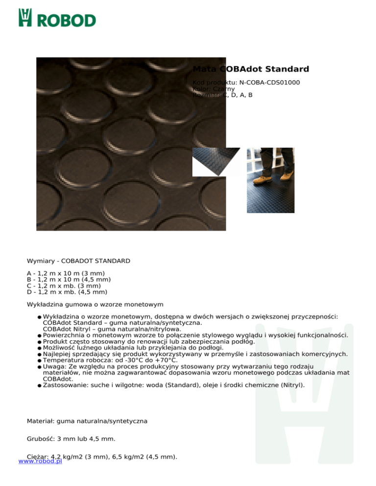 Mata COBAdot Standard Kod produktu: N-COBA-CDS01000 Kolor: Czarny Rozmiar: C, D, A, B Wymiary - COBADOT STANDARD A - 1,2 m x 10 m (3 mm) B - 1,2 m x 10 m (4,5 mm) C - 1,2 m x mb. (3 mm) D - 1,2 m x mb. (4,5 mm) Wykładzina gumowa o wzorze monetowym Wykładzina o wzorze monetowym, dostępna w dwóch wersjach o zwiększonej przyczepności: COBAdot Standard – guma naturalna/syntetyczna. COBAdot Nitryl – guma naturalna/nitrylowa. ● Powierzchnia o monetowym wzorze to połączenie stylowego wyglądu i wysokiej funkcjonalności. ● Produkt często stosowany do renowacji lub zabezpieczania podłóg. ● Możliwość luźnego układania lub przyklejania do podłogi. ● Najlepiej sprzedający się produkt wykorzystywany w przemyśle i zastosowaniach komercyjnych. ● Temperatura robocza: od -30°C do +70°C. ● Uwaga: Ze względu na proces produkcyjny stosowany przy wytwarzaniu tego rodzaju materiałów, nie można zagwarantować dopasowania wzoru monetowego podczas układania mat COBAdot. ● Zastosowanie: suche i wilgotne: woda (Standard), oleje i środki chemiczne (Nitryl). ● Materiał: guma naturalna/syntetyczna Grubość: 3 mm lub 4,5 mm. Ciężar: 4,2 kg/m2 (3 mm), 6,5 kg/m2 (4,5 mm). www.robod.pl Kolory: czarny. www.robod.pl