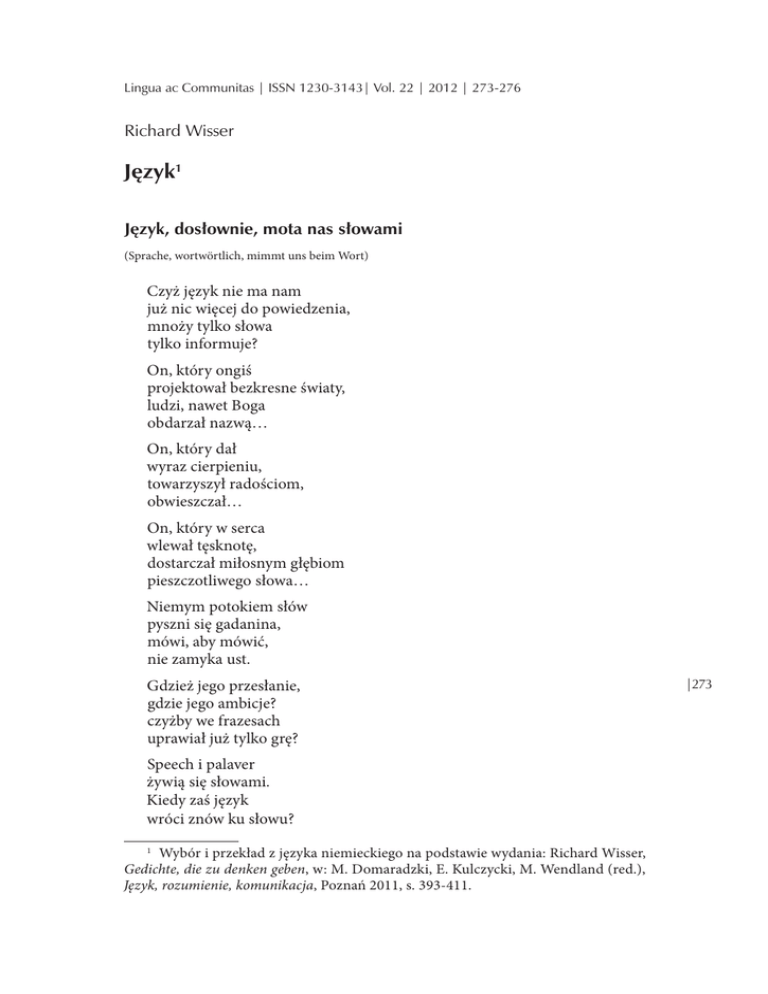 Lingua ac Communitas | ISSN 1230-3143| Vol. 22 | 2012 | 273-276 Richard Wisser Język1 Język, dosłownie, mota nas słowami (Sprache, wortwörtlich, mimmt uns beim Wort) Czyż język nie ma nam już nic więcej do powiedzenia, mnoży tylko słowa tylko informuje? On, który ongiś projektował bezkresne światy, ludzi, nawet Boga obdarzał nazwą… On, który dał wyraz cierpieniu, towarzyszył radościom, obwieszczał… On, który w serca wlewał tęsknotę, dostarczał miłosnym głębiom pieszczotliwego słowa… Niemym potokiem słów pyszni się gadanina, mówi, aby mówić, nie zamyka ust. Gdzież jego przesłanie, gdzie jego ambicje? czyżby we frazesach uprawiał już tylko grę? Speech i palaver żywią się słowami. Kiedy zaś język wróci znów ku słowu? 1 Wybór i przekład z języka niemieckiego na podstawie wydania: Richard Wisser, Gedichte, die zu denken geben, w: M. Domaradzki, E. Kulczycki, M. Wendland (red.), Język, rozumienie, komunikacja, Poznań 2011, s. 393-411. |273 Richard Wisser Wiersz idzie za głosem (Der Stimme entspricht das Gedicht) Urzekające strofy, wiersze, ich rytm wprawia w ruch, do głosu dochodzi niewypowiedzialne, słowo trafia w serce rzeczy. Myśli wznoszą budowle. Wiersze wiodą ku istocie, torują drogę, kreują naoczność, blisko pierwotności, gotowe do skoku. Ulotny ich byt nas trąca, ich dźwięk, ich pieśń proszą do tańca. Ucho nasłuchuje to, co nigdy niesłyszane i daje się nieść postępowi. Dźwięki są sługą wyrazu. Treść i forma, wy razem, Równo dalekie paplaniu i śpiewaninie, ostańcie się pośród czasu. Myśli celują w punkt. Wiersze są skaczącymi punktami, wstrzymują dech w piersiach, odkrywają i skrywają zarazem. „Myśliciel” staje przed czymś w zadumie. Co tworzy dźwiękiem poeta? Powrót do źródeł się liczy. Skok ten się dzieje w poezji. 274| Wiersze są głosem tęsknoty, „tajemnym” powrotem w istotę, ujmują słowem pierwotność, ratują świata jednię. Przekład: Bolesław Andrzejewski Lingua ac Communitas | ISSN 1230-3143| Vol. 22 | 2012 | 273-276 Abstract What is the difference between language and chatter of today? The genuine language (of yesterday) has the power „to create the endless worlds, to give names of God and mans, to show the depth of human emotions”. Nowadays can language „only inform and multiply the words”. We should bring the former language back to life. One can interpret the following poems in the key of symbolic philosophy (constructivism) or in the key of romantic philosophy (universal communication). Key words: Language, the essence of language, language against chatter |275