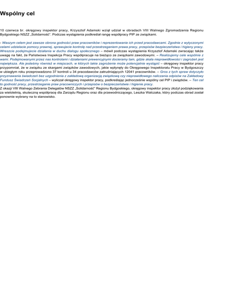 Wspólny cel 10 czerwca br. okręgowy inspektor pracy, Krzysztof Adamski wziął udział w obradach VIII Walnego Zgromadzenia Regionu Bydgoskiego NSZZ „Solidarność”. Podczas wystąpienia podkreślał rangę współpracy PIP ze związkami. - Waszym celem jest zawsze obrona godności praw pracowników i reprezentowanie ich przed pracodawcami. Zgodnie z wytyczonymi celami udzielacie pomocy prawnej, sprawujecie kontrolę nad przestrzeganiem prawa pracy, przepisów bezpieczeństwa i higieny pracy. Wreszcie podejmujecie działania w duchu dialogu społecznego – mówił podczas wystąpienia Krzysztof Adamski zwracając także uwagę na fakt, że Państwowa Inspekcja Pracy współpracuje na bieżąco ze związkami zawodowymi. – Realizujemy cele wspólnie z wami. Podejmowanymi przez nas kontrolami i działaniami prewencyjnymi docieramy tam, gdzie skala nieprawidłowości i zagrożeń jest największa. Ale jesteśmy również w miejscach, w których takie zagrożenie może potencjalnie wystąpić – okręgowy inspektor pracy przypomniał, że w związku ze skargami związków zawodowych, jakie wpłynęły do Okręgowego Inspektoratu Pracy w Bydgoszczy w ubiegłym roku przeprowadzono 37 kontroli u 34 pracodawców zatrudniających 12041 pracowników. – Gros z tych spraw dotyczyło przyznawania świadczeń bez uzgodnienia z zakładową organizacją związkową czy nieprawidłowego naliczania odpisów na Zakładowy Fundusz Świadczeń Socjalnych – wyliczał okręgowy inspektor pracy, podkreślając jednocześnie wspólny cel PIP i związków. – Ten cel to godność pracy, przestrzeganie praw pracowniczych i przepisów o bezpieczeństwie i higienie pracy. Z okazji VIII Walnego Zebrania Delegatów NSZZ „Solidarność” Regionu Bydgoskiego, okręgowy inspektor pracy złożył podziękowania za wieloletnią, skuteczną współpracę dla Zarządu Regionu oraz dla przewodniczącego, Leszka Walczaka, który podczas obrad został ponownie wybrany na to stanowisko.