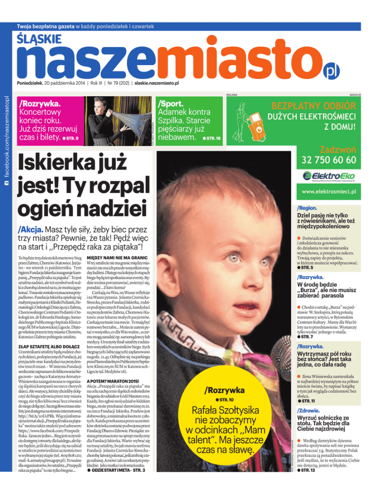 Twoja bezpłatna gazeta w każdy poniedziałek i czwartek ŚLĄSKIE Poniedziałek, 20 października 2014 | Rok III | Nr 79 (202) | slaskie.naszemiasto.pl /Rozrywka. Koncertowy koniec roku. Już dziś rezerwuj czas i bilety. A STR. 9 FOT. MAT. PRASOWE 004524139 /Sport. Adamek kontra Szpilka. Starcie pięściarzy już niebawem. A STR. 16 Iskierkajuż jest!Tyrozpal ogieńnadziei /Region. Dziel pasję nie tylko z rówieśnikami, ale też międzypokoleniowo /Akcja. Masz tyle siły, żeby biec przez trzy miasta? Pewnie, że tak! Pędź więc na start i ,,Przepędź raka za piątaka”! To będzie trzydziestokilometrowy bieg przezZabrze,ChorzówiKatowice.Jużjutro - we wtorek 21 października. Tym bigiemFundacjaIskierkainaugurujekampanię,,Przepędźrakazapiątaka”.Tojest sztafetanadziei,aleteżsymbolwoliwalkizchorobąidowódnato,żemożnająpokonać.Trasaniezostaławyznaczonaprzypadkowo.FundacjaIskierkaopiekujesię małymipacjentamizKlinikiPediatrii,HematologiiiOnkologiiDziecięcejzZabrza, ChorzowskiegoCentrumPediatriiiOnkologiiim.drEdwardaHankego,SamodzielnegoPublicznegoSzpitalaKlinicznegoŚUMwkatowickiejLigocie.Dlategowłaśnieprzeztetrzymiasta:Chorzów, KatowiceiZabrzepobiegniesztafeta. ZŁAP SZTAFETĘ ALBO DOŁĄCZ Uczestnikamisztafetybędąrodzicechorychdzieci,podopiecznychFundacji,jej przyjacieleoraz kandydacinaprezydentów trzech miast. - W imieniu Fundacji serdeczniezapraszamdokibicowaniabiegaczom - zachęca Katarzyna ArmatysWiśniewskazaangażowanaworganizację śląskiej kampanii na rzecz chorych dzieci.Alewszyscy,którzychcielibydołączyć dobiegu zdrowia przez trzy miasta mogą nie tylko kibicować lecz również doniegodołączyć.Szczegółowatrasasztafetyjestdostępnanastronieinternetowej: http://bit.ly/10UcPRk. Więcejinformacjinatematakcji,,Przepędźrakazapiątaka” można także znaleźć pod adresem: https://www.facebook.com/Przepedz Raka. Ijeszczejedno...Biegjestoczywiściedostępnyiotwartydlakażdego,alefajnie będzie, jeśli decydując się na udział w sztafecie potwierdzisz uczestnictwo wwybranymjejetapie(tel. 609808120; [email protected]).Toważne dlaorganizatorów,bosztafeta,,Przepędź rakazapiątaka”tonietylkobiegnie... a Doświadczenie seniorów i młodzieńcza gotowość do działania to nie mieszanka wybuchowa, a przepis na sukces. Trwają zapisy do projektu, w którym możecie współpracować. A STR. 5 MIĘDZY NAMI NIE MA GRANIC Wtej sztafecieniemagranicmiędzymiastamiiniemaichprzedewszystkimmiędzyludźmi.Dlategonakolejnychetapach biegu będąteżspotkaniaorazeventy.Będziemożnaporozmawiać,zwierzyćsię, poradzić...Zkimikomu? Czekają na Was, na Wasze refleksje i na Wasze pytania: Jolanta CzernickaSiwecka,prezesFundacjiIskierka, rodzice podopiecznych Fundacji, kandydaci naprezydentówZabrza,ChorzowaiKatowic oraz lekarze małych pacjentów. Czekająnatrasieinamecie. Tomająbyć rozmowybeztabu...Możeciezatempytaćowszystko,codlaWasważne,aczemumogązaradzićnp.samorządowcylub medycy.Uroczystyfinał sztafetyzudziałemwszystkichuczestnikówbiegu (tych biegnącychikibicujących)zaplanowano nagodz. 21.45.Odbędziesię naparkingu przedSamodzielnymPublicznymSzpitalem Klinicznym ŚUM w Katowicach Ligocie(ul.Medyków16). A POTEM? MARATON 2015! Akcja „Przepędź raka za piątaka” ma naceluzachęcenieśląskichmiłośników bieganiadoudziałuwŁódźMaraton2015. Każdy, kto zgłosi swój udział w łódzkim biegu,możeprzekazaćdarowiznęm.in. narzecz Fundacji Iskierka. Przelew jest dobrowolny,aminimalnakwotato 5złotych. Każda przekazana przez uczestnikówzłotówkazostaniepodwojonaprzez FundacjęDbamoZdrowie.Pieniądze zostanąprzeznaczonenasprzętmedyczny dlaFundacjiIskierka.Warto wybraćsię na trasę sztafety, bo jak mawia szefowa Fundacji Jolanta Czernicka-Siwecka chorobę łatwiejpokonać,jeślizrobisięztegozabawę.Amówi taknawłasnymprzykładzie. Jakomatkaiwolontariuszka. A GDZIESTARTIMETA- STR. 3 /Rozrywka. W środę będzie ,,Burza”, ale nie musisz zabierać parasola a Chodzi o sztukę ,,Burza” na podstawie W. Szekspira, którą pokażą warszawscy artyści, w Bytomskim Centrum Kultury . Mamy dla Was bilety na to przedstawienie. Wystarczy tylko wysłać jednego e-maila. A STR. 7 /Rozrywka. Wytrzymasz pół roku bez słońca? Jest taka jedna, co dała radę a Ilona Wiśniewska zamieszkała w najbardziej wysuniętym na północ mieście świata, by napisać książkę o tym jak wygląda codzienność bez słońca. A STR. 11 /Rozrywka A STR. 10 Rafała Szołtysika nie zobaczymy w odcinkach ,,Mam talent”. Ma jeszcze czas na sławę. /Zdrowie. Wyrzuć solniczkę ze stołu. Tak będzie dla Ciebie najzdrowiej FOT. MATERIAŁY PRYWATNE facebook.com/naszemiastopl REKLAMA a Według dietetyków dzienna dawka spożywania soli nie powinna przekraczać 5 g. Statystyczny Polak przekracza ją ponaddwukrotnie. Jeśli myślisz, że te wyliczenia Ciebie nie dotyczą, jesteś w błędzie. A STR. 13 facebook.com/naszemiastopl | slaskie.naszemiasto.pl 60 SEKUND Chłopaki mają jeszcze dość benzyny w baku. A czy wypada w tym wieku grać jeszcze rockandrolla, nie mam doprawdy pojęcia. Nieobliczalność była i pozostaje nadal naszym znakiem firmowym. Keith Richards, gitarzysta The Rolling Stones, dla Onetu Kraj i świat z „Dziennikiem Zachodnim“ /Łódź. a Na niecodzienny pomysł wpadł Łukasz Rudnicki, mechanik z Łodzi. Mężczyzna miał już dość poruszania się samochodem po dziurawych drogach, dlatego chwycił za puszkę z farbą i oznaczył nią aż 250 dziur. W ten sposób chciał zaprotestować przeciwko niespełnionym obietnicom remontu jednej z łódzkich ulic. Jak donosi „Express Ilustrowany” mechanik w specjalnym piśmie zaprosił miejskich urzędników do obejrzenia swych oznaczeń. Podejrzewa jednak, że nie przyjadą. To nie pierwszy protest pana Łukasza. W ubiegłym roku przed wjazdem w ulicę Zbąszyńską od strony ul. Limanowskiego umieścił spo- FOT. WOJCIECH MATUSIK Społecznik walczy z dziurami w drogach rych rozmiarów tab