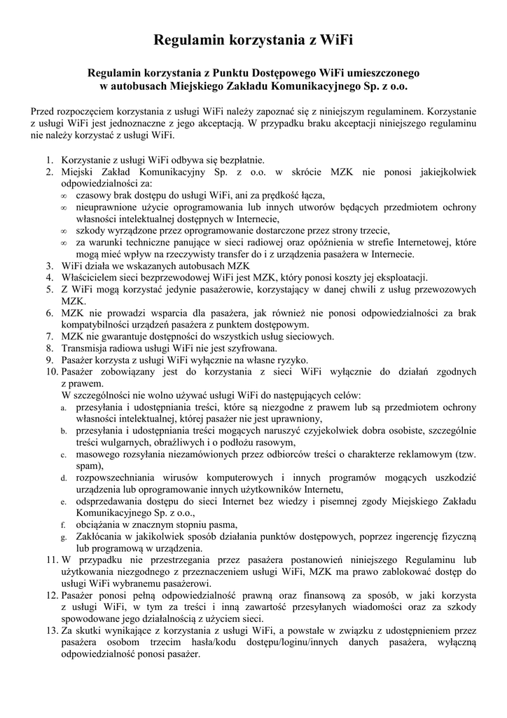 Regulamin korzystania z WiFi Regulamin korzystania z Punktu Dostępowego WiFi umieszczonego w autobusach Miejskiego Zakładu Komunikacyjnego Sp. z o.o. Przed rozpoczęciem korzystania z usługi WiFi należy zapoznać się z niniejszym regulaminem. Korzystanie z usługi WiFi jest jednoznaczne z jego akceptacją. W przypadku braku akceptacji niniejszego regulaminu nie należy korzystać z usługi WiFi. 1. Korzystanie z usługi WiFi odbywa się bezpłatnie. 2. Miejski Zakład Komunikacyjny Sp. z o.o. w skrócie MZK nie ponosi jakiejkolwiek odpowiedzialności za: • czasowy brak dostępu do usługi WiFi, ani za prędkość łącza, • nieuprawnione użycie oprogramowania lub innych utworów będących przedmiotem ochrony własności intelektualnej dostępnych w Internecie, • szkody wyrządzone przez oprogramowanie dostarczone przez strony trzecie, • za warunki techniczne panujące w sieci radiowej oraz opóźnienia w strefie Internetowej, które mogą mieć wpływ na rzeczywisty transfer do i z urządzenia pasażera w Internecie. 3. WiFi działa we wskazanych autobusach MZK 4. Właścicielem sieci bezprzewodowej WiFi jest MZK, który ponosi koszty jej eksploatacji. 5. Z WiFi mogą korzystać jedynie pasażerowie, korzystający w danej chwili z usług przewozowych MZK. 6. MZK nie prowadzi wsparcia dla pasażera, jak również nie ponosi odpowiedzialności za brak kompatybilności urządzeń pasażera z punktem dostępowym. 7. MZK nie gwarantuje dostępności do wszystkich usług sieciowych. 8. Transmisja radiowa usługi WiFi nie jest szyfrowana. 9. Pasażer korzysta z usługi WiFi wyłącznie na własne ryzyko. 10. Pasażer zobowiązany jest do korzystania z sieci WiFi wyłącznie do działań zgodnych z prawem. W szczególności nie wolno używać usługi WiFi do następujących celów: a. przesyłania i udostępniania treści, które są niezgodne z prawem lub są przedmiotem ochrony własności intelektualnej, której pasażer nie jest uprawniony, b. przesyłania i udostępniania treści mogących naruszyć czyjekolwiek dobra osobiste, szczególnie treści wulgarnych, obraźliwych i o podłożu rasowym, c. masowego rozsyłania niezamówionych przez odbiorców treści o charakterze reklamowym (tzw. spam), d. rozpowszechniania wirusów komputerowych i innych programów mogących uszkodzić urządzenia lub oprogramowanie innych użytkowników Internetu, e. odsprzedawania dostępu do sieci Internet bez wiedzy i pisemnej zgody Miejskiego Zakładu Komunikacyjnego Sp. z o.o., f. obciążania w znacznym stopniu pasma, g. Zakłócania w jakikolwiek sposób działania punktów dostępowych, poprzez ingerencję fizyczną lub programową w urządzenia. 11. W przypadku nie przestrzegania przez pasażera postanowień niniejszego Regulaminu lub użytkowania niezgodnego z przeznaczeniem usługi WiFi, MZK ma prawo zablokować dostęp do usługi WiFi wybranemu pasażerowi. 12. Pasażer ponosi pełną odpowiedzialność prawną oraz finansową za sposób, w jaki korzysta z usługi WiFi, w tym za treści i inną zawartość przesyłanych wiadomości oraz za szkody spowodowane jego działalnością z użyciem sieci. 13. Za skutki wynikające z korzystania z usługi WiFi, a powstałe w związku z udostępnieniem przez pasażera osobom trzecim hasła/kodu dostępu/loginu/innych danych pasażera, wyłączną odpowiedzialność ponosi pasażer. 14. Pasażerowi nie przysługują żadne roszczenia z tytułu czasowego bądź stałego braku sygnału internetowego lub ograniczenia przepustowości łącza wynikającego z wyłączenia lub problemów technicznych z nadajnikiem. 15. MZK nie odpowiada za politykę ochrony prywatności innych stron internetowych. 16. MZK zastrzega sobie prawo do wprowadzenia zmian w niniejszym regulaminie. Z tego tytułu pasażerowi nie przysługują żadne roszczenia. 17. Pasażer może: a. zgłaszać nieprawidłowe jego zdaniem działanie sieci WiFi w autobusach wraz z podaniem: • numeru bocznego autobusu, • godziny i daty, • miejsca lub obszaru ulic na których wystąpiło zdarzenie, • rodzaju i modelu posiadanego sprzętu, b. poprosić o pomoc w zdiagnozowaniu problemu przy połączeniu*. 18. W sprawach nieuregulowanych niniejszym regulaminem mają zastosowanie przepisy Kodeksu Cywilnego. 19. Właściwym sądem do rozstrzygania sporów wynikających z użytkowania sieci WiFi będzie sąd powszechny usytuowany ze względu na siedzibę MZK. *diagnoza sprzętu może być przeprowadzona przez uprawnionego pracownika MZK Sp. z o.o. w godz. 8 – 14, od Poniedziałku do Piątku w siedzibie spółki przy ul. Luboszyckiej 19 po wcześniejszym umówieniu się i zarezerwowaniu terminu.