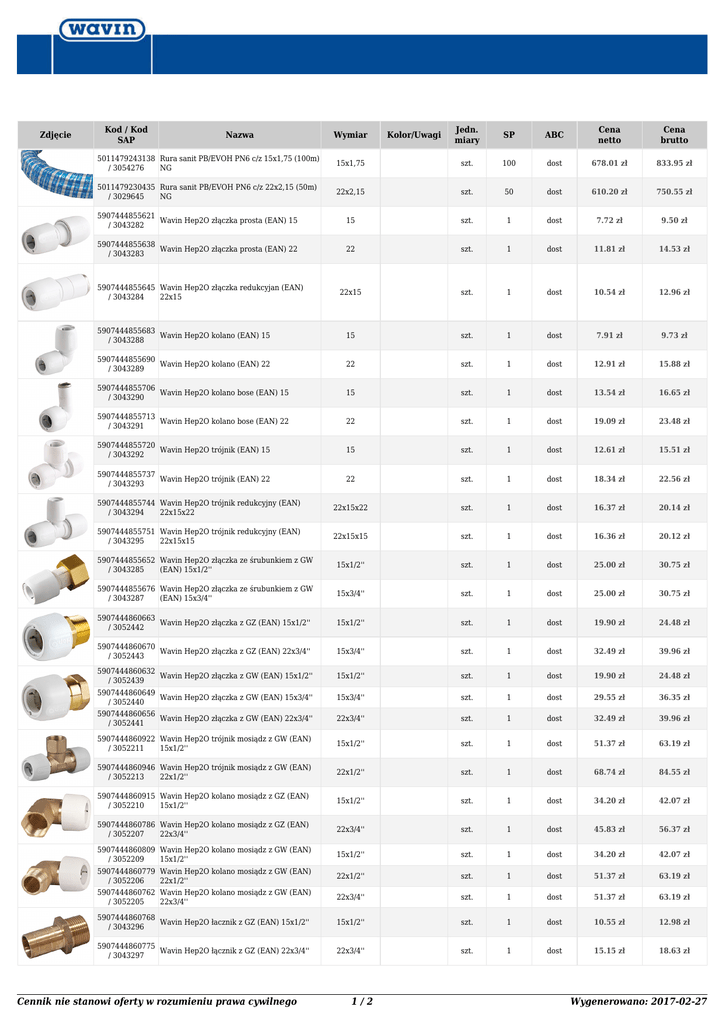 Zdjęcie Kod / Kod SAP Nazwa Wymiar Kolor/Uwagi Jedn. miary SP ABC Cena netto Cena brutto 5011479243138 Rura sanit PB/EVOH PN6 c/z 15x1,75 (100m) / 3054276 NG 15x1,75 szt. 100 dost 678.01 zł 833.95 zł 5011479230435 Rura sanit PB/EVOH PN6 c/z 22x2,15 (50m) / 3029645 NG 22x2,15 szt. 50 dost 610.20 zł 750.55 zł 5907444855621 Wavin Hep2O złączka prosta (EAN) 15 / 3043282 15 szt. 1 dost 7.72 zł 9.50 zł 5907444855638 Wavin Hep2O złączka prosta (EAN) 22 / 3043283 22 szt. 1 dost 11.81 zł 14.53 zł 22x15 szt. 1 dost 10.54 zł 12.96 zł 5907444855683 Wavin Hep2O kolano (EAN) 15 / 3043288 15 szt. 1 dost 7.91 zł 9.73 zł 5907444855690 Wavin Hep2O kolano (EAN) 22 / 3043289 22 szt. 1 dost 12.91 zł 15.88 zł 5907444855706 Wavin Hep2O kolano bose (EAN) 15 / 3043290 15 szt. 1 dost 13.54 zł 16.65 zł 5907444855713 Wavin Hep2O kolano bose (EAN) 22 / 3043291 22 szt. 1 dost 19.09 zł 23.48 zł 5907444855720 Wavin Hep2O trójnik (EAN) 15 / 3043292 15 szt. 1 dost 12.61 zł 15.51 zł 5907444855737 Wavin Hep2O trójnik (EAN) 22 / 3043293 22 szt. 1 dost 18.34 zł 22.56 zł 5907444855744 Wavin Hep2O trójnik redukcyjny (EAN) / 3043294 22x15x22 22x15x22 szt. 1 dost 16.37 zł 20.14 zł 5907444855751 Wavin Hep2O trójnik redukcyjny (EAN) / 3043295 22x15x15 22x15x15 szt. 1 dost 16.36 zł 20.12 zł 5907444855652 Wavin Hep2O złączka ze śrubunkiem z GW / 3043285 (EAN) 15x1/2'' 15x1/2'' szt. 1 dost 25.00 zł 30.75 zł 5907444855676 Wavin Hep2O złączka ze śrubunkiem z GW / 3043287 (EAN) 15x3/4'' 15x3/4'' szt. 1 dost 25.00 zł 30.75 zł 5907444860663 Wavin Hep2O złączka z GZ (EAN) 15x1/2'' / 3052442 15x1/2'' szt. 1 dost 19.90 zł 24.48 zł 5907444860670 Wavin Hep2O złączka z GZ (EAN) 22x3/4'' / 3052443 15x3/4'' szt. 1 dost 32.49 zł 39.96 zł 5907444860632 Wavin Hep2O złączka z GW (EAN) 15x1/2'' / 3052439 15x1/2'' szt. 1 dost 19.90 zł 24.48 zł 5907444860649 Wavin Hep2O złączka z GW (EAN) 15x3/4'' / 3052440 15x3/4'' szt. 1 dost 29.55 zł 36.35 zł 5907444860656 Wavin Hep2O złączka z GW (EAN) 22x3/4'' / 3052441 22x3/4'' szt. 1 dost 32.49 zł 39.96 zł 5907444860922 Wavin Hep2O trójnik mosiądz z GW (EAN) / 3052211 15x1/2'' 15x1/2'' szt. 1 dost 51.37 zł 63.19 zł 5907444860946 Wavin Hep2O trójnik mosiądz z GW (EAN) / 3052213 22x1/2'' 22x1/2'' szt. 1 dost 68.74 zł 84.55 zł 5907444860915 Wavin Hep2O kolano mosiądz z GZ (EAN) / 3052210 15x1/2'' 15x1/2'' szt. 1 dost 34.20 zł 42.07 zł 5907444860786 Wavin Hep2O kolano mosiądz z GZ (EAN) / 3052207 22x3/4'' 22x3/4'' szt. 1 dost 45.83 zł 56.37 zł 5907444860809 Wavin Hep2O kolano mosiądz z GW (EAN) / 3052209 15x1/2'' 15x1/2'' szt. 1 dost 34.20 zł 42.07 zł 5907444860779 Wavin Hep2O kolano mosiądz z GW (EAN) / 3052206 22x1/2'' 22x1/2'' szt. 1 dost 51.37 zł 63.19 zł 5907444860762 Wavin Hep2O kolano mosiądz z GW (EAN) / 3052205 22x3/4'' 22x3/4'' szt. 1 dost 51.37 zł 63.19 zł 5907444860768 Wavin Hep2O łacznik z GZ (EAN) 15x1/2'' / 3043296 15x1/2'' szt. 1 dost 10.55 zł 12.98 zł 5907444860775 Wavin Hep2O łącznik z GZ (EAN) 22x3/4'' / 3043297 22x3/4'' szt. 1 dost 15.15 zł 18.63 zł 5907444855645 Wavin Hep2O złączka redukcyjan (EAN) / 3043284 22x15 Cennik nie stanowi oferty w rozumieniu prawa cywilnego 1/2 Wygenerowano: 2017-02-27 Zdjęcie Kod / Kod SAP Nazwa Wymiar Kolor/Uwagi Jedn. miary SP ABC Cena netto Cena brutto 5907444855782 Wavin Hep2O łacznik z GW (EAN) 15x1/2'' / 3043298 15x1/2'' szt. 1 dost 13.39 zł 16.47 zł 5907444855799 Wavin Hep2O łącznik z GW (EAN) 22x3/4'' / 3043299 22x3/4'' szt. 1 dost 18.45 zł 22.69 zł 5907444860755 Wavin Hep2O podejście mosiądz z GW (EAN) / 3052204 15x1/2'' szt. 1 dost 21.72 zł 26.72 zł 5907444855812 Wavin Hep2O zawór c.z.w.u. (EAN) / 3043301 szt. 1 dost 25.69 zł 31.60 zł 15x3/4'' szt. 1 dost 26.40 zł 32.47 zł 22 szt. 1 dost 70.65 zł 86.90 zł 15 (5 szt. W opak.) szt. 1 dost 5.00 zł 6.15 zł 5907444855850 Wavin Hep2O tuleja wspomagająca (EAN) / 3043305 22 22 szt. 1 dost 1.17 zł 1.44 zł 5907444855881 Wavin Hep2O klucz do demontażu złączek / 3043315 (EAN) 15 15 szt. 1 dost 5.00 zł 6.15 zł 5907444855898 Wavin Hep2O klucz do demontażu złączek / 3043316 (EAN) 22 22 szt. 1 dost 5.00 zł 6.15 zł szt. 1 dost 2415.00 zł 2970.45 zł 5907444855829 Wavin Hep2O zawór c.z.w.u. z GZ (EAN) / 3043302 5907444855836 Wavin Hep2O zawór kulowy (EAN) / 3043303 5907444866023 Wavin Hep2O tuleja wspomagająca (EAN) 5 / 3067018 5907444860748 Stojak Hep2O (umowa użyczenia lub kupno) 1200x600x2200 / 4046784 Cennik nie stanowi oferty w rozumieniu prawa cywilnego 2/2 Wygenerowano: 2017-02-27