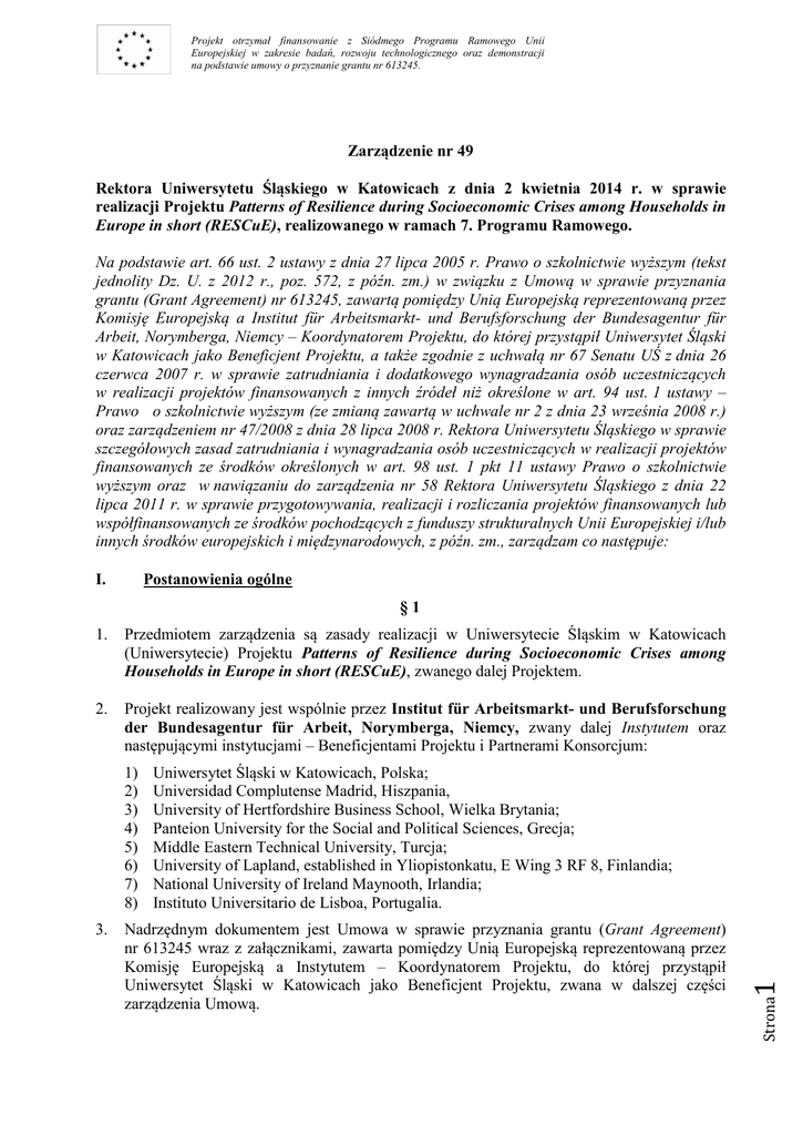 Projekt otrzymał finansowanie z Siódmego Programu Ramowego Unii Europejskiej w zakresie badań, rozwoju technologicznego oraz demonstracji na podstawie umowy o przyznanie grantu nr 613245. Zarządzenie nr 49 Rektora Uniwersytetu Śląskiego w Katowicach z dnia 2 kwietnia 2014 r. w sprawie realizacji Projektu Patterns of Resilience during Socioeconomic Crises among Households in Europe in short (RESCuE), realizowanego w ramach 7. Programu Ramowego. Na podstawie art. 66 ust. 2 ustawy z dnia 27 lipca 2005 r. Prawo o szkolnictwie wyższym (tekst jednolity Dz. U. z 2012 r., poz. 572, z późn. zm.) w związku z Umową w sprawie przyznania grantu (Grant Agreement) nr 613245, zawartą pomiędzy Unią Europejską reprezentowaną przez Komisję Europejską a Institut für Arbeitsmarkt- und Berufsforschung der Bundesagentur für Arbeit, Norymberga, Niemcy – Koordynatorem Projektu, do której przystąpił Uniwersytet Śląski w Katowicach jako Beneficjent Projektu, a także zgodnie z uchwałą nr 67 Senatu UŚ z dnia 26 czerwca 2007 r. w sprawie zatrudniania i dodatkowego wynagradzania osób uczestniczących w realizacji projektów finansowanych z innych źródeł niż określone w art. 94 ust. 1 ustawy – Prawo o szkolnictwie wyższym (ze zmianą zawartą w uchwale nr 2 z dnia 23 września 2008 r.) oraz zarządzeniem nr 47/2008 z dnia 28 lipca 2008 r. Rektora Uniwersytetu Śląskiego w sprawie szczegółowych zasad zatrudniania i wynagradzania osób uczestniczących w realizacji projektów finansowanych ze środków określonych w art. 98 ust. 1 pkt 11 ustawy Prawo o szkolnictwie wyższym oraz w nawiązaniu do zarządzenia nr 58 Rektora Uniwersytetu Śląskiego z dnia 22 lipca 2011 r. w sprawie przygotowywania, realizacji i rozliczania projektów finansowanych lub współfinansowanych ze środków pochodzących z funduszy strukturalnych Unii Europejskiej i/lub innych środków europejskich i międzynarodowych, z późn. zm., zarządzam co następuje: Postanowienia ogólne I. §1 1. Przedmiotem zarządzenia są zasady realizacji w Uniwersytecie Śląskim w Katowicach (Uniwersytecie) Projektu Patterns of Resilience during Socioeconomic Crises among Households in Europe in short (RESCuE), zwanego dalej Projektem. 2. Projekt realizowany jest wspólnie przez Institut für Arbeitsmarkt- und Berufsforschung der Bundesagentur für Arbeit, Norymberga, Niemcy, zwany dalej Instytutem oraz następującymi instytucjami – Beneficjentami Projektu i Partnerami Konsorcjum: Nadrzędnym dokumentem jest Umowa w sprawie przyznania grantu (Grant Agreement) nr 613245 wraz z załącznikami, zawarta pomiędzy Unią Europejską reprezentowaną przez Komisję Europejską a Instytutem – Koordynatorem Projektu, do której przystąpił Uniwersytet Śląski w Katowicach jako Beneficjent Projektu, zwana w dalszej części zarządzenia Umową. 1 3. Uniwersytet Śląski w Katowicach, Polska; Universidad Complutense Madrid, Hiszpania, University of Hertfordshire Business School, Wielka Brytania; Panteion University for the Social and Political Sciences, Grecja; Middle Eastern Technical University, Turcja; University of Lapland, established in Yliopistonkatu, E Wing 3 RF 8, Finlandia; National University of Ireland Maynooth, Irlandia; Instituto Universitario de Lisboa, Portugalia. Strona 1) 2) 3) 4) 5) 6) 7) 8) Projekt otrzymał finansowanie z Siódmego Programu Ramowego Unii Europejskiej w zakresie badań, rozwoju technologicznego oraz demonstracji na podstawie umowy o przyznanie grantu nr 613245. 4. II. Zgodnie z Umową Projekt realizowany jest przez 36 miesięcy od dnia 1 marca 2014 r. do dnia 28 lutego 2017 r. Realizacja Projektu §2 Projekt realizowany jest zgodnie z: 1) umową w sprawie przyznania grantu (Grant Agreement) nr 613245; 2) umową konsorcjum (Consortium Agreement); 3) przepisami zarządzenia nr 58 Rektora Uniwersytetu Śląskiego z dnia 22 lipca 2011 r. w sprawie przygotowywania, realizacji i rozliczania projektów finansowanych lub współfinansowanych ze środków pochodzących z funduszy strukturalnych Unii Europejskiej i/lub innych środków europejskich i międzynarodowych, z późn. zm.; 4) przepisami zarządzenia nr 18 Rektora Uniwersytetu Śląskiego z dnia 19 marca 2012 r. w sprawie wprowadzenia „Obiegu dokumentów dla projektów realizowanych z udziałem środków funduszy strukturalnych oraz innych środków europejskich i międzynarodowych w Uniwersytecie Śląskim w Katowicach”; 5) przepisami niniejszego zarządzenia. III. Zarządzanie Projektem §3 1. Szczegółowe zasady zarządzania Projektem, w tym wewnętrzną organizację konsorcjum, podział wkładu finansowego wspólnoty, zasady dotyczące praw własności intelektualnej i poufności oraz procedury rozstrzygania sporów określa umowa konsorcjum (Consortium Agreement), zawarta pomiędzy wszystkimi Beneficjentami Projektu. 2. Jednostką organizacyjną odpowiedzialną za realizację Projektu w Uniwersytecie Śląskim w Katowicach jest Wydział Nauk Społecznych. Władze wymienionej jednostki są zobowiązane do zapewnienia sprawnej i prawidłowej realizacji Projektu, w tym zapewnienia wkładu własnego do Projektu. 3. W celu prawidłowej realizacji przedmiotu Umowy w Uniwersytecie Śląskim w Katowicach powołuje się na okres od dnia 1 marca 2014 r. do dnia 28 lutego 2017 r., dla potrzeb zarządzania i realizacji Projektu: 1) Zespół Wykonawczy; 2) Zespół Nadzorujący. §4 Zespół Wykonawczy Projektu W skład Zespołu Wykonawczego Projektu wchodzą: Strona 2 1) Kierownik Projektu; 2) Pracownicy merytoryczni realizujący Projekt. Projekt otrzymał finansowanie z Siódmego Programu Ramowego Unii Europejskiej w zakresie badań, rozwoju technologicznego oraz demonstracji na podstawie umowy o przyznanie grantu nr 613245. §5 Kierownik Projektu Do zadań Kierownika Projektu należy w szczególności: 1) nadzór nad zgodnością realizacji Projektu z wytycznymi 7. Programu Ramowego; 2) organizowanie i nadzorowanie prawidłowości oraz 