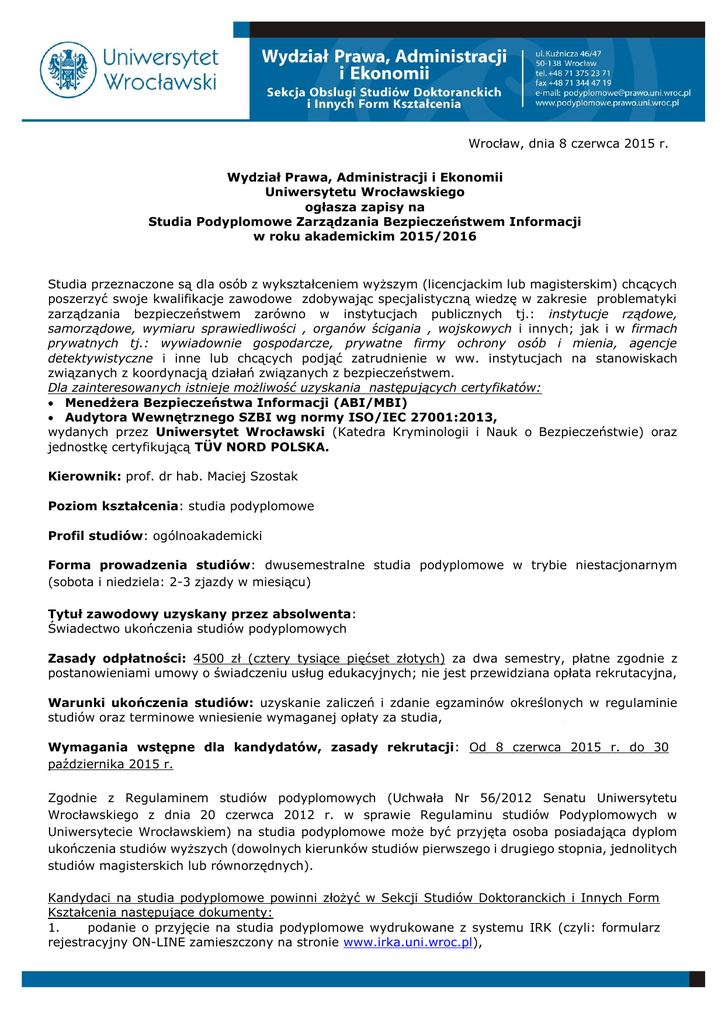 Wrocław, dnia 8 czerwca 2015 r. Wydział Prawa, Administracji i Ekonomii Uniwersytetu Wrocławskiego ogłasza zapisy na Studia Podyplomowe Zarządzania Bezpieczeństwem Informacji w roku akademickim 2015/2016 Studia przeznaczone są dla osób z wykształceniem wyższym (licencjackim lub magisterskim) chcących poszerzyć swoje kwalifikacje zawodowe zdobywając specjalistyczną wiedzę w zakresie problematyki zarządzania bezpieczeństwem zarówno w instytucjach publicznych tj.: instytucje rządowe, samorządowe, wymiaru sprawiedliwości , organów ścigania , wojskowych i innych; jak i w firmach prywatnych tj.: wywiadownie gospodarcze, prywatne firmy ochrony osób i mienia, agencje detektywistyczne i inne lub chcących podjąć zatrudnienie w ww. instytucjach na stanowiskach związanych z koordynacją działań związanych z bezpieczeństwem. Dla zainteresowanych istnieje możliwość uzyskania następujących certyfikatów: Menedżera Bezpieczeństwa Informacji (ABI/MBI) Audytora Wewnętrznego SZBI wg normy ISO/IEC 27001:2013, wydanych przez Uniwersytet Wrocławski (Katedra Kryminologii i Nauk o Bezpieczeństwie) oraz jednostkę certyfikującą TÜV NORD POLSKA. Kierownik: prof. dr hab. Maciej Szostak Poziom kształcenia: studia podyplomowe Profil studiów: ogólnoakademicki Forma prowadzenia studiów: dwusemestralne studia podyplomowe w trybie niestacjonarnym (sobota i niedziela: 2-3 zjazdy w miesiącu) Tytuł zawodowy uzyskany przez absolwenta: Świadectwo ukończenia studiów podyplomowych Zasady odpłatności: 4500 zł (cztery tysiące pięćset złotych) za dwa semestry, płatne zgodnie z postanowieniami umowy o świadczeniu usług edukacyjnych; nie jest przewidziana opłata rekrutacyjna, Warunki ukończenia studiów: uzyskanie zaliczeń i zdanie egzaminów określonych w regulaminie studiów oraz terminowe wniesienie wymaganej opłaty za studia, Wymagania wstępne dla kandydatów, zasady rekrutacji: Od 8 czerwca 2015 r. do 30 października 2015 r. Zgodnie z Regulaminem studiów podyplomowych (Uchwała Nr 56/2012 Senatu Uniwersytetu Wrocławskiego z dnia 20 czerwca 2012 r. w sprawie Regulaminu studiów Podyplomowych w Uniwersytecie Wrocławskiem) na studia podyplomowe może być przyjęta osoba posiadająca dyplom ukończenia studiów wyższych (dowolnych kierunków studiów pierwszego i drugiego stopnia, jednolitych studiów magisterskich lub równorzędnych). Kandydaci na studia podyplomowe powinni złożyć w Sekcji Studiów Doktoranckich i Innych Form Kształcenia następujące dokumenty: 1. podanie o przyjęcie na studia podyplomowe wydrukowane z systemu IRK (czyli: formularz rejestracyjny ON-LINE zamieszczony na stronie www.irka.uni.wroc.pl), 2. kserokopię dyplomu poświadczoną notarialnie bądź przez jednostkę przyjmującą dokumenty, 3. kserokopię dowodu osobistego poświadczoną notarialnie bądź przez jednostkę przyjmującą dokumenty, 4. jedną fotografię o wymiarach 35 mm x 45 mm bez nakrycia głowy, na jasnym tle, podpisaną imieniem i nazwiskiem. Kierownik studiów podyplomowych podejmuje decyzję o przyjęciu na studia podyplomowe, określając wysokość opłaty za studia i termin zawarcia umowy, bądź o nieprzyjęciu, wskazując powody nieprzyjęcia. Uczelnia, po otrzymaniu decyzji przez słuchacza o przyjęciu na studia podyplomowe, na pierwszych zajęciach zawiera ze słuchaczem umowę w formie pisemnej dotyczącą świadczenia usług edukacyjnych. PROGRAM STUDIÓW Program Studiów Podyplomowych Zarządzanie Bezpieczeństwem Informacji zakłada dwa semestry nauki w trybie niestacjonarnym. Obejmuje 200 godzin zajęć, w tym 96 godzin wykładów i 104 konwersatoriów(warsztatów). Ogólna liczba punktów ECTS dla przedmiotowych studiów: 95. Lp. Nazwa przedmiotu 1. 2. 3. 4. 5. Budowa systemów zarządzania bezpieczeństwem Wywiad gospodarczy Socjotechniki pozyskiwania informacji. Usługi detektywistyczne. Dostęp do informacji publicznej, a ochrona tajemnic ustawowych i prywatności Ochrona danych osobowych i informacji prawnie chronionych. Administrator Bezpieczeństwa Informacji (ABI) Forma zajęć Liczba Forma Punkty godzin zaliczenia ECTS Prowadzący osoba zewn. / prof. dr hab. Jerzy Konieczny wykład 8 zaliczenie 5 konwersatorium 16 zaliczenie 10 konwersatorium 8 zaliczenie /egzamin 5 pracownik UWr / prof. dr hab. Maciej Szostak / osoba zewn. / prof. dr hab. Jerzy Konieczny pracownik UWr / prof. dr hab. Maciej Szostak pracownik UWr / prof. dr hab. Mariusz Jabłoński wykład 16 egzamin 5 pracownik UWr / dr Krzysztof Wygoda wykład 16 egzamin 10 osoba zewn. / TÜV NORD 6. 7. 8. 9. Wymagania normy ISO/IEC 27001:2013 Analiza ryzyka wg norm ISO 31000, ISO 27005 Analiza systemów bezpieczeństwa informacji w biznesie Zarządzanie ciągłością działania konwersatorium 16 konwersatorium 16 egzamin 10 osoba zewn. / TÜV NORD zaliczenie 5 osoba zewn. / mgr inż. Marcin Sierko wykład 16 egzamin wykład 8 zaliczenie 10 5 osoba zewn. / mgr inż. Marcin Sierko 10. 11. 12. 13. 14. 15. Zagrożenia bezpieczeństwa informacji i zarządzanie incydentami Zarządzanie bezpieczeństwem personelu (Metodyka kontroli lojalności pracowników) Zarządzanie bezpieczeństwem teleinformatycznym Informatyka śledcza w bezpieczeństwie informacji. Zabezpieczanie elektronicznych dowodów sądowych Wdrażanie Systemu Zarządzania Bezpieczeństwem Informacji Auditowanie systemu ISO 27001 - warsztaty praktyczne Łączna liczba godzin: 200 h osoba zewn. / mgr inż. Marcin Sierko wykład 8 zaliczenie 5 pracownik UWr / prof. dr hab. Maciej Szostak / osoba zewn. / prof. dr hab. Jerzy Konieczny wykład 16 zaliczenie 5 osoba zewn. / mgr inż. Marcin Sierko wykład 8 zaliczenie 5 osoba zewn. / TÜV NORD konwersatorium 16 zaliczenie 5 osoba zewn. / TÜV NORD konwersatorium 16 zaliczenie 5 osoba zewn. / TÜV NORD konwersatorium 16 zaliczenie 5