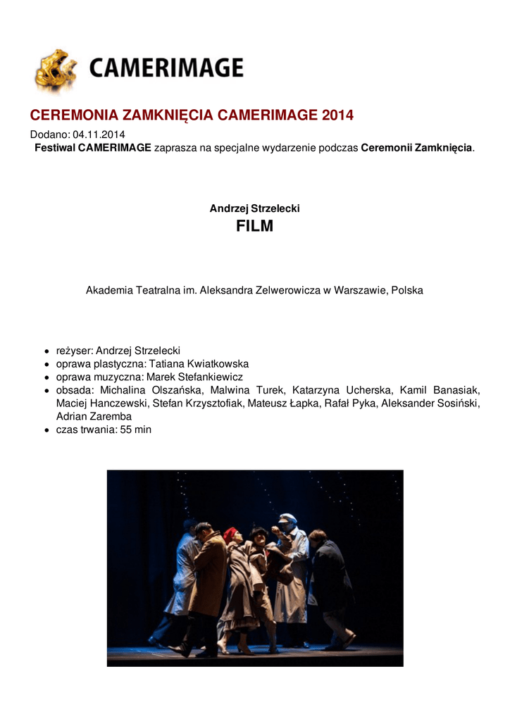 CEREMONIA ZAMKNIĘCIA CAMERIMAGE 2014 Dodano: 04.11.2014 Festiwal CAMERIMAGE zaprasza na specjalne wydarzenie podczas Ceremonii Zamknięcia. Andrzej Strzelecki FILM Akademia Teatralna im. Aleksandra Zelwerowicza w Warszawie, Polska reżyser: Andrzej Strzelecki oprawa plastyczna: Tatiana Kwiatkowska oprawa muzyczna: Marek Stefankiewicz obsada: Michalina Olszańska, Malwina Turek, Katarzyna Ucherska, Kamil Banasiak, Maciej Hanczewski, Stefan Krzysztofiak, Mateusz Łapka, Rafał Pyka, Aleksander Sosiński, Adrian Zaremba czas trwania: 55 min fot. Marta Ankiersztejn fot. Marta Ankiersztejn "Film jest przygodowo-kryminalno-miłosną historią życia bohaterki o imieniu Zuzia i jej nieudanych związków z mężczyznami. Lecz nie treść sztuki, ale sposób jej opowiedzenia stanowi główną atrakcję spektaklu. Ten Film jest teatrem. Jest zabawą ze zjawiskiem obrazkowego sposobu komunikacji treści i emocji. Kultura obrazkowa od wieków była istotnym instrumentem w boju o ludzką duszę. Dziś stała się znaczącą kontrofertą dla kultury literackiej. Kino, telewizja czy komiks podjęły skomasowaną i niekiedy bardzo skuteczna walkę z wynalazkiem Gutenberga. Film jest próbą zabawy z czasem, który – mamy nadzieję – nie będzie dla Państwa stracony. Miłej zabawy". Andrzej Strzelecki ********** Występ będzie częścią Ceremonii Zamknięcia Camerimage 2014, która odbędzie się 22 listopada w Sali Głównej Opera Nova w Bydgoszczy, obowiązują więc zaproszenia, jednakże w miarę dostępności wolnych miejsc, na seanse zapraszamy również osoby akredytowane.