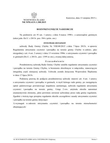 WOJEWODA ŚLĄSKI NR NPII.4131.1.308.2015 Katowice, dnia 13 sierpnia 2015 r. ROZSTRZYGNIĘCIE NADZORCZE Na podstawie art. 91 ust. 1 ustawy z dnia 8 marca 1990 r. o samorządzie gminnym (tekst jedn. Dz.U. z 2013r. poz. 594 z późn. zm.) stwierdzam nieważność uchwały Rady Gminy Chybie Nr VIII/48/2015 z dnia 7 lipca 2015r. w sprawie Regulaminu utrzymania czystości i porządku na terenie gminy Chybie w całości, jako niezgodnej z art. 4 ust. 2 ustawy z dnia 13 września 1996r. o utrzymaniu czystości i porządku w gminach (Dz.U. z 2013r., poz. 1399 ze zm.), zwanej dalej ustawą. Uzasadnienie Przedmiotową uchwałą Rada Gminy Chybie ustaliła regulamin utrzymania czystości i porządku na terenie Gminy Chybie, w brzmieniu określonym w załączniku, stanowiącym integralną część niniejszej uchwały. Uchwała została doręczona Wojewodzie Śląskiemu w dniu 17 lipca 2015r. Podstawę prawną do podjęcia przedmiotowej uchwały stanowi art. 4 ust. 1 ustawy o utrzymaniu czystości i porządku w gminach, w myśl którego rada gminy, po zasięgnięciu opinii państwowego powiatowego inspektora sanitarnego, uchwala regulamin utrzymania czystości i porządku na terenie gminy. Ustęp 2 ww. artykułu określa natomiast enumeratywnie elementy, jakie powinien zawierać uchwalany przez radę gminy regulamin. Zgodnie z treścią tego przepisu regulamin określa szczegółowe zasady utrzymania czystości i porządku na terenie gminy dotyczące: 1) wymagań w zakresie utrzymania czystości i porządku na terenie nieruchomości obejmujących: —————————————————————————————————————————————————— Id: DC4C984B-0278-4DB8-A65A-31EF2090A309. Podpisany Strona 1 a) prowadzenie selektywnego zbierania i odbierania lub przyjmowania przez punkty selektywnego zbierania odpadów komunalnych lub zapewnienie przyjmowania w inny sposób co najmniej takich odpadów komunalnych jak: przeterminowane leki i chemikalia, zużyte baterie i akumulatory, zużyty sprzęt elektryczny i elektroniczny, meble i inne odpady wielkogabarytowe, zużyte opony, odpady zielone oraz odpady budowlane i rozbiórkowe stanowiące odpady komunalne, a także odpadów komunalnych określonych w przepisach wydanych na podstawie art. 4a, b) uprzątanie błota, śniegu, lodu i innych zanieczyszczeń z części nieruchomości służących do użytku publicznego, c) mycie i naprawy pojazdów samochodowych poza myjniami i warsztatami naprawczymi; 2) rodzaju i minimalnej pojemności pojemników przeznaczonych do zbierania odpadów komunalnych na terenie nieruchomości oraz na drogach publicznych, warunków rozmieszczania tych pojemników i ich utrzymania w odpowiednim stanie sanitarnym, porządkowym i technicznym, przy uwzględnieniu: a) średniej ilości odpadów komunalnych wytwarzanych w gospodarstwach domowych bądź w innych źródłach, b) liczby osób korzystających z tych pojemników; 3) częstotliwości i sposobu pozbywania się odpadów komunalnych i nieczystości ciekłych z terenu nieruchomości oraz z terenów przeznaczonych do użytku publicznego; 4) (uchylony); 5) innych wymagań wynikających z wojewódzkiego planu gospodarki odpadami; 6) obowiązków osób utrzymujących zwierzęta domowe, mających na celu ochronę przed zagrożeniem lub uciążliwością dla ludzi oraz przed zanieczyszczeniem terenów przeznaczonych do wspólnego użytku; 7) wymagań utrzymywania zwierząt gospodarskich na terenach wyłączonych z produkcji rolniczej, w tym także zakazu ich utrzymywania na określonych obszarach lub w poszczególnych nieruchomościach; 8) wyznaczania obszarów podlegających obowiązkowej deratyzacji i terminów jej przeprowadzania. Wskazać należy, iż przyznane radzie gminy kompetencje do uchwalenia przedmiotowego regulaminu, ograniczone zostały do ustalenia w tymże regulaminie szczegółowych zasad utrzymania czystości i porządku na terenie gminy w zakresie ściśle określonym. Katalog spraw, w zakresie których ustawodawca upoważniła radę gminy do —————————————————————————————————————————————————— Id: DC4C984B-0278-4DB8-A65A-31EF2090A309. Podpisany Strona 2 określenia szczegółowych zasad postępowania jest bowiem zamknięty i rada gminy może dokonywać regulacji prawnych tylko w takim zakresie, w jakim została do tego upoważniona. Podkreślić należy, iż elementy wskazane w powyższym przepisie mają charakter wyczerpujący, nie jest zatem dopuszczalna wykładnia rozszerzająca zastosowania tego przepisu w odniesieniu do innych kwestii, które nie zostały w nim wymienione (por. wyrok NSA z dnia 8 listopada 2012r., sygn. akt II OSK 2012/12; wyrok WSA we Wrocławiu z dnia 30 listopada 2006r., sygn. akt II SA/Wr 527/06; wyrok WSA w Rzeszowie z dnia 23 października 2007r., sygn. akt II SA/Rz 59/07, Centralna Baza Orzeczeń Sądów Administracyjnych, http://orzeczenia.nsa.gov.pl). Wydawany na podstawie art. 4 ust. 2 ustawy regulamin stanowi prawo miejscowe i winien kompleksowo regulować zawartą w nim materię. W doktrynie i judykaturze przyjmuje się, iż rada gminy winna ująć w regulaminie uchwalanym na podstawie art. 4 ust. 2 ustawy wszystkie kwestie wskazane w tym przepisie, a brak któregoś z wyszczególnionych w nim elementów skutkuje istotnym naruszeniem prawa (por. wyrok Wojewódzki Sąd Administracyjny w Gliwicach z dnia 8 listopada 2007r. sygn. akt II SA/Gl 531/07, wyrok Wojewódzkiego Sądu Administracyjnego w Bydgoszczy z dnia 14 grudnia 2006r. sygn. akt II SA/Bd 845/2006, Centralna Baza Orzeczeń Sądów Administracyjnych, http://orzeczenia.nsa.gov.pl oraz Kazimierz Bandarzewski, Paweł Chmielnicki, Bogusław Dziadkiewicz "Komentarz do ustawy o utrzymaniu czystości i porządku w gminach" LexisNexis Warszawa 2007, str. 155 - 156). Tymczasem, zdaniem organu nadzoru, przedmiotowa uchwała nie wypeł