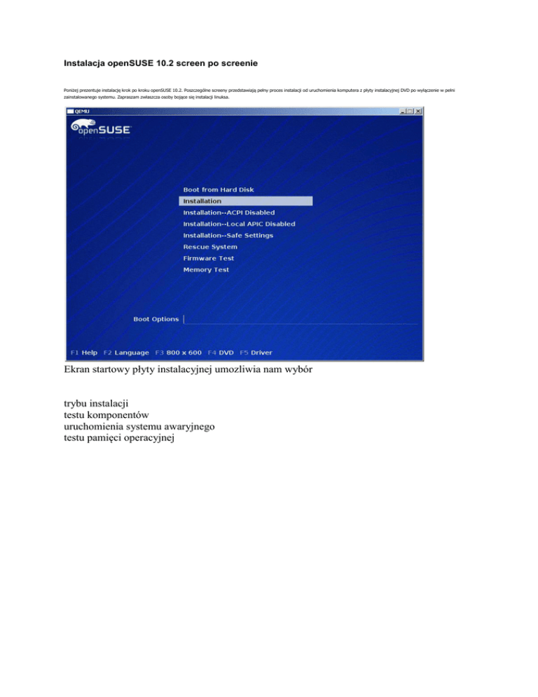 Instalacja openSUSE 10.2 screen po screenie Poniżej prezentuje instalację krok po kroku openSUSE 10.2. Poszczególne screeny przedstawiają pełny proces instalacji od uruchomienia komputera z płyty instalacyjnej DVD po wyłączenie w pełni zainstalowanego systemu. Zapraszam zwłaszcza osoby bojące się instalacji linuksa. Ekran startowy płyty instalacyjnej umozliwia nam wybór trybu instalacji testu komponentów uruchomienia systemu awaryjnego testu pamięci operacyjnej Ekran uruchamiania instalacji - możemy z niego wyjść aby podglądnąć postęp i wykonywane czynności naciskając klawisz ESC lub F2 Pierwsze co wybieramy to język domyślny systemu i instalacji Przez cały proces instalacji na dole ekranu mamy dostęp do czterech przycisków: Pomoc, Wstecz, Przerwij i Dalej. Przed przejściem do instalacji musimy zaakceptować licencję; niestety nie jest ona dostępna w języku polskim. Dokonujemy wyboru trybu instalacji. W przypadku, jeśli mieliśmy już zainstalowany system SUSE lub openSUSE dostępne będą opcje aktualizacji oraz naprawy zainstalowanego systemu. Wybieramy strefę czasową i ustalamy, czy czas systemowy ustawiony jest w czasie uniwersalnym czy lokalnym. Wybieramy środowisko graficzne według uznania: GNOME (a’la MacOS) lub KDE (a’la Windows). Podsumowanie instalacji zawiera zbiorcze dane o systemie, wybranym oprogramowaniu, bootloaderze, ustawieniach klawiatury etc... Oczywiście wszystko możemy na tym etapie dostosować. Akceptujemy wszystko lub wracamy się, jeśli o czymś zapomnieliśmy. W przypadku instalacji pakietów o zamkniętym kodzie zostaniemy poproszeni o akceptację ich licencji - w tym przypadku jest to zestaw programów Adobe Reader. Analogicznie w przypadku Flash Player'a. Formatowanie partycji pod system. Kopiowanie pakietów. Po skopiowaniu pakietów komputer zostanie zrestartowany i czekamy bez żadnych działań na samodzielne uruchomienie. Rozpoczyna się etap konfiguracji. Pierwsze co wykonujemy, to podajemy hasło użytkownika głównego (administrator, tzw. root), jest on wymagany do wszystkich działań wymagających ingerencji w system, ale nie służy do normalnego korzystania z komputera. W przypadku, jeśli nasz komputer jest podpięty do domeny, podajemy jego nazwę i nazwę domeny, a jeśli nasze połączenie sieciowe skonfigurowane jest automatycznie, zostawiamy zaznaczone pola automatycznych zmian. Przegląd konfiguracji urządzeń sieciowych. Zapisywanie ustawień urządzeń sieciowych. Testowanie ustawień połączeń sieciowych; należy pamiętać i wybrać odpowiedni interfejs, jeśli mamy więcej urządzeń sieciowych. Wyniki testu połączenia. Konfiguracja i rejestracja centrum pomocy Novell'a dla użytkowników płatnej wersji. Pobieranie danych z serwerów aktualizacyjnych. Zakończenie rejestracji. Konfiguracja automatycznych aktualizacji. Konfiguracja dodatkowych źródeł instalacji. UWAGA - zaznaczenie ich wiąże się z pobraniem nawet kilkudziesięciu MB danych, ale jest czasami przydatne. Konfiguracja zarządzania użytkownikami(wybieramy domyślne zaznaczenie). Dodanie Pierwszego użytkownika; domyślne zaznaczone jest pole automatycznego logowania. Jeśli chcemy dodać więcej użytkowników podczas instalacji, klikamy na: Zarządzanie użytkownikami. Zapisywanie konfiguracji. Zbiór podstawowych informacji i zmian wprowadzonych w tym wydaniu. Konfiguracja karty graficznej, drukarek, kart telewizyjnych, karty dźwiękowej i bluetooth. Zapisywanie ustawień urządzeń. Zakończenie instalacji - możemy zaznaczyć, aby konfiguracja została zapisana aby ułatwić i przyspieszyć przyszłe instalacje. Ekran powitalny uruchomionego systemu