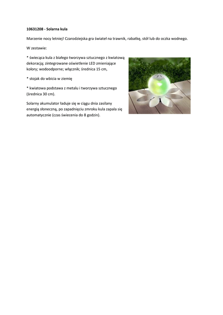 10631208 - Solarna kula Marzenie nocy letniej! Czarodziejska gra świateł na trawnik, rabatkę, stół lub do oczka wodnego. W zestawie: * świecąca kula z białego tworzywa sztucznego z kwiatową dekoracją; zintegrowane oświetlenie LED zmieniające kolory; wodoodporne; włącznik; średnica 15 cm, * stojak do wbicia w ziemię * kwiatowa podstawa z metalu i tworzywa sztucznego (średnica 30 cm). Solarny akumulator ładuje się w ciągu dnia zasilany energią słoneczną, po zapadnięciu zmroku kula zapala się automatycznie (czas świecenia do 8 godzin).