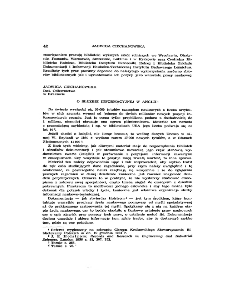 42 J A D W IG A CIECH AN O W SKA rozw iązaniem pracują biblioteki w yższych szkół rolniczych w e W rocławiu, Olszty nie, Poznaniu, W arszaw ie, Szczecinie, Lublinie i w K rakow ie oraz Centralna B i blioteka R olnicza, B iblioteka Instytutu Ekonomiki R oln ej i Biblioteka Zakładu D okum entacji i In form acji N aukow o-Technicznej Instytutu Badaw czego Leśnictwa. Rezultaty tych prac pow inny dop om óc d o należytego w ykorzystania zarów no zbio r ó w bibliotecznych jak i ugruntowania ich pozycji jako warsztatu pracy naukowej. JA D W IG A CIECH AN O W SKA Inst. O dlew nictw a w K rakow ie O SŁU ŻBIE IN FORM ACYJNEJ W A N G L II i Na św iecie w ych odzi ok. 50 000 tytu łów czasopism naukow ych a liczba artyku łó w w nich zawarta w ynosi od jednego d o dw óch m ilionów now ych po2y c ji in form acyjnych rocznie. Jest to ocena tylko przybliżona podana z dokładnością do 1 m iliona, niem niej obrazuje ona ogrom piśm iennictwa. M ateriał ten narasta z przerażającą szybkością i np. w bibliotekach U SA jego liczba podw aja się co lat 16 2. Jeżeli chodzi o książki, nie licząc broszur, to w edług danych Unesco w sa m e j W . B rytanii w 195C r. w ydan o razem 17 000 now ych tytułów , a w Stanach Z jedn oczon ych 11000 s. Z liczb tych w idzim y, jak olbrzym i m ateriał staje do rozporządzenia bibliotek i ośrodk ów dokum entacji i jak stosunkow o niewielką jego część stanowią w y da w n ictw a zwarte (książki) w porów naniu z pozycjam i in form acji zawartym i w czasopism ach. C zy w szystkie te pozjłcje m ają trw ałą wartość, to inna sprawa. M ateriał ten należy od p ow iedn io u ją ć i tak rozprow adzić, a b y szybko tra fił d o rąk osób studiujących dane zagadnienie, przy czym należy uw zględnić i tę okoliczność, że poszczególne nauki zazębiają się w zajem nie i że d o zgłębienia pew n ych zagadnień w dan ej - dziedzinie konieczna jest rów nież znajom ość dzie d zin peryferyczn ych . Oznacza to w praktyce, że nie w ystarczy studiow ać czaso pism a z zakresu sw ej specjalności, często trzeba sięgać do czasopism z dziedzin pokrew nych. Przekracza to m ożliw ości jednego człow ieka i aby tego można b yło d ok on a ć dla potrzeb w iedzy i życia, konieczna jest w łaściwa organizacja służby in form acji n aukow o-technicznej. D okum entacja — jak stwierdza H olstrom 4 — jest tym środkiem , który kon tak tuje wszystkie przejaw y życia naukow ego począw szy od m yśli spekulatywnej a ż d o praktycznego zastosowania tej myśli. Spotykam y się z nią na każdym eta pie życia naukow ego, czy to będzie ch odziło o liczbow e ustalenie praw naukow ych ■czy o opis zjaw isk p rzy p om ocy tych praw, o ustalenie metod itd. Dokum entacja dociera w szędzie i zbiera in form acje tam, gdzie trzeba, aby je dostarczyć szybko tam , gdzie są one pożądane. 1 R efera t w ygłoszony na zebraniu O kręgu K rakow skiego Stowarzyszenia Bi bliotekarzy Polskich w dn. 19 grudnia 1961 r. 2 J. E. H o l s t r o m : R ecords and R esearch in Engineering and Industrial S cien ces. L on don 1956 s. 81, 307. 352. 3 Tam że s. 355. * Tam że s. 7 6 .' SŁ U ŻB A INFORM ACYJNA W ANGLII 43 Inną kwestią jest sprawa, w jakim stopniu św iat naukowy może korzystać z tych licznych źródeł inform acji. Dla zilustrowania tego zagadnienia podam znor w u w yciąg danych Unesco z lat 1950— 1956 5; Polska 1. Liczba uczonych i techników na 1000 mieszkańców: 2. O gółem liczba uczonych i tech ników: 3. Znajom ość języków obcych: niem. ang. franc. ros. hisąp. 4. Zaludnienie W Brytania ZSRR 5 6,1 72 000 250 000 1 000 000 14 000 10 G00 10 000 50 000 50 000 600 000 500 000 400 000 3 28 100 000 50 000 3 000 5 000 51 400 000 50 000 200 200 000 O czywiście liczby te dziś są odpowiednio większe. Z tabeli tej wynika, że język hiszpański jest językiem światowym , znanym na obu półkulach i jak niektórzy tw ierdzą językiem przyszłości ze względu na kraje Am eryki Łacińskiej, która coraz bardziej dochodzi do głosu. Zaskakująca jest duża znajom ość tego języka wśród uczonych ZSRR. Z danych Unesco w ynika również, że przeszło 500/0 św iatowej literatury nauko w e j i technicznej ukazuje się w języku angielskim. O koło 30% uczonych i specja listów świata może czytać literaturę sw ojej specjalności w języku angielskim, z te g o dla przeszło połow y jest to język ojczysty. Następne miejsce co d o rozpowszech nienia w śród n aukow ców zajm ują języki niemiecki, rosyjski i francuski6. Jeżeli rozw ażym y zagadnienie służby inform acyjnej z punktu widzenia zna jom ości języków obcych wśród naukowców, to zrozumiałe się staje znaczenie d okum entalisty-tłum acza w każdym ośrodku inform acyjnym . Bez fachow ych tłuma c z y w drożonych w zagadnienia naukowo-techniczne służba inform acyjna jest nie m ożliwa. Zanim przejdę do inform acji naukow o-technicznej w Anglii, po krótce przy pom nę zasadę, w edług której sprawę inform acji rozwiązano w Polsce. W Polsce zorganizowano w 1950 r. Centralny Instytut Dokum entacji NaukowoTechnicznej, obecnie Centralny Instytut Inform acji Naukow o-Technicznej i E ko nom icznej w Warszawie, który jako instytucja centralna skupia w swym ręku w y daw n ictw o kart dokum entacyjnych i ich dystrybucję według zapotrzebowania. K a rty te są opracowyw ane przez poszczególne ośrodki dokumentacji wciągnięte do ■współpracy. Tego rodzaju centralizacja w Anglii byłaby niemożliwa, gdyż w ym agałoby to daleko idącej ingerencji państwa połączonej z odpowiednim i subsydiami. W A n glii pozostawia się tę rz e c z . inicjatyw ie poszczególnych stowarzyszeń naukowych i instytucji, które, korzystając czasem z pom ocy finansowej państwa, na własną rękę spełniają te zadania w ograniczonym zakresie, obejm ującym pewną dziedzi nę wiedzy. Cechą w yróżniającą naszej służby inform acyjnej jest dostarczanie roz 