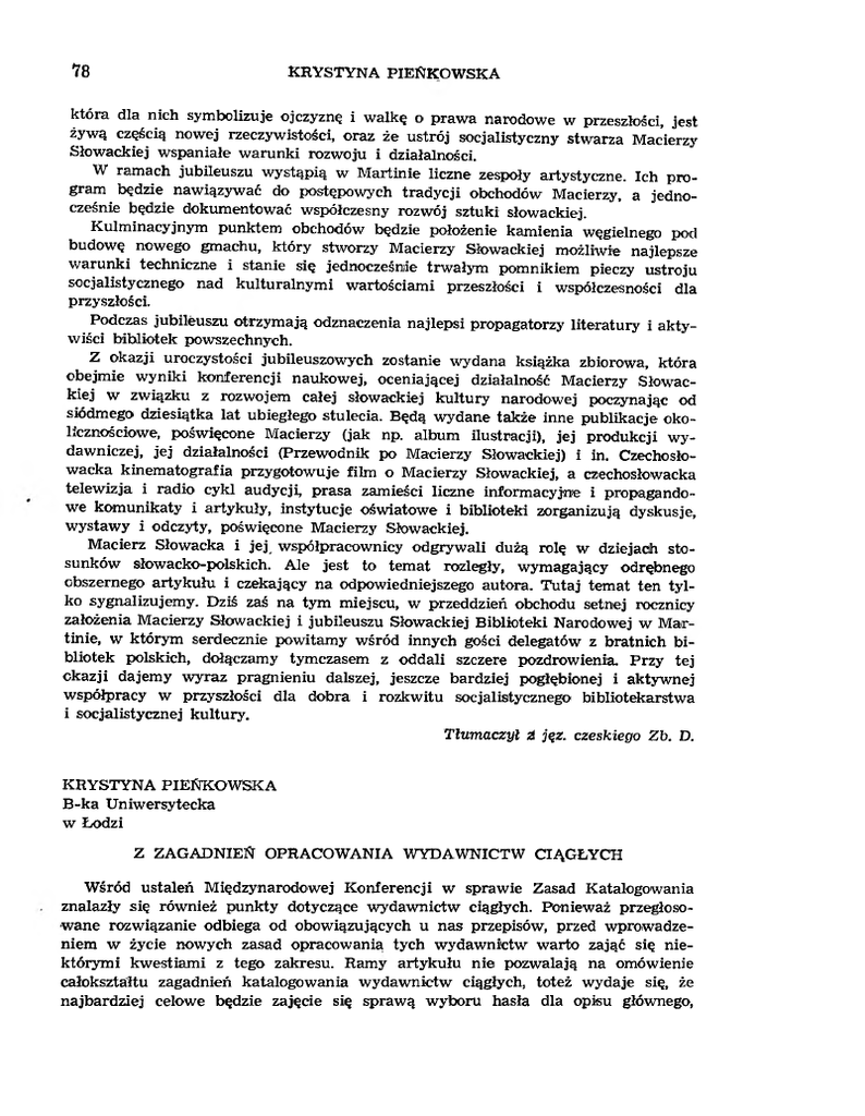78 K R Y S T Y N A PIE Ń K O W SK A która dla nich sym bolizuje ojczyzną i w a lk ę o p raw a narodow e w przeszłości, jest żyw ą częścią n ow ej rzeczyw istości, o ra z ż e ustrój socjalistyczn y stw arza M acierzy S łow ack iej w spaniałe w aru nki rozw oju i działalności. W ram ach jubileuszu w ystąpią w M artinie liczn e zespoły artystyczne. Ich p ro gram będzie naw iązyw ać d o p ostęp ow ych tra d y cji ob ch od ów M acierzy, a jed n o cześnie będzie dokum entow ać w spółczesny rozw ój sztuki słow ackiej. K u lm in a cyjn ym punktem ob ch o d ó w będzie p ołożen ie kam ienia w ęgielnego pod bu d ow ę n ow ego gm achu, który stw orzy M acierzy S łow ackiej m ożliw ie najlepsze w aru nki techn iczn e i stanie się jedn ocześn ie trw ałym pom nikiem p ieczy ustroju socjalistyczn ego nad kulturalnym i w artościam i przeszłości i w spółczesności dla przyszłości. Podczas jubileuszu otrzym a ją odznaczenia najlepsi propagatorzy literatury i akty w iści b ibliotek pow szechnych. Z o k a z ji u roczystości ju b ileu szow ych zostanie w ydana książka zbiorow a, która o b e jm ie w y n ik i k on feren cji n au kow ej, ocen ia ją cej działalność M acierzy S łow ac k ie j w zw iązku z rozw ojem ca łej słow ackiej kultury n arod ow ej poczyn ając od siódm ego dziesiątka lat u biegłego stulecia. Będą w y d an e także inne p u b lik a cje o k o liczn ościow e, p ośw ięcon e M acierzy (jak np. album ilustracji), je j p ro d u k cji w y d a w n iczej, je j działaln ości (P rzew odn ik p o M acierzy S łow ackiej) i in. C zechosło w a ck a kinem atografia p rzyg otow u je film o M acierzy S łow ackiej, a czechosłow acka telew izja i ra d io cy k l a u d ycji, prasa zam ieści liczn e in form a cyjn e i propagando w e kom unikaty i artykuły, instytu cje ośw ia tow e i biblioteki zorganizują dyskusje, w y sta w y i od czyty, p ośw ięcon e M acierzy S łow ackiej. M acierz S łow acka i je j, w sp ółp racow n icy od g ry w a li dużą rolę w dziejach sto sunków słow ack o-p olsk ich . A le jest to tem at rozległy, w y m a g ają cy od rębnego obszern ego artyku łu i czek a ją cy na od pow iedniejszego autora. T utaj tem at ten ty l k o sygn alizujem y. Dziś zaś na tym m iejscu, w przeddzień ob ch od u setnej rocznicy założenia M a cierzy S łow a ck iej i jubileuszu S łow ackiej B ib liotek i N arodow ej w M ar tinie, w k tóry m serdecznie p ow itam y w śród innych gości delegatów z bratn ich b i b liotek polskich , d ołączam y tym czasem z od d a li szczere pozdrow ienia. P rzy tej o k a z ji d a jem y w y ra z pragnieniu dalszej, jeszcze bard ziej p ogłębionej i aktyw n ej w sp ółp racy w przyszłości dla d ob ra i rozkw itu socjalistyczn ego bibliotekarstw a i socja listyczn ej kultury. T łum aczył A jęz. czesk ieg o Zb. D. K R Y S T Y N A P IE Ń K O W SK A B -k a U niw ersyteck a w Ł od zi Z ZA G A D N IE Ń O P R A C O W A N IA W Y D A W N IC T W C IĄ G Ł Y C H W śród ustaleń M ięd zyn a rod ow ej K o n fe re n cji w spraw ie Zasad K atalogow ania znalazły się rów nież pu n kty d otyczące w y d a w n ictw ciągłych. Poniew aż p rzegłoso w a n e rozw ią zan ie od b ieg a o d ob ow ią zu ją cy ch u nas przepisów , przed w p row a dze niem w życie n ow ych zasad op ra cow an ia tych w y d a w n ictw w a rto zająć się nie k tó ry m i k w estiam i z tego zakresu. R am y artykułu n ie p ozw alają na om ów ienie całokształtu zagadnień k a talogow ania w y d a w n ictw ciągłych, toteż w y d a je się, że n a jba rd ziej ce lo w e b ęd zie za jęcie się spraw ą w y b oru hasła dla opisu głów nego, OPRACOW AN IE W YD AW N ICTW CIĄG ŁYC H 79 ja k o najbardziej podstawową a zarazem tą, w której przew iduje się najdalej idą ce zmiany. Zasady katalogowania w ydaw nictw ciągłych w bibliotekach polskich ulegały znacznym zmianom, dotyczącym zarów no zasad opisu jak i red akcji odpow iednich paragrafów . W okresie przygotow yw ania now ych, zm ienionych reguł katalogow a nia w arto m oże przypom nieć etapy rozw ojow e naszych dotychczasow ych przepi sów, a także wskazać na ważniejsze zw yczaje zagraniczne, ponieważ ośw ietli to lepiej om aw ianą problem atykę i p ozw oli na w yjaśnienie genezy obecnych tendencji w katalogowaniu w yd aw nictw ciągłych. W ydaw nictw a ciągłe nie zajm ow ały zrazu w iele m iejsca w przepisach katalo gow ania, które dotyczyły przede wszystkim opracow ania w ydaw nictw zwartych. Szybki rozw ój czasopiśm iennictwa i ukształtowanie się różnorodnych form w yd aw nictw ciągłych w yw ołały konieczność ustosunkowania się d o nich w praktyce b i bliotecznej i ustalenia sposobu opracow ania, w praw dzie w zgodzie z ogólnym i za sadam i katalogowania, ale jednocześnie z uw zględnieniem specyfiki tego typu w y daw nictw . G d y w okresie p o pierw szej w o jn ie św iatow ej zaczęły się prace nad m oderni zacją polskich w arsztatów bibliotecznych i przystąpiono do opracow ania ogóln o kra jow ych przepisów katalogowania, to' okazało się, że praktyka bibliotek polskich w stosunku do w yd aw nictw ciągłych była w y ją tk ow o jednolita. W ydaw nictw a zbio row e a także seryjne jako całość stanow iły jednostkę katalogową i otrzym yw ały opis głów ny pod tytułem nadrzędnym . D la poszczególnych dzieł sporządzano karty cząstkowe. Czasopisma i na rów ni z nim i traktow ane inne w ydaw nictw a ciągłe i periodyczne katalogow ano pod hasłem tytułow ym , którym b ył pierwszy rzeczow nik. Podstawą opisu był tytuł pierw szego tom u czy rocznika w ydaw nictw a. P raktyce katalogow ej dużych bibliotek sprzeciw iał się p rojekt w ydany przezZw iązek B ibliotekarzy Polskich i, k tóry skłaniał się zdecydow anie d o naśladowa nia w zorów anglo-am erykańskich. W edług tego p rojektu głów ny opis katalogowy sporządza się dla poszczególnych p ra c w chodzący