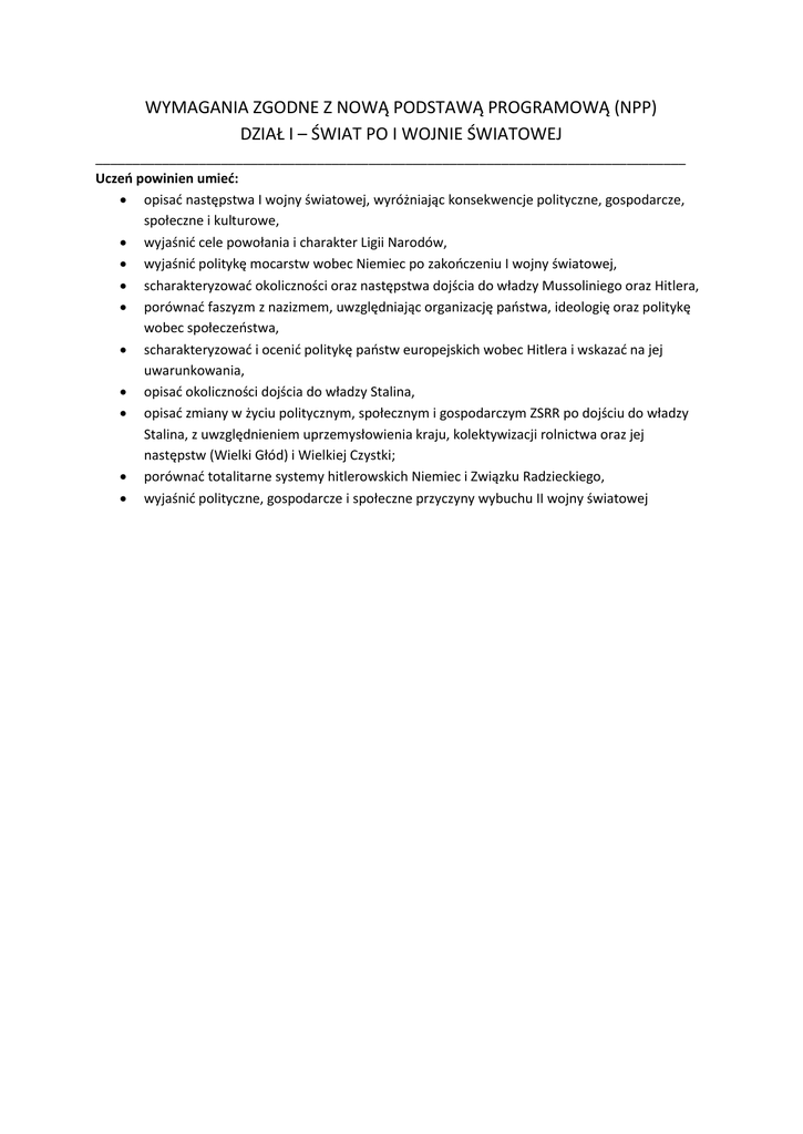 WYMAGANIA ZGODNE Z NOWĄ PODSTAWĄ PROGRAMOWĄ (NPP) DZIAŁ I – ŚWIAT PO I WOJNIE ŚWIATOWEJ ________________________________________________________________________________ Uczeo powinien umieć:  opisad następstwa I wojny światowej, wyróżniając konsekwencje polityczne, gospodarcze, społeczne i kulturowe,  wyjaśnid cele powołania i charakter Ligii Narodów,  wyjaśnid politykę mocarstw wobec Niemiec po zakooczeniu I wojny światowej,  scharakteryzowad okoliczności oraz następstwa dojścia do władzy Mussoliniego oraz Hitlera,  porównad faszyzm z nazizmem, uwzględniając organizację paostwa, ideologię oraz politykę wobec społeczeostwa,  scharakteryzowad i ocenid politykę paostw europejskich wobec Hitlera i wskazad na jej uwarunkowania,  opisad okoliczności dojścia do władzy Stalina,  opisad zmiany w życiu politycznym, społecznym i gospodarczym ZSRR po dojściu do władzy Stalina, z uwzględnieniem uprzemysłowienia kraju, kolektywizacji rolnictwa oraz jej następstw (Wielki Głód) i Wielkiej Czystki;  porównad totalitarne systemy hitlerowskich Niemiec i Związku Radzieckiego,  wyjaśnid polityczne, gospodarcze i społeczne przyczyny wybuchu II wojny światowej