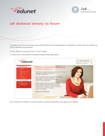 Jak... Praktycze porady Jak dodawać tematy na forum Narzędzie forum jest narzędziem komunikacji Platformy Edukacyjnej Edunet. Narzędzie to może służyć do dyskusji na forum szkolnym lub klasowym. W celu dodania nowego tematu na forum należy: 1. W bocznym menu platformy kliknąć pozycję Grupa dyskusyjna. Po uruchomieniu modułu w prawym panelu zostanie wyświetlona lista aktualnych dyskusji. 1/3 2. Zapoznać się z listą dostępnych for a następnie kliknąć odnośnik do wybranego forum np.: Forum spraw szkolnych. 3. W panelu Forum spraw szkolnych kliknąć odnośnik Dodaj nową dyskusję. 4. W oknie Forum spraw szkolnych – Nowy element uzupełnić pola Temat oraz Treść i kliknąć przycisk Zapisz. 2/4 5. Sprawdzić, czy nowy temat pojawił się na liście tematów w panelu Forum spraw szkolnych . 3/3