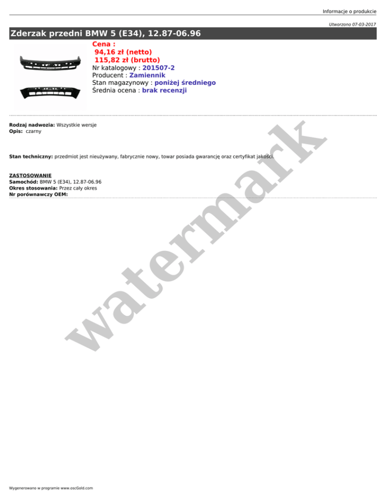 Informacje o produkcie Utworzono 07-03-2017 Zderzak przedni BMW 5 (E34), 12.87-06.96 Cena : 94,16 zł (netto) 115,82 zł (brutto) Nr katalogowy : 201507-2 Producent : Zamiennik Stan magazynowy : poniżej średniego Średnia ocena : brak recenzji er m ar k Rodzaj nadwozia: Wszystkie wersje Opis: czarny Stan techniczny: przedmiot jest nieużywany, fabrycznie nowy, towar posiada gwarancję oraz certyfikat jakości. w at ZASTOSOWANIE Samochód: BMW 5 (E34), 12.87-06.96 Okres stosowania: Przez cały okres Nr porównawczy OEM: Wygenerowano w programie www.oscGold.com