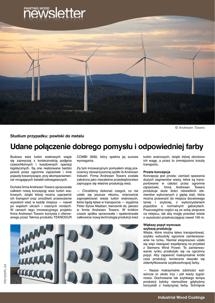© Andresen Towers Studium przypadku: powłoki do metalu Udane połączenie dobrego pomysłu i odpowiedniej farby Budowa wież turbin wiatrowych wiąże się zazwyczaj z koniecznością podjęcia czasochłonnych i kosztownych operacji logistycznych. Są one realizowane bardzo powoli przez ogromne ciężarówki i inne pojazdy towarzyszące, przy akompaniamencie mrugających świateł ostrzegawczych. PW1502PL-03 Duńska firma Andresen Towers opracowała całkiem nową koncepcję wież turbin wiatrowych, dzięki której można usprawnić ich transport oraz umożliwić przewożenie wysokich wież w każde miejsce — nawet po wąskich ulicach i ciasnych rondach. W ramach tego innowacyjnego projektu firma Andresen Towers korzysta z oferowanego przez Teknos produktu TEKNODUR COMBI 3560, który spełnia jej surowe wymagania. Za tym innowacyjnym pomysłem stoją pracownicy stowarzyszonej spółki Ib Andresen Industri. Firma Andresen Towers została założona jako niezależne przedsiębiorstwo zajmujące się właśnie produkcją wież. — Chcieliśmy dokonać czegoś, co nie udało się jeszcze nikomu, mianowicie zaprojektować wieże turbin wiatrowych, które będą łatwe w transporcie — wyjaśnia Peter Sylow Madsen, kierownik ds. jakości w firmie Andresen Towers. W krótkim czasie spółka opracowała i opatentowała całkowicie nową technologię produkcji wież turbin wiatrowych, dzięki której obniżono ich wagę, a przez to zmniejszono koszty transportu. Prosta koncepcja Koncepcja jest prosta: zamiast spawania dużych segmentów wieży, które są transportowane w całości przez ogromne ciężarówki, firma Andresen Towers produkuje duże ilości niewielkich elementów wykonanych z giętej stali, które można przewozić do miejsca docelowego taniej i szybciej, z wykorzystaniem pojazdów o normalnych gabarytach. Poszczególne części są ze sobą skręcane na miejscu, tak aby mogły powstać wieże o wysokości przekraczającej nawet 100 m. Większy popyt wymusza szybszą produkcję Wieże, które można łatwo transportować, szybko wzbudziły ogromne zainteresowanie na rynku. Niemal ekspresowo udało się więc nawiązać współpracę na przykład z Siemens Wind Power. To zainteresowanie rynku przełożyło się na ogromny popyt. Aby zapewnić maksymalnie krótki czas produkcji, konieczne okazało się zidentyfikowanie szybkoschnącej farby. — Nasze maksymalne zdolności wytwórcze to około trzy i pół wieży tygodniowo. Dochowanie tak szybkiego tempa produkcji byłoby niemożliwe gdybyśmy korzystali z tradycyjnej farby. Schnięcie Industrial Wood Coatings powłoki na stalowych elementach trwałoby wówczas do siedmiu dni. Wiązałoby się to z dużymi kosztami, wymagałoby olbrzymiej przestrzeni magazynowej, a ponadto utrudniłoby wykonywanie pracy — mówi Peter Sylow Madsen, kierownik ds. jakości. To właśnie z tych przyczyn firma Andresen Towers potrzebowała wsparcia ze strony innowacyjnego partnera z branży powłok, który mógłby zaoferować szybkoschnące i trwałe rozwiązanie, a więc ze strony dostawcy, który byłby w stanie myśleć niestandardowo i pomógłby opracować produkt umożliwiający powlekanie na linii zgodnie z wymogami procesu produkcyjnego. Wówczas do gry weszła firma Teknos. — Firma Teknos udzieliła nam profesjonalnego i specjalistycznego wsparcia w zakresie wszystkich kwestii technicznych i praktycznych dotyczących procesu powlekania — tak na temat współpracy wypowiada się Peter Sylow Madsen. — Andresen Towers skupia się na innowacyjności, a to samo nastawienie charakteryzuje firmę Teknos. Już od samego początku naszej współpracy byliśmy pod wrażeniem jej praktycznego podejścia, wiedzy specjalistycznej oraz wysokiego poziomu usług i dużej elastyczności — mówi Peter Sylow Madsen. Peter oraz Henrik Hansen, kierownik ds. marketingu w Teknos Denmark, wspominają produkcję pierwszych elementów stalowych, na które nakładano powłokę Teknos. — Przez pierwsze trzy dni byliśmy w zakładzie niemal przez 24 godziny na dobę. Chcieliśmy oczywiście możliwie jak najdokładniej kontrolować cały proces i mieć pewność, że wszystko idzie zgodnie z planem — mówi Henrik Hansen. Te kilka długich dni było ważnych zarówno dla Teknos, jak i dla Andresen Towers. Pracownicy obu firm chcieli bowiem przekonać się, w jaki sposób ich współpraca będzie wyglądała w praktyce. Korzyści także dla środowiska Krótki czas schnięcia to nie jedyna korzyść rozwiązania oferowanego przez Teknos. Farba TEKNODUR COMBI 3560 charakteryzuje się dużą zawartością suchej masy, dlatego przy powlekaniu z jej wykorzystaniem można utrzymać niski poziom emisji LZO. Aspekt ten również był bardzo ważny dla firmy Andresen Towers. — Oferujemy produkty, które trafiają do klientów z zielonego sektora gospodarki, dlatego powłoka Teknos stanowi dla nas dobre rozwiązanie także ze względów środowiskowych — mówi Peter Sylow Madsen. — Krótki czas schnięcia i fakt, że farbę wystarczy nałożyć tylko raz, przekonały nas do tego rozwiązania. Z uwagi na to, że działamy w zielonym sektorze gospodarki, korzyści środowiskowe wynikające ze stosowania farby TEKNODUR COMBI 3560 mają dla nas również duże znaczenie. Bez tej farby cały projekt wyglądałby zupełnie inaczej — dodaje Peter Sylow Madsen. Dane/fakty na temat spółki Andresen Towers Spółka Andresen Towers A/S została założona w 2011 r. i od tego czasu ściśle współpracuje z przedsiębiorstwem Ib Andresen Industri. Firma specjalizuje się w opracowywaniu i produkowaniu skręcanych na śruby wież turbin wiatrowych. Dzięki współpracy z przedsiębiorstwem Ib Andresen Industri, Andresen Towers może poszczycić się ponad 25-letnim doświadczeniem w branży wież turbin wiatrowych. Firma Andresen Towers wyprodukowała już ponad 200 wież turbin wiatrowych. Większość z nich działa obecnie w Niemczech, Finlandii, Danii i Szwecji. R