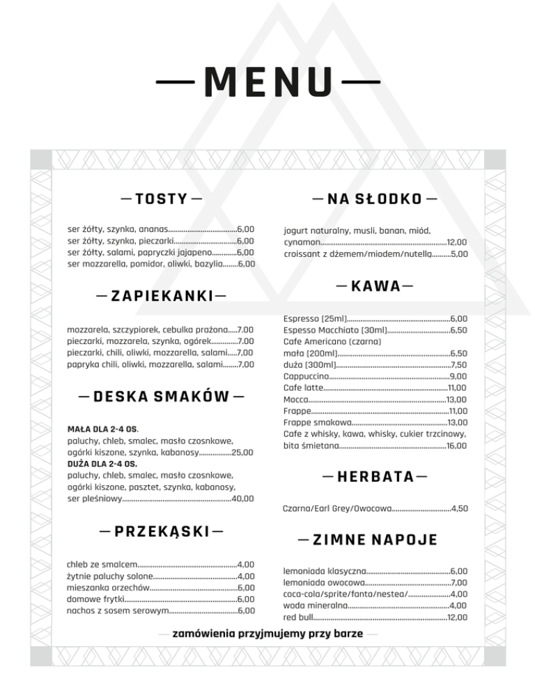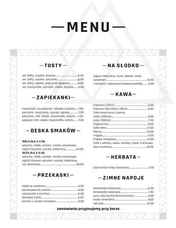 MENU TOSTY NA SŁODKO ser żółty, szynka, ananas....................................6,00 ser żółty, szynka, pieczarki.................................6,00 ser żółty, salami, papryczki jajapeno.............6,00 ser mozzarella, pomidor, oliwki, bazylia........6,00 jogurt naturalny, musli, banan, miód, cynamon..................................................................12,00 croissant z dżemem/miodem/nutellą..........5,00 ZAPIEKANKI mozzarela, szczypiorek, cebulka prażona.....7.00 pieczarki, mozzarela, szynka, ogórek..............7.00 pieczarki, chili, oliwki, mozzarella, salami.....7,00 papryka chili, oliwki, mozzarella, salami........7,00 DESKA SMAKÓW MAŁA DLA 2-4 OS. paluchy, chleb, smalec, masło czosnkowe, ogórki kiszone, szynka, kabanosy.................25,00 DUŻA DLA 2-4 OS. paluchy, chleb, smalec, masło czosnkowe, ogórki kiszone, pasztet, szynka, kabanosy, ser pleśniowy.........................................................40,00 PRZEKĄSKI chleb ze smalcem....................................................4,00 żytnie paluchy solone............................................4,00 mieszanka orzechów..............................................6,00 domowe frytki...........................................................6,00 nachos z sosem serowym....................................6,00 KAWA Espresso [25ml]......................................................6,00 Espesso Macchiato [30ml].................................6,50 Cafe Americano (czarna) mała [200ml]...........................................................6,50 duża [300ml]............................................................7,50 Cappuccino...............................................................9,00 Cafe latte.................................................................11,00 Mocca........................................................................13,00 Frappe........................................................................11,00 Frappe smakowa..................................................13,00 Cafe z whisky, kawa, whisky, cukier trzcinowy, bita śmietana........................................................16,00 HERBATA Czarna/Earl Grey/Owocowa...............................4,50 ZIMNE NAPOJE lemoniada klasyczna............................................6,00 lemoniada owocowa.............................................7,00 coca-cola/sprite/fanta/nestea/......................4,00 woda mineralna.....................................................4,00 red bull......................................................................12,00 zamówienia przyjmujemy przy barze