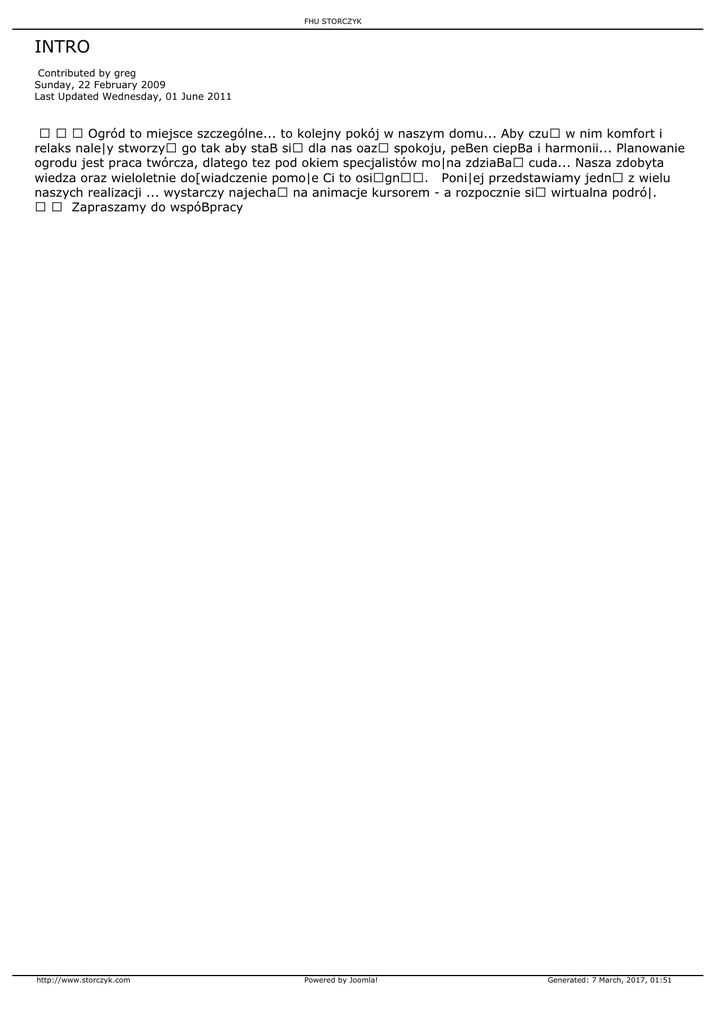FHU STORCZYK INTRO Contributed by greg Sunday, 22 February 2009 Last Updated Wednesday, 01 June 2011 Ogród to miejsce szczególne... to kolejny pokój w naszym domu... Aby czu w nim komfort i relaks nale|y stworzy go tak aby staB si dla nas oaz spokoju, peBen ciepBa i harmonii... Planowanie ogrodu jest praca twórcza, dlatego tez pod okiem specjalistów mo|na zdziaBa cuda... Nasza zdobyta wiedza oraz wieloletnie do[wiadczenie pomo|e Ci to osign. Poni|ej przedstawiamy jedn z wielu naszych realizacji ... wystarczy najecha na animacje kursorem - a rozpocznie si wirtualna podró|. Zapraszamy do wspóBpracy http://www.storczyk.com Powered by Joomla! Generated: 7 March, 2017, 01:51