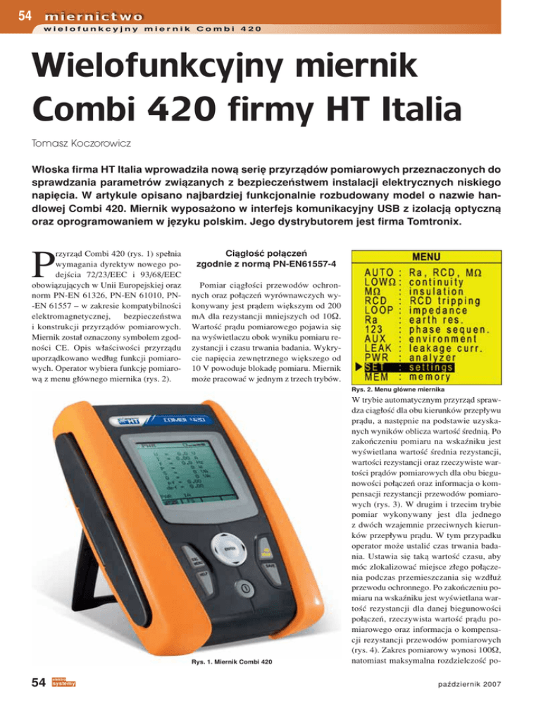 54 wielofunkcyjny miernik Combi 420 Wielofunkcyjny miernik Combi 420 firmy HT Italia Tomasz Koczorowicz W≥oska firma HT Italia wprowadzi≥a nowπ seriÍ przyrzπdÛw pomiarowych przeznaczonych do sprawdzania parametrÛw zwiπzanych z bezpieczeÒstwem instalacji elektrycznych niskiego napiÍcia. W artykule opisano najbardziej funkcjonalnie rozbudowany model o nazwie handlowej Combi 420. Miernik wyposaøono w interfejs komunikacyjny USB z izolacjπ optycznπ oraz oprogramowaniem w jÍzyku polskim. Jego dystrybutorem jest firma Tomtronix. rzyrzπd Combi 420 (rys. 1) spe≥nia wymagania dyrektyw nowego podejúcia 72/23/EEC i 93/68/EEC obowiπzujπcych w Unii Europejskiej oraz norm PN-EN 61326, PN-EN 61010, PN-EN 61557 ñ w zakresie kompatybilnoúci elektromagnetycznej, bezpieczeÒstwa i konstrukcji przyrzπdÛw pomiarowych. Miernik zosta≥ oznaczony symbolem zgodnoúci CE. Opis w≥aúciwoúci przyrzπdu uporzπdkowano wed≥ug funkcji pomiarowych. Operator wybiera funkcjÍ pomiarowπ z menu g≥Ûwnego miernika (rys. 2). P Ciπg≥oúÊ po≥πczeÒ zgodnie z normπ PN-EN61557-4 Pomiar ciπg≥oúci przewodÛw ochronnych oraz po≥πczeÒ wyrÛwnawczych wykonywany jest prπdem wiÍkszym od 200 mA dla rezystancji mniejszych od 10Ω. WartoúÊ prπdu pomiarowego pojawia siÍ na wyúwietlaczu obok wyniku pomiaru rezystancji i czasu trwania badania. Wykrycie napiÍcia zewnÍtrznego wiÍkszego od 10 V powoduje blokadÍ pomiaru. Miernik moøe pracowaÊ w jednym z trzech trybÛw. Rys. 2. Menu g≥Ûwne miernika Rys. 1. Miernik Combi 420 54 W trybie automatycznym przyrzπd sprawdza ciπg≥oúÊ dla obu kierunkÛw przep≥ywu prπdu, a nastÍpnie na podstawie uzyskanych wynikÛw oblicza wartoúÊ úredniπ. Po zakoÒczeniu pomiaru na wskaüniku jest wyúwietlana wartoúÊ úrednia rezystancji, wartoúci rezystancji oraz rzeczywiste wartoúci prπdÛw pomiarowych dla obu biegunowoúci po≥πczeÒ oraz informacja o kompensacji rezystancji przewodÛw pomiarowych (rys. 3). W drugim i trzecim trybie pomiar wykonywany jest dla jednego z dwÛch wzajemnie przeciwnych kierunkÛw przep≥ywu prπdu. W tym przypadku operator moøe ustaliÊ czas trwania badania. Ustawia siÍ takπ wartoúÊ czasu, aby mÛc zlokalizowaÊ miejsce z≥ego po≥πczenia podczas przemieszczania siÍ wzd≥uø przewodu ochronnego. Po zakoÒczeniu pomiaru na wskaüniku jest wyúwietlana wartoúÊ rezystancji dla danej biegunowoúci po≥πczeÒ, rzeczywista wartoúÊ prπdu pomiarowego oraz informacja o kompensacji rezystancji przewodÛw pomiarowych (rys. 4). Zakres pomiarowy wynosi 100Ω, natomiast maksymalna rozdzielczoúÊ popaüdziernik 2007 wielofunkcyjny miernik Combi 420 Rezystancja izolacji zgodnie z normπ PN-EN61557-2 Miernik mierzy rezystancjÍ izolacji przy jednej z piÍciu wartoúci napiÍcia prÛby 50 / 100 / 250 / 500 / 1000 V. Badanie moøe byÊ prowadzone w jednym z dwÛch trybÛw pracy ñ rÍcznym i jako pomiar w wyznaczonym czasie. Uøytkownik ustala wartoúÊ progowπ rezystancji izolacji. Jeøeli zmierzona wartoúÊ jest mniejsza od wartoúci progowej, wÛwczas w≥πcza siÍ sygnalizacja akustyczna. Przyrzπd wyposaøono w dwusekundowe znaczniki akustyczne, ktÛre u≥atwiajπ kontrolÍ czasu trwania pomiaru. W trybie rÍcznym pomiar trwa dwie sekundy, lecz jeøeli przycisk uruchamiajπcy test pozostaje naciúniÍty, to badanie trwa nieprzerwanie aø do momentu zwolnienia przycisku. W drugim trybie pracy operator definiuje czas trwania pomiaru. W czasie trwania pomiaru na wyúwietlaczu jest dostÍpna informacja o wyniku pomiaru rezystancji izolacji, o rzeczywistym A M A L K miaru 0,01Ω Przyrzπd wyposaøono w sygnalizacjÍ akustycznπ informujπcπ o tym, w jakim zakresie zawiera siÍ wynik badania, oraz w funkcjÍ kompensacji rezystancji przewodÛw pomiarowych. napiÍciu prÛby oraz o czasie trwania badania (rys. 5). Jeøeli na mierzonym obiekcie wystÍpuje napiÍcie zewnÍtrzne wiÍksze od 30 V, na wyúwietlaczu przyrzπdu pojawia siÍ komunikat ostrzegajπcy, a procedura pomiaru zostaje zablokowana. Miernik sygna≥em akustycznym przekazuje informacjÍ o tym, øe nie moøe wygenerowaÊ ustalonego napiÍcia prÛby. Moøe siÍ tak zdarzyÊ, gdy wartoúÊ mierzonej rezystancji jest zbyt ma≥a lub pojemnoúÊ obiektu jest na tyle duøa, øe nie zdπøy siÍ na≥adowaÊ podczas trwania badania. Po zakoÒczeniu pomiaru Combi 420 automatycznie roz≥adowuje pojemnoúci w badanym uk≥adzie. Zakres pomiarowy dla napiÍcia prÛby 500 V wynosi 1 GΩ, a prπd zwarciowy 2,2 mA. E Rys. 4. Pomiar ciπg≥oúci dla jednego kierunku przep≥ywu prπdu Rys. 5. Pomiar rezystancji izolacji w wyznaczonym czasie R Rys. 3. Pomiar ciπg≥oúci w trybie automatycznym Wy≥πczniki rÛønicowoprπdowe zgodnie z normπ PN-EN61557-6 Miernik umoøliwia przeprowadzenie kompleksowej oceny funkcjonowania wszystkich typÛw wy≥πcznikÛw rÛønicowoprπdowych: zwyk≥ych, selektywnych oraz czu≥ych na prπdy wyprostowane. Pomiary sπ wykonywane dla piÍciu wartoúci znamionowych prπdÛw rÛønicowych (10, 30, 100, 300, 500 mA). Operator wybiera jeden z dwÛch trybÛw pracy: rÍczny lub automatyczny. W trybie rÍcznym przyrzπd uruchamia jednokrotny pomiar czasu zadzia≥ania wy≥πcznika, rzeczywistego prπdu zadzia≥ania wy≥πcznika lub napiÍcia dotykowego przy wybranym znamionowym prπdzie rÛønicowym. Czas zadzia≥ania jest mierzony okreúlonym zboczem (narastajπcym lub opadajπcym) oraz wartoúciπ prπdu rÛønicowego (do wyboru prπd rÛwny po≥owie, jedno-, dwu- lub piÍciokrotnej wartoúci znamionowego prπdu rÛønicowego badanego wy≥πcznika). Podczas pomiaru rzeczywistego prπdu zadzia≥ania przyrzπd generuje narastajπcy w czasie prπd rÛønico- 56 wielofunkcyjny miernik Combi 420 wy oraz rejestruje natÍøenie prπdu, przy ktÛrym nastπpi≥o wyzwolenie wy≥πcznika. W pierwszej fazie pomiaru napiÍcia dotykowego sprawdzana jest impedancja pÍtli przewÛd fazowy ñ przewÛd ochronny przy ma≥ym prπ