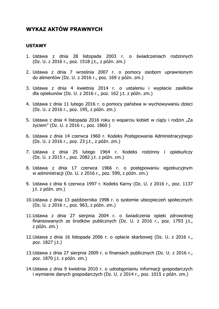 WYKAZ AKTÓW PRAWNYCH USTAWY 1. Ustawa z dnia 28 listopada 2003 r. o (Dz. U. z 2016 r., poz. 1518 j.t., z późn. zm.) świadczeniach rodzinnych 2. Ustawa z dnia 7 września 2007 r. o pomocy osobom uprawnionym do alimentów (Dz. U. z 2016 r., poz. 169 z późn. zm.) 3. Ustawa z dnia 4 kwietnia 2014 r. o ustaleniu i wypłacie zasiłków dla opiekunów (Dz. U. z 2016 r., poz. 162 j.t. z późn. zm.) 4. Ustawa z dnia 11 lutego 2016 r. o pomocy państwa w wychowywaniu dzieci (Dz. U. z 2016 r., poz. 195, z późn. zm.) 5. Ustawa z dnia 4 listopada 2016 roku o wsparciu kobiet w ciąży i rodzin „Za życiem” (Dz. U. z 2016 r., poz. 1860 ) 6. Ustawa z dnia 14 czerwca 1960 r. Kodeks Postępowania Administracyjnego (Dz. U. z 2016 r., poz. 23 j.t., z późn. zm.) 7. Ustawa z dnia 25 lutego 1964 r. Kodeks (Dz. U. z 2015 r., poz. 2082 j.t. z późn. zm.) rodzinny i opiekuńczy 8. Ustawa z dnia 17 czerwca 1966 r. o postępowaniu egzekucyjnym w administracji (Dz. U. z 2016 r., poz. 599, z późn. zm.) 9. Ustawa z dnia 6 czerwca 1997 r. Kodeks Karny (Dz. U. z 2016 r., poz. 1137 j.t. z późn. zm.) 10.Ustawa z dnia 13 października 1998 r. o systemie ubezpieczeń społecznych (Dz. U. z 2016 r., poz. 963, z późn. zm.) 11.Ustawa z dnia 27 sierpnia 2004 r. o świadczenia opieki zdrowotnej finansowanych ze środków publicznych (Dz. U. z 2016 r., poz. 1793 j.t., z późn. zm.) 12.Ustawa z dnia 16 listopada 2006 r. o opłacie skarbowej (Dz. U. z 2016 r., poz. 1827 j.t.) 13.Ustawa z dnia 27 sierpnia 2009 r. o finansach publicznych (Dz. U. z 2016 r., poz. 1870 j.t. z późn. zm.) 14.Ustawa z dnia 9 kwietnia 2010 r. o udostępnianiu informacji gospodarczych i wymianie danych gospodarczych (Dz. U. z 2014 r., poz. 1015 z późn. zm.) 15.Ustawa z dnia 9 października 2015 r. o zmianie ustawy o terminach zapłaty w transakcjach handlowych, ustawy – Kodeks cywilny oraz niektórych innych ustaw (Dz. U. z 2015 r., poz. 1830) 16.art. 2 ustawy z dnia 15 maja 2015 r. o zmianie ustawy o świadczeniach rodzinnych (Dz. U. z 2015 r., poz. 995) 17.art. 19 ustawy z dnia 24 lipca 2015 r. o zmianie ustawy o świadczeniach rodzinnych oraz niektórych innych ustaw (Dz. U. z 2015 r., poz. 1217, z późn. zm.) 18.art. 4; art. 8 i 9 ustawy z dnia 24 lipca 2015 r. o zmianie ustawy o pomocy osobom uprawnionym do alimentów, ustawy o emeryturach i rentach z Funduszu Ubezpieczeń Społecznych oraz ustawy o świadczeniach rodzinnych (Dz. U. z 2015 r., poz. 1302) 19.art. 9 ustawy z dnia 10 lipca 2015 r. o zmianie ustawy o świadczeniach rodzinnych oraz niektórych innych ustaw (Dz. U. z 2015 r., poz. 1359, z późn. zm.) ROZPORZĄDZENIA 20.Rozporządzenie Ministra Pracy i Polityki Społecznej z dnia 2 listopada 2007 r. w sprawie systemów teleinformatycznych stosowanych do realizacji zadań w zakresie świadczeń rodzinnych w urzędach administracji publicznej (Dz. U. z 2007 r. Nr 216, poz. 1610) 21.Rozporządzenie Rady Ministrów z dnia 18 kwietnia 2008 r. w sprawie szczegółowych zasad i trybu postępowania w sprawach rozliczania składek, do których poboru jest zobowiązany Zakład Ubezpieczeń Społecznych (Dz. U. Nr 78, poz. 465, z późn. zm.) 22.Rozporządzenie Ministra Pracy i Polityki Społecznej z dnia 23 października 2009 r. w sprawie określenia wzorów zgłoszeń do ubezpieczeń społecznych i ubezpieczenia zdrowotnego, imiennych raportów miesięcznych i imiennych raportów korygujących, zgłoszeń płatnika deklaracji rozliczeniowych i deklaracji rozliczeniowych korygujących, zgłoszeń danych o pracy w szczególnych warunkach lub o szczególnym charakterze oraz innych dokumentów (Dz. U. z 2016 r., poz. 222 j.t. z późn. zm.) 23.Rozporządzenie Ministra Rodziny, Pracy i Polityki Społecznej z dnia 21 grudnia 2016 r. w sprawie wzoru wniosku o jednorazowe świadczenie z tytułu urodzenia się dziecka, u którego zdiagnozowano ciężkie i nieodwracalne upośledzenie albo nieuleczalną chorobę zagrażającą życiu, które powstały w prenatalnym okresie rozwoju dziecka lub w czasie porodu (Dz. U. z 2016 r., poz. 2234) 24.Rozporządzenie Ministra Finansów z dnia 2 marca 2010 r. w sprawie szczegółowej klasyfikacji dochodów, wydatków, przychodów i rozchodów oraz środków pochodzących ze źródeł zagranicznych (Dz. U. z 2014 r., poz. 1053 j.t. z późn. zm.) 25.Rozporządzenie Ministra Pracy i Polityki Społecznej z dnia 22 czerwca 2010 r. w sprawie systemów teleinformatycznych stosowanych do realizacji zadań w zakresie świadczeń z funduszu alimentacyjnego w urzędach administracji publicznej (Dz. U. z 2010 r., Nr 118, poz. 798) 26.Rozporządzenie Ministra Zdrowia z dnia 14 września 2010 r. w sprawie formy opieki medycznej nad kobietą w ciąży, uprawniającej do dodatku z tytułu urodzenia dziecka oraz wzoru zaświadczenia potwierdzającego pozostawanie pod tą opieką (Dz. U. Nr 183, poz. 1234) 27.Rozporządzenie Prezesa Rady Ministrów z dnia 18 stycznia 2011 r. w sprawie instrukcji kancelaryjnej, jednolitych rzeczowych wykazów akt oraz instrukcji w sprawie organizacji i zakresu działania archiwów zakładowych (Dz. U. 2011 r. Nr 14, poz. 67, z późn. zm.) 28.Rozporządzenie Ministra Pracy i Polityki Społecznej z dnia 23 marca 2011 r. w sprawie wzoru kwestionariusza wywiadu alimentacyjnego oraz wzoru oświadczenia majątkowego dłużnika alimentacyjnego (Dz. U. 2011 r. Nr 73, poz. 395) 29.Rozporządzenie Ministra Finansów z dnia 16 maja 2014 r. w sprawie wzorów tytułów wykonawczych stosowanych w egzekucji administracyjnej (Dz. U. z 2016 r., poz. 1305) 30.Rozporządzenie Rady Ministrów z dnia 7 sierpnia 2015 r. w sprawie wysokości dochodu rodziny albo dochodu osoby uczącej się stanowiących podstawę ubiegania się o zasiłek rodzinny i specjalny zasiłek opiekuńczy, wysokości Świadczeń Rodzinnych oraz wysokości zasiłku dla opiekuna (Dz. U. z 2015 r., poz. 1238) 31.Rozporządzenie Ministra Finansów z dnia 11 września 2015 r. w sprawie wysokości kosztów upomnienia skierowane prz