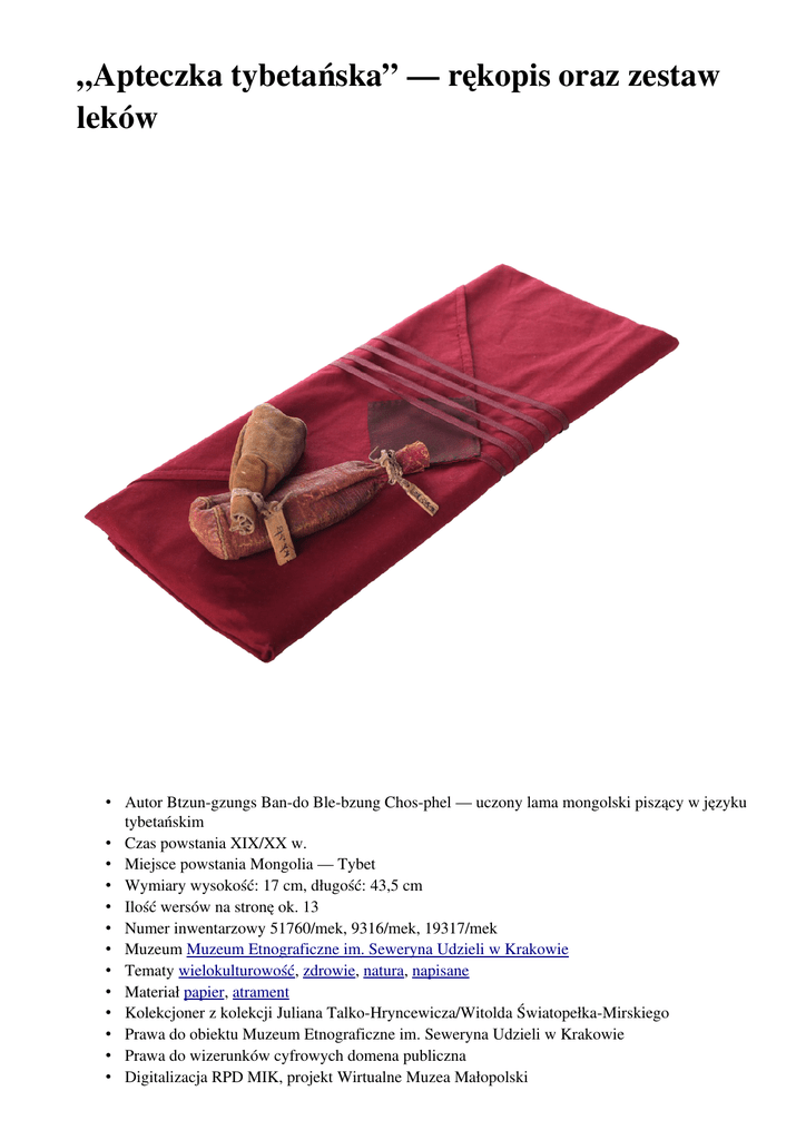„Apteczka tybetańska” — rękopis oraz zestaw leków • Autor Btzungzungs Bando Blebzung Chosphel — uczony lama mongolski piszący w języku tybetańskim • Czas powstania XIX/XX w. • Miejsce powstania Mongolia — Tybet • Wymiary wysokość: 17 cm, długość: 43,5 cm • Ilość wersów na stronę ok. 13 • Numer inwentarzowy 51760/mek, 9316/mek, 19317/mek • Muzeum Muzeum Etnograficzne im. Seweryna Udzieli w Krakowie • Tematy wielokulturowość, zdrowie, natura, napisane • Materiał papier, atrament • Kolekcjoner z kolekcji Juliana TalkoHryncewicza/Witolda ŚwiatopełkaMirskiego • Prawa do obiektu Muzeum Etnograficzne im. Seweryna Udzieli w Krakowie • Prawa do wizerunków cyfrowych domena publiczna • Digitalizacja RPD MIK, projekt Wirtualne Muzea Małopolski • Tagi zdrowie, choroba, ciało, buddyzm, 2D, rękopis, natura, medycyna, leki Apteczka tybetańska: rękopis medyczny i leki Rękopis napisany pismem „dbucan” na 102 kartach papieru, zapisanych obustronnie, atramentem czarnym i czerwonym; papier z rosyjskiej fabryki „Sumkina”. Autor rękopisu medycznego: Btzungzungs Bando Blebzung Chosphel — uczony lama mongolski piszący w języku tybetańskim. Tytuł rękopisu (tłumaczenie): Esencja bogactwa serca, (czyli) w jednej księdze zebrane z dzieł medycznych opisy symptomów chorób i sposobów ich leczenia. Tytuł oryginału (transliteracja): Sman gžung khungs ma rnams las nad kyi rtags bcos sogs Thor bur ̒ byung ba phyogs gcig tu bsgrigs pa gces btus sñing nor žes bya ba bžugs so. Tłumaczenie (z oryginału) tytułu rękopisu i nazw leków oraz ogólny opis zawartości rękopisu: Ireneusz Kania — znany krakowski tłumacz i tybetolog. Leki w woreczkach skórzanych Wymiary — długość: 15,5 cm i 17 cm Kolekcja: zesłańca Witolda ŚwiętopełkaMirskiego, pozyskana przez profesora Uniwersytetu Jagiellońskiego Juliana TalkoHryncewicza w latach 1892—1908 podczas badań we wschodniej Syberii i przekazana Polskiej Akademii Umiejętności w Krakowie, skąd w 1921 roku trafiła do Muzeum Etnograficznego w Krakowie. Znajdująca się w zbiorach krakowskiego Muzeum Etnograficznego tak zwana apteczka tybetańska jest jednym z nielicznych na świecie pochodzących z przełomu XIX i XX wieku kompletnych opisów medycyny tybetańskiej wraz z zestawem leków i przedstawieniem ich zastosowania. W jej skład wchodzą dwa rękopisy medyczne i prawie 300 leków, a właściwie produktów do ich sporządzania — nasion, roślin i owoców oraz minerałów, w większości opatrzonych metryczkami w języku tybetańskim. Zarówno leki, jak i rękopisy zostały zebrane i spisane na przełomie XIX i XX wieku na terenach północnej Mongolii i Buriacji, objętych kiedyś wpływami kultury Tybetu. Całość pozyskana została od kolekcjonerazesłańca Witolda ŚwiętopełkaMirskiego przez Juliana TalkoHryncewicza (1850—1936), antropologa i profesora Uniwersytetu Jagiellońskiego, w latach 1892—1908 lekarza we wschodniej Syberii, w tak zwanym Kraju Zabajkalskim, gdzie równocześnie przeprowadzał badania antropologiczne wśród Buriatów, Tunguzów i Mongołów. Jego kolekcja związana z buddyzmem, wraz z pozyskaną od zesłańca apteczką tybetańską, trafiła do Muzeum Etnograficznego im. Seweryna Udzieli w 1921 roku. Integralną część z lekami stanowi jeden z rękopisów zatytułowany Esencja bogactwa serca, (czyli) w jednej księdze zebrane z dzieł medycznych opisy symptomów chorób i sposobów ich leczenia, w którym są opisane w większości leki wchodzące w skład apteczki. Jest to swoiste kompendium wiedzy medycznej całkowicie opartej na indo tybetańskiej teorii i praktyce medycznej, która rozwijała się od ponad 2000 tysięcy lat. To kompendium medyczne, mimo że zawiera elementy medycyny ludowej, należy zaliczyć do tak zwanych uczonych, a nie ludowych, gdyż opiera się na indyjskich traktatach pisanych dotyczących leczenia i chorób, zawartych w najstarszych tekstach wedyjskich. Podstawą są tu teksty Ajurwedy (Āyurveda), czyli Wiedzy o życiu (z sanskrytu: āyus — życie; veda — wiedza), która należy do kategorii upaweda, czyli tekstów uzupełniających daną Wedę; w tym przypadku jest to nauka pomocnicza najmłodszej z czterech Wed — Atharwawedy. Ajurweda zajmuje się człowiekiem całościowo, zarówno jego zdrowiem fizycznym, psychicznym, jak i duchowym. Według wierzeń i nauk wschodnich, człowiek i jego ciało to odbicie sił kosmicznych. Jego organizm to mikrokosmos odzwierciedlający makrokosmos i zawierający się w nim. Z tego powodu poznanie sił kosmicznych jest równie ważne dla medycyny jak poznanie leków i terapia. Teoria i praktyka medyczna na terenie Mongolii i Buriacji przejęte zostały prawie w całości, łącznie z innymi gałęziami wiedzy i religią, a nawet językiem nauki i liturgii, z Tybetu. Medycyna tybetańska zaś jest systemem opierającym się na bardzo starej tradycji pisanej, pochodzącej z Indii, a także z Chin i Persji. Podstawy i zasady teorii medycznej zostały w całości zaczerpnięte z Indii, skąd przejęto w okresie od VIII do XI wieku wraz z innymi pismami buddyjskimi podstawowe księgi medyczne i komentarze do nich, w tym słynny czteroksiąg Catuștantra (tyb. Rgyud bzi), przypisywany legendarnemu nauczycielowi medycyny — Bhaișajyaguru, którego kult rozpowszechnił się w Centralnej Azji i Chinach już w III—IV wieku n.e. Jego sanskrycki oryginał nie zachował się, ale pozostało tłumaczenie na tybetański dokonane około połowy VIII wieku. Jest to praca złożona; zawiera w sobie również elementy medycyny chińskiej włożone w ramy indyjskiej tradycyjnej medycyny. Znajdziemy tam chińskie nazwy roślin, których właściwości są opisane zgodnie z indyjskim systemem medycznym i indyjskimi nazwami organów ciała sklasyfikowanych zgodnie z chińskim systemem według zasady yingyang. Są tam też odniesienia zarówno do indyjskiej etiologii, dotyczącej p