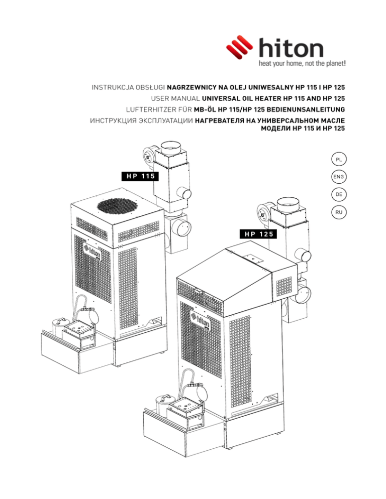INSTRUKCJA OBSŁUGI NAGRZEWNICY NA OLEJ UNIWESALNY HP 115 I HP 125 USER MANUAL UNIVERSAL OIL HEATER HP 115 AND HP 125 LUFTERHITZER FÜR MB-ÖL HP 115/HP 125 BEDIENUNSANLEITUNG ИНСТРУКЦИЯ ЭКСПЛУАТАЦИИ НАГРЕВАТЕЛЯ НА УНИВЕРСАЛЬНОМ МАСЛЕ МОДЕЛИ HP 115 И HP 125 PL H P 11 5 ENG DE RU H P 12 5 HITON - heat your home, not the planet |1 PL Spis treści: ENG Table of contents: Rysunki techniczne 3 Figures and drawings 3 1. Przeznaczenie 6 1. Use 12 2. Warunki środowiskowe składowania 6 2.Storage conditions 12 3. Warunki środowiskowe użytkowania 6 3. Conditions for use 12 4. Cechy charakterystyczne sterownika 6 4. Characteristics of the control panel 12 5. Aspekty bezpieczeństwa 6 5. Safety measures 12 6. Konstrukcja urządzenia 6 6. Construction of the heater 12 7. Instalacja urządzenia 7 7. Installation 13 8. Opis działania urządzenia 8 8. Functionning 14 9. Obsługa nagrzewnic 8 9. How to operate the heater 14 10. Naprawa usterek 9 10. Failures and remedies 15 DANE TECHNICZNE 10 TECHNICAL SPECIFICATIONS 16 DEKLARACJA ZGODNOŚCI WE 11 EC DECLARATION OF CONFORMITY 17 DE Inhaltsverzeichnis: RU СОДЕРЖАНИЕ: Technischen Zeichnungen 3 Технические рисунки 3 1. Bestimmung 18 1. Предназначение 24 2. Umgebungsbedingungen der Lagerung 18 2. Условия складского хранения 24 3. Umgebungsbedingungen der Nutzung 18 3. Эксплуатационные условия 24 4. Eigenschaften des Steuerers 18 4. Характеристика контроллера 24 5. Sicherheitsaspekte 18 5. Безопасность 24 6. Einrichtungskonstruktion 18 6. Конструкция устройства 25 7. Einrichtungsinstallation 19 7. Установка устройства 25 8. Beschreibung der Einrichtungswirkung 20 8. Описание работы устройства 26 9. Bedienung des Lufterhitzers 20 9. Обслуживание нагревателя 27 10. Fehlerbehebung 21 10. Устранение неисправностей 28 TECHNISCHEN DATEN 22 ТЕХНИЧЕСКИЕ ДАННЫЕ 29 EG-KONFORMITÄTSERKLÄRUNG 23 ДЕКЛАРАЦИЯ СООТВЕТСТВИЯ 30 2| www.hiton.pl HITON - heat your home, not the planet |3 T100 MW 6 5 4 3 2 1 JP-1 2 1 PUMP 2 1 M JP-4 JP-2 3 2 1 JP-3 4| www.hiton.pl min. 500 cm Ø 150 UNIVERSAL! OIL START HITON - heat your home, not the planet DISEL! OIL STOP |5 PL Aby zapewnić właściwe użytkowanie i bezawaryjną eksploatację pieca należy dokładnie zapoznać się z niniejszą instrukcją. 1. Przeznaczenie Nagrzewnica na olej uniwersalny typu HP 115 i HP 125 przeznaczona jest do ogrzewania pomieszczeń przemysłowych bez systemu centralnego ogrzewania (warsztaty, serwisy samochodowe, hale przemysłowe, magazyny, budynki inwentarskie, piwnice, garaże, itp). Piec może pracować na większości olejów pochodzenia mineralnego i roślinnego, takich jak oleje silnikowe, opałowe, przekładniowe, hydrauliczne, oleje typu HBO I, II, III o lepkości kinematycznej max 6,00 mm²/s w temperaturze 20ºC, temperaturze punktu zapłonu nie niższej niż 40ºC i gęstości nie mniejszej niż 0,94 g/cm³. Ze względu na lokalne przepisy zaleca się, aby w Polsce stosować olej napędowy, olej opałowy lub biodiesel. Nie stosować olejów transformatorowych. Mogą one zawierać substancje szkodliwe dla działania pieca. 2. Warunki środowiskowe składowania Nagrzewnica na olej uniwersalny typu HP 115 i HP 125 powinna być składowana w następujących warunkach: temperatura -20 - +85°C wilgotność względna 5-85% ciśnienie 8001200hPa V brak zapylenia środowisko wolne od zanieczyszczeń chemicznych 6| V 3. Warunki środowiskowe użytkowania tychmiastowe przejście pieca w tryb Przegrzanie. Nagrzewnica na olej uniwersalny typu HP 115 i HP 125 powinna być użytkowana w następujących warunkach: Nagrzewnica wyposazona jest także w wagowy czujnik umieszczony pod komorą spalania [PKT I / 4]. temperatura 0-30°C wilgotność względna 5-85% Napełnienie miseczki powoduje natychmiastowe przejście pieca w tryb Przelanie. ciśnienie 8001200hPa stopień ochrony przed wpływem środowiska IP20 dobra wentylacja ogrzewanego pomieszczenia V 4. Cechy charakterystyczne sterownika ǗPRˮOLZR˪ˢUHJXODFMLPRF\SLHFD w zakresie 15 i 22 kW (HP 115) oraz 22 i 30 kW (HP 125), Ǘ]DEH]SLHF]HQLHSU]HGSU]HJU]DQLHP paleniska, Połączenie panelu sterującego pieca z innymi elementami systemu (czujniki, pompa, wentylator) jest wykonywane fabrycznie . W trakcie normalnej eksploatacji, ze względu na bezpieczeństwo obsługi, nie dopuszcza się do jakiejkolwiek ingerencji w osłoniętą i zaplombowaną część sterownika pieca oraz naruszanie integralności przewodów. Jakiekolwiek działanie nieuprawnionej osoby grozi porażeniem prądem elektrycznym (230V AC, 50Hz) oraz poparzeniem. 6. Konstrukcja urządzenia Ǘ]DEH]SLHF]HQLHSU]HGSU]HODQLHP oleju w palenisku, ǗDXWRPDW\F]QH]DFKRZDQLHQDVWDZ przy zaniku napięcia zasilającego. 5. Aspekty bezpieczeństwa Nagrzewnica na olej uniwersalny HP 115 i HP 125 jest zasilana z sieci prądu przemiennego 230V/50Hz. Na obudowie modułu sterującego zainstalowano bezpiecznik z wkładką topikową (1A, 250V). Wymiana tego bezpiecznika powinna być wykonywana bezwarunkowo przy wyłączonym zasilaniu zewnętrznym układu (230V AC, 50Hz). Nagrzewnica na olej uniwersalny typu HP 115 i HP 125 jest wyposażona w dwa czujniki bimetaliczne zapewniające bezpieczną i ekonomiczną pracę urządzenia. Rys. l. Budowa nagrzewnicy: Oznaczenia Zabezpieczenie przed przegrzaniem (HP 125) Pokrywa komory paleniska Przewód podawania oleju Termostat przy komorze spalania Pompa i sterownik Zbiornik paliwa Czujnik bimetaliczny [PKT 4 niniejszej instrukcji] umieszczony na komorze spalania reaguje zwarciem styków, gdy temperatura paleniska przekroczy 40°C i rozwarciem styków, gdy temperatura spadnie poniżej 35°C. W sytuacjach alarmowych (przegrzanie, przelanie ol