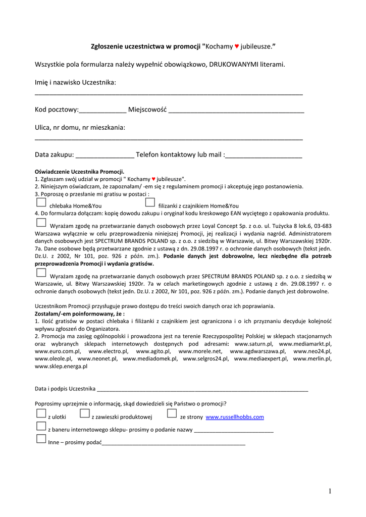 Zgłoszenie uczestnictwa w promocji "Kochamy ♥ jubileusze.” Wszystkie pola formularza należy wypełnid obowiązkowo, DRUKOWANYMI literami. Imię i nazwisko Uczestnika: _________________________________________________________________________ Kod pocztowy:_____________ Miejscowośd _____________________________________ Ulica, nr domu, nr mieszkania: _________________________________________________________________________ Data zakupu: ________________ Telefon kontaktowy lub mail :_____________________ Oświadczenie Uczestnika Promocji. 1. Zgłaszam swój udział w promocji " Kochamy ♥ jubileusze". 2. Niniejszym oświadczam, że zapoznałam/ -em się z regulaminem promocji i akceptuję jego postanowienia. 3. Poproszę o przesłanie mi gratisu w postaci : chlebaka Home&You filizanki z czajnikiem Home&You 4. Do formularza dołączam: kopię dowodu zakupu i oryginał kodu kreskowego EAN wyciętego z opakowania produktu. Wyrażam zgodę na przetwarzanie danych osobowych przez Loyal Concept Sp. z o.o. ul. Tużycka 8 lok.6, 03-683 Warszawa wyłącznie w celu przeprowadzenia niniejszej Promocji, jej realizacji i wydania nagród. Administratorem danych osobowych jest SPECTRUM BRANDS POLAND sp. z o.o. z siedzibą w Warszawie, ul. Bitwy Warszawskiej 1920r. 7a. Dane osobowe będą przetwarzane zgodnie z ustawą z dn. 29.08.1997 r. o ochronie danych osobowych (tekst jedn. Dz.U. z 2002, Nr 101, poz. 926 z późn. zm.). Podanie danych jest dobrowolne, lecz niezbędne dla potrzeb przeprowadzenia Promocji i wydania gratisów. Wyrażam zgodę na przetwarzanie danych osobowych przez SPECTRUM BRANDS POLAND sp. z o.o. z siedzibą w Warszawie, ul. Bitwy Warszawskiej 1920r. 7a w celach marketingowych zgodnie z ustawą z dn. 29.08.1997 r. o ochronie danych osobowych (tekst jedn. Dz.U. z 2002, Nr 101, poz. 926 z późn. zm.). Podanie danych jest dobrowolne. Uczestnikom Promocji przysługuje prawo dostępu do treści swoich danych oraz ich poprawiania. Zostałam/-em poinformowany, że : 1. Ilośd gratisów w postaci chlebaka i filiżanki z czajnikiem jest ograniczona i o ich przyznaniu decyduje kolejnośd wpływu zgłoszeo do Organizatora. 2. Promocja ma zasięg ogólnopolski i prowadzona jest na terenie Rzeczypospolitej Polskiej w sklepach stacjonarnych oraz wybranych sklepach internetowych dostępnych pod adresami: www.saturn.pl, www.mediamarkt.pl, www.euro.com.pl, www.electro.pl, www.agito.pl, www.morele.net, www.agdwarszawa.pl, www.neo24.pl, www.oleole.pl, www.neonet.pl, www.mediadomek.pl, www.selgros24.pl, www.mediaexpert.pl, www.merlin.pl, www.sklep.energa.pl Data i podpis Uczestnika _____________________________________________________________________ Poprosimy uprzejmie o informację, skąd dowiedzieli się Paostwo o promocji? z ulotki z zawieszki produktowej ze strony www.russellhobbs.com z baneru internetowego sklepu- prosimy o podanie nazwy __________________________ Inne – prosimy podad_______________________________________________ 1