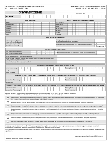 Wojewódzki Ośrodek Ruchu Drogowego w Pile UL. Lotnicza 6, 64-920 Piła www.word.pila.pl, [email protected] +48 67 212 07 82, +48 67 212 07 83 OŚWIADCZENIE …………………………………………………………………………………………………………………….. miejscowość, data Nr PKK DANE OSOBOWE ADRES STAŁEGO MIEJSCA ZAMIESZKANIA PESEL Kod Pocztowy Obywatelstwo Miejscowość Nazwisko 1 Ulica Nazwisko 2 Nr budynku Imiona Nr lokalu Miejsce ur E-mail Kraj ur Telefony - DANE DOTYCZĄCE EGZAMINU Kategoria prawa jazdy lub pozwolenia, dla której ma być przeprowadzony egzamin państwowy. Nazwa organu wydającego prawo jazdy lub pozwolenie, który wygenerował profil kandydata na kierowcę. teoretyczna* Część egzaminu państwowego, jaka ma być przeprowadzona. praktyczna* DANE DOTYCZĄCE SZKOLENIA Data rozpoczęcia szkolenia D D - M M - R R R R Data zakończenia szkolenia D D - M M - R R R R Kategoria prawa jazdy lub pozwolenia, której dotyczyło szkolenie Numer zaświadczenia o ukończeniu szkolenia Numer ośrodka szkolenia kierowców lub innego podmiotu prowadzącego szkolenie, w którym było ono przeprowadzone Numer instruktora, który prowadził szkolenie POSIADANE UPRAWNIENIA DO KIEROWANIA POJAZDAMI Numer prawa jazdy Data wydania D D - M M - R R R R Kategorie Organ wydający DANE DOTYCZĄCE ORZECZENIA LEKARSKIEGO O BRAKU PRZECIWWSKAZAŃ ZDROWOTNYCH DO KIEROWANIA POJAZDEM Numer orzeczenia Data wydania D D - M M - R R R R Zakres (kat. Prawa jazdy) Termin ważności D D - M M - R R R R Ograniczenia O ILE JEST WYMAGANE - DANE DOTYCZĄCE ORZECZENIA PSYCHOLOGICZNEGO O BRAKU PRZECIWWSKAZAŃ PSYCHOLOGICZNYCH DO KIEROWANIA POJAZDEM Numer orzeczenia Data wydania D D - M M - R R R R Zakres (kat. Prawa jazdy) Termin ważności D D - M M - R R R R Na dzień złożenia Oświadczenia spełniam wymagania, o których mowa w art. 11 ust.1 pkt 5 oraz nie występują przesłanki, o których mowa w art. 12 ust. 1 pkt 1-5 ustawy o kierujących pojazdami z dnia 5 stycznia 2011 r. tj.: Przebywam na terytorium Rzeczypospolitej Polskiej co najmniej przez 185 dni w każdym roku kalendarzowym ze względu na swoje więzi osobiste lub zawodowe albo przedstawiłem zaświadczenie, że studiuję co najmniej od 6 miesięcy.* Nie stwierdzono u mnie, w wyniku badania lekarskiego, aktywnej formy uzależnienia od alkoholu lub środka działającego podobnie do alkoholu.* Nie znajduję się w okresie i zakresie obowiązywania zakazu prowadzenia pojazdów mechanicznych, orzeczonego wobec mnie prawomocnym wyrokiem sądu.* Nie znajduję się w okresie i zakresie obowiązywania decyzji o cofnięciu uprawnienia do kierowania pojazdami lub zatrzymaniu prawa jazdy wydanej w stosunku do mnie.* Nie posiadam innego dokumentu stwierdzającego uprawnienie do kierowania pojazdem silnikowym w zakresie kategorii prawa jazdy, o którą się ubiegam.* Nie znajduję się w okresie obowiązywania zatrzymania prawa jazdy lub cofnięcia uprawnienia do kierowania pojazdami, które zdobyłem za granicą.* Nie ukończyłam/ukończyłem 18 lat, chcę uzyskać prawo jazdy kategorii AM, A1,B1 lub T oraz posiadam pisemną zgodę rodzica lub opiekuna.* Świadomy odpowiedzialności z art. 65 § 1 Kodeksu wykroczeń za umyślne wprowadzenie w błąd organu państwowego, oświadczam zgodność danych zawartych w niniejszym Oświadczeniu ze stanem faktycznym, co potwierdzam własnoręcznym podpisem. Wyrażam zgodę na przetwarzanie moich danych osobowych dla potrzeb niezbędnych do przeprowadzenia egzaminu na prawo jazdy i wydania uprawnień w zakresie o jaki się ubiegam. ……………………………………………………………..…… czytelny podpis osoby składającej Oświadczenie * właściwe pole proszę zaznaczyć znakiem: X