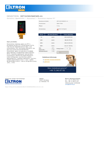 DENSIT RONDET 043WVNMCMIS-4A Oświ etl eni ei Optoel ektr oni ka > Wyświ etl acz e > Wyświ etl acz edotykoweTFT N a z wa p ro d u ktu : DET 04 3WVNMCMI S -4 A P ro d u c en t: DENS I T RON Wa g a : 0.2kg Ka rta ka ta logowa D o ku m en ty: O pis pro duktu: Wyświ etl acz dotykowyopar tynaTFTo pr z ekątnej ekr anu4.3'',l i cz bakol or ów16,7 M, r odz i el cz ość48 0x8 00,kontr ast500:1,tr yb wyświ etl ani a:IPS,l um i nancj a350cd/m 2,kąt patr z eni a(U/D/L/R)8 0°/8 0°/8 0°/8 0°, wyświ etl acz opar tynakontr ol er z eILI98 06E, panel dotykowywi el opunktowypoj em ności owy (PCT),5punktówdotykowych,typi nter fej su wyświ etl acz a16/18 /24bi tRGBSPI(tyl kow tr ybi ekonfi gur acj i ),typi nter fej supanel a dotykowegoI2C,5punktówdotykowych,wym i ar y m oduł uwyświ etl acz a(sz er .xwys.xgł eb.) 69.16x120.05x4.13m m ,z akr estem per atur ypr acy -20°C...+7 0°C Ilo ś ć [brutto ] /[netto ] Cena [wa luta ] 1+ netto 48 3,49[PLN] 10 + netto 362,62[PLN] 25+ netto 338 ,44[PLN] 50+ netto 314,27 [PLN] Vat: Ilośćmin.: Wielokrotność: 23% 1sz t. 1sz t. Pod ajIlość: 0 + - dokosz yka Maszdodatkowepytania? +48713439755 Wł aści ci el skl epui nter netowego: Adres : 50-07 1Wr ocł aw pl .Wol ności 7 B https://skl ep.el tr on.pl /pl /p/18 194137 252640/det043wvnm cm i s-4a Biuro O bs ługiKlienta : tel .:+48 7 134397 55 fax+48 7 13441141 Infol i ni apn-pt.8 .00-16.00 skl ep@ el tr on.pl