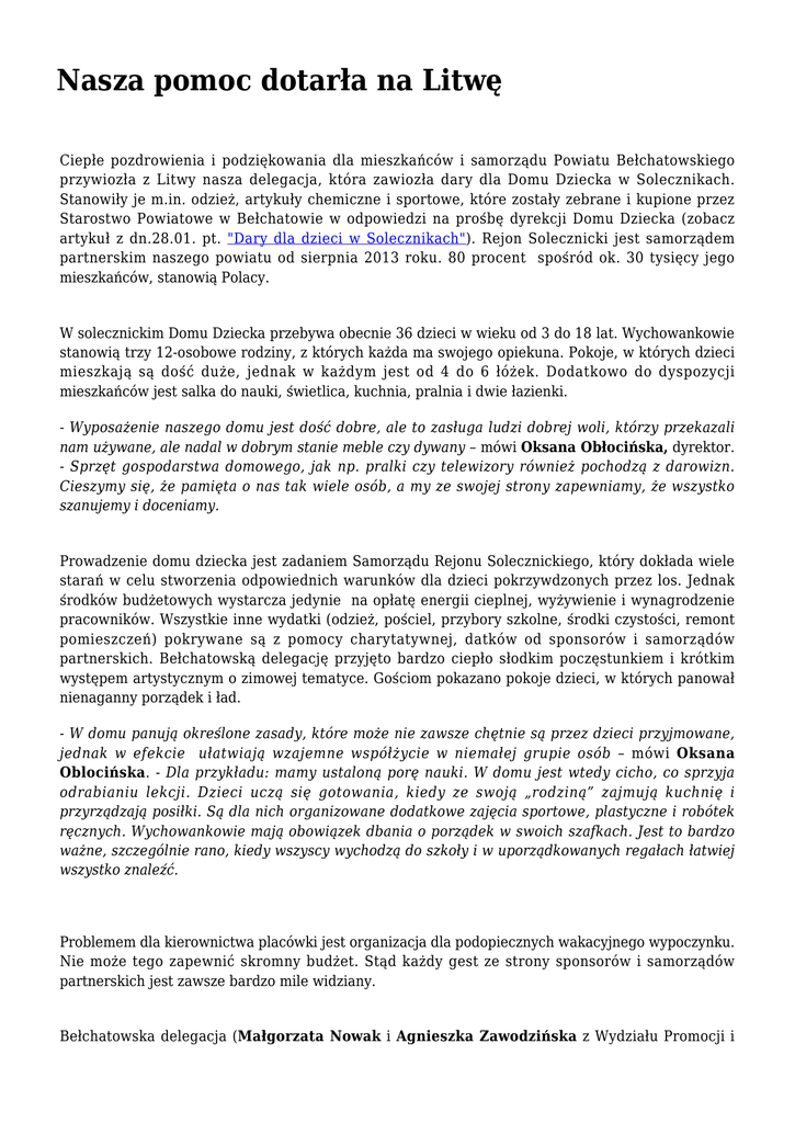 Nasza pomoc dotarła na Litwę Ciepłe pozdrowienia i podziękowania dla mieszkańców i samorządu Powiatu Bełchatowskiego przywiozła z Litwy nasza delegacja, która zawiozła dary dla Domu Dziecka w Solecznikach. Stanowiły je m.in. odzież, artykuły chemiczne i sportowe, które zostały zebrane i kupione przez Starostwo Powiatowe w Bełchatowie w odpowiedzi na prośbę dyrekcji Domu Dziecka (zobacz artykuł z dn.28.01. pt. "Dary dla dzieci w Solecznikach"). Rejon Solecznicki jest samorządem partnerskim naszego powiatu od sierpnia 2013 roku. 80 procent spośród ok. 30 tysięcy jego mieszkańców, stanowią Polacy. W solecznickim Domu Dziecka przebywa obecnie 36 dzieci w wieku od 3 do 18 lat. Wychowankowie stanowią trzy 12-osobowe rodziny, z których każda ma swojego opiekuna. Pokoje, w których dzieci mieszkają są dość duże, jednak w każdym jest od 4 do 6 łóżek. Dodatkowo do dyspozycji mieszkańców jest salka do nauki, świetlica, kuchnia, pralnia i dwie łazienki. - Wyposażenie naszego domu jest dość dobre, ale to zasługa ludzi dobrej woli, którzy przekazali nam używane, ale nadal w dobrym stanie meble czy dywany – mówi Oksana Obłocińska, dyrektor. - Sprzęt gospodarstwa domowego, jak np. pralki czy telewizory również pochodzą z darowizn. Cieszymy się, że pamięta o nas tak wiele osób, a my ze swojej strony zapewniamy, że wszystko szanujemy i doceniamy. Prowadzenie domu dziecka jest zadaniem Samorządu Rejonu Solecznickiego, który dokłada wiele starań w celu stworzenia odpowiednich warunków dla dzieci pokrzywdzonych przez los. Jednak środków budżetowych wystarcza jedynie na opłatę energii cieplnej, wyżywienie i wynagrodzenie pracowników. Wszystkie inne wydatki (odzież, pościel, przybory szkolne, środki czystości, remont pomieszczeń) pokrywane są z pomocy charytatywnej, datków od sponsorów i samorządów partnerskich. Bełchatowską delegację przyjęto bardzo ciepło słodkim poczęstunkiem i krótkim występem artystycznym o zimowej tematyce. Gościom pokazano pokoje dzieci, w których panował nienaganny porządek i ład. - W domu panują określone zasady, które może nie zawsze chętnie są przez dzieci przyjmowane, jednak w efekcie ułatwiają wzajemne współżycie w niemałej grupie osób – mówi Oksana Oblocińska. - Dla przykładu: mamy ustaloną porę nauki. W domu jest wtedy cicho, co sprzyja odrabianiu lekcji. Dzieci uczą się gotowania, kiedy ze swoją „rodziną” zajmują kuchnię i przyrządzają posiłki. Są dla nich organizowane dodatkowe zajęcia sportowe, plastyczne i robótek ręcznych. Wychowankowie mają obowiązek dbania o porządek w swoich szafkach. Jest to bardzo ważne, szczególnie rano, kiedy wszyscy wychodzą do szkoły i w uporządkowanych regałach łatwiej wszystko znaleźć. Problemem dla kierownictwa placówki jest organizacja dla podopiecznych wakacyjnego wypoczynku. Nie może tego zapewnić skromny budżet. Stąd każdy gest ze strony sponsorów i samorządów partnerskich jest zawsze bardzo mile widziany. Bełchatowska delegacja (Małgorzata Nowak i Agnieszka Zawodzińska z Wydziału Promocji i Rozwoju Powiatu w starostwie, Krzysztof Borowski – rzecznik prasowy) spotkała się także ze Zdzisławem Palewiczem, merem Rejonu Solecznickiego. Gospodarz podziękował za darowiznę, która oprócz wartości materialnej, jest także dowodem na owocną i skuteczną współpracę regionów: - Cieszę się, że nasza łączność narodowa i wzajemne zrozumienie są faktem. Życzę, żeby mieszkańcom powiatu bełchatowskiego wiodło się jak najlepiej w spokoju, zdrowi i zgodzie. Zapraszam do Solecznik. Podczas spotkania z merem poruszony został także temat ograniczania przez władze litewskie możliwości swobodnego używania języka polskiego przez obywateli polskich, mieszkańców Rejonu Solecznickiego. Za wywieszanie tabliczek z nazwami ulic w języku polskim nakładane są kary pieniężne na samorząd danego terenu. Mer zaapelował m.in. do regionów partnerskich w Polsce o wsparcie materialne z przeznaczeniem na uiszczenie ww. opłat. Beneficiary: LIETUVOS LENKŲ SĄJUNGOS ŠALÄŒININKŲ RAJONO SKYRIUS Beneficiary‘s accout: LT 434010044400360570 AB DNB bankas Vilnius, Lithuania SWIFT: AGBL LT 2X Dopisek na przelewie „Solidarność”. O szczegółach ww. sytuacji mer opowiedział w specjalnym wywiadzie w formie nagrania filmowego. Jest ono w przygotowaniu i wkrótce zostanie zamieszczone na naszej stronie internetowej oraz przekazane do redakcji lokalnych telewizji. Agnieszka Zawodzińska Wydział Promocji i Rozwoju Powiatu Starostwo Powiatowe w Bełchatowie