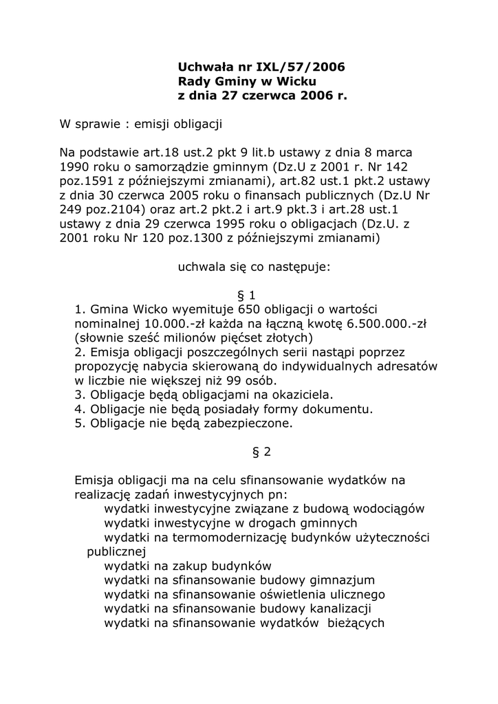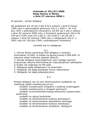 Uchwała nr IXL/57/2006 Rady Gminy w Wicku z dnia 27 czerwca 2006 r. W sprawie : emisji obligacji Na podstawie art.18 ust.2 pkt 9 lit.b ustawy z dnia 8 marca 1990 roku o samorządzie gminnym (Dz.U z 2001 r. Nr 142 poz.1591 z późniejszymi zmianami), art.82 ust.1 pkt.2 ustawy z dnia 30 czerwca 2005 roku o finansach publicznych (Dz.U Nr 249 poz.2104) oraz art.2 pkt.2 i art.9 pkt.3 i art.28 ust.1 ustawy z dnia 29 czerwca 1995 roku o obligacjach (Dz.U. z 2001 roku Nr 120 poz.1300 z późniejszymi zmianami) uchwala się co następuje: §1 1. Gmina Wicko wyemituje 650 obligacji o wartości nominalnej 10.000.-zł każda na łączną kwotę 6.500.000.-zł (słownie sześć milionów pięćset złotych) 2. Emisja obligacji poszczególnych serii nastąpi poprzez propozycję nabycia skierowaną do indywidualnych adresatów w liczbie nie większej niż 99 osób. 3. Obligacje będą obligacjami na okaziciela. 4. Obligacje nie będą posiadały formy dokumentu. 5. Obligacje nie będą zabezpieczone. §2 Emisja obligacji ma na celu sfinansowanie wydatków na realizację zadań inwestycyjnych pn: wydatki inwestycyjne związane z budową wodociągów wydatki inwestycyjne w drogach gminnych wydatki na termomodernizację budynków użyteczności publicznej wydatki na zakup budynków wydatki na sfinansowanie budowy gimnazjum wydatki na sfinansowanie oświetlenia ulicznego wydatki na sfinansowanie budowy kanalizacji wydatki na sfinansowanie wydatków bieżących §3 1.Obligacje zostaną wyemitowane w siedmiu seriach Seria A o wartości 1.000.000.-zł Seria B o wartości 1.000.000.-zł Seria C o wartości 1.000.000.-zł Seria D o wartości 1.000.000.-zł Seria E o wartości 1.000.000.-zł Seria F o wartości 1.000.000.-zł Seria G o wartości 500.000.-zł 2. Emisja obligacji nastąpi w 2006 roku. 3. Cena emisji obligacji będzie równa wartości nominalnej. 4. Wydatki związane z przeprowadzeniem emisji zostaną pokryte z dochodów własnych Gminy Wicko. §4 1.Obligacje zostaną przez Gminę wykupione w następujących terminach obligacje serii A po upływie 3 lat od daty emisji obligacje serii B po upływie 4 lat od daty emisji obligacje serii C po upływie 5 lat od daty emisji obligacje serii D po upływie 6 lat od daty emisji obligacje serii E po upływie 7 lat od daty emisji obligacje serii F po upływie 8 lat od daty emisji obligacje serii G po upływie 9 lat od daty emisji 2. Obligacje zostaną wykupione według ich wartości nominalnej. 3. Jeżeli data wykupu obligacji określona w ust.1 przypadnie na sobotę lub dzień ustawowo wolny od pracy, wykup nastąpi w najbliższym dniu roboczym. 4. Dopuszcza się nabycie przez Gminę Wicko obligacji przed terminem wykupu w celu umorzenia. 5. Termin i tryb umorzenia określi Wójt Gminy Wicko. §5 1. Oprocentowanie obligacji nalicza się od wartości nominalnej i wypłaca w okresach rocznych liczonych od daty emisji . 2. Oprocentowanie obligacji będzie zmienne, równe średniej arytmetycznej z opublikowanych średnich ważonych stóp rentowności 52-tygodniowych bonów skarbowych z dwóch ostatnich przetargów poprzedzających rozpoczęcie każdego okresu odsetkowego, powiększonej o marżę banku dla inwestora nie wyższą niż 1,00 %. 3. Oprocentowanie wypłaca się w następnym dniu po upływie okresu odsetkowego. 4. jeżeli termin wypłaty oprocentowania określony w ust.3 przypadnie na sobotę lub dzień ustawowo wolny od pracy, wypłata oprocentowania nastąpi w najbliższym dniu roboczym. 5. Obligacje nie będą oprocentowane poczynając od dnia wykupu. §6 Wydatki związane z wykupem obligacji i wypłatą odsetek zostaną pokryte z dochodów Gminy Wicko pochodzących z podatków i opłat lokalnych oraz udziałów w podatkach stanowiących dochód budżetu państwa w latach 2006-2015. §7 Upoważnia się Wójta Gminy do: 1)dokonywania wszelkich czynności związanych z przygotowaniem i przeprowadzeniem emisji obligacji. 2) zawarcia umowy z bankiem, któremu zostaną powierzone czynności związane ze zbywaniem, gwarantowaniem i wykupem obligacji oraz wypłatą oprocentowania. 3) wypełniania świadczeń wynikających z obligacji. §8 Wykonanie uchwały powierza się Wójtowi Gminy Wicko. §9 Uchwała wchodzi w życie z dniem podjęcia.