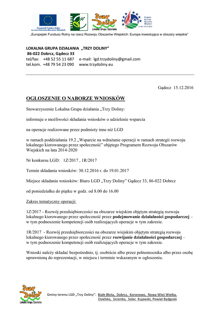 „Europejski Fundusz Rolny na rzecz Rozwoju Obszarów Wiejskich: Europa inwestująca w obszary wiejskie” LOKALNA GRUPA DZIAŁANIA „TRZY DOLINY” 86-022 Dobrcz, Gądecz 33 tel/fax: +48 52 55 11 687 e-mail: [email protected] tel.kom. +48 79 54 23 090 www.trzydoliny.eu Gądecz 15.12.2016 OGŁOSZENIE O NABORZE WNIOSKÓW Stowarzyszenie Lokalna Grupa działania „Trzy Doliny: informuje o możliwości składania wniosków o udzielenie wsparcia na operacje realizowane przez podmioty inne niż LGD w ramach poddziałania 19.2 „Wsparcie na wdrażanie operacji w ramach strategii rozwoju lokalnego kierowanego przez społeczność” objętego Programem Rozwoju Obszarów Wiejskich na lata 2014-2020 Nr konkursu LGD: 1Z/2017 , 1R/2017 Termin składania wniosków: 30.12.2016 r. do 19.01.2017 Miejsce składania wniosków: Biuro LGD „Trzy Doliny” Gądecz 33, 86-022 Dobrcz od poniedziałku do piątku w godz. od 8.00 do 16.00 Zakres tematyczny operacji: 1Z/2017 - Rozwój przedsiębiorczości na obszarze wiejskim objętym strategią rozwoju lokalnego kierowanego przez społeczność przez podejmowanie działalności gospodarczej – w tym podnoszenie kompetencji osób realizujących operacje w tym zakresie. 1R/2017 - Rozwój przedsiębiorczości na obszarze wiejskim objętym strategią rozwoju lokalnego kierowanego przez społeczność przez rozwijanie działalności gospodarczej – w tym podnoszenie kompetencji osób realizujących operacje w tym zakresie. Wnioski należy składać bezpośrednio, tj. osobiście albo przez pełnomocnika albo przez osobę uprawnioną do reprezentacji, w miejscu i terminie wskazanym w ogłoszeniu. Gminy terenu LGD „Trzy Doliny”: Białe Błota, Dobrcz, Koronowo, Nowa Wieś Wielka, Osielsko, Sicienko, Solec Kujawski, Powiat Bydgoski „Europejski Fundusz Rolny na rzecz Rozwoju Obszarów Wiejskich: Europa inwestująca w obszary wiejskie” LOKALNA GRUPA DZIAŁANIA „TRZY DOLINY” 86-022 Dobrcz, Gądecz 33 tel/fax: +48 52 55 11 687 e-mail: [email protected] tel.kom. +48 79 54 23 090 www.trzydoliny.eu ----------------------------------------------------------------------------------------------------------------Tryb składania wniosków: Wnioski wraz z załącznikami należy składać na odpowiednich formularzach w 1 egzemplarzu w wersji papierowej oraz wniosek w formie dokumentu elektronicznego zapisany na informatycznym nośniku danych. Szczegółowe informacje udzielane są dodatkowo w Biurze LGD „Trzy Doliny” Kontakt Biuro LGD „Trzy Doliny” Gądecz 33, 86-022 Dobrcz Czynne: Pn – Pt w godzinach 8:00 do 16:00 Mail - [email protected] Strona - www.trzydoliny.eu - zakładka ,, Planowane nabory” tel. (52) 55 11 687 fax. (52) 55 11 687 kom. 795 423 090 Gminy terenu LGD „Trzy Doliny”: Białe Błota, Dobrcz, Koronowo, Nowa Wieś Wielka, Osielsko, Sicienko, Solec Kujawski, Powiat Bydgoski